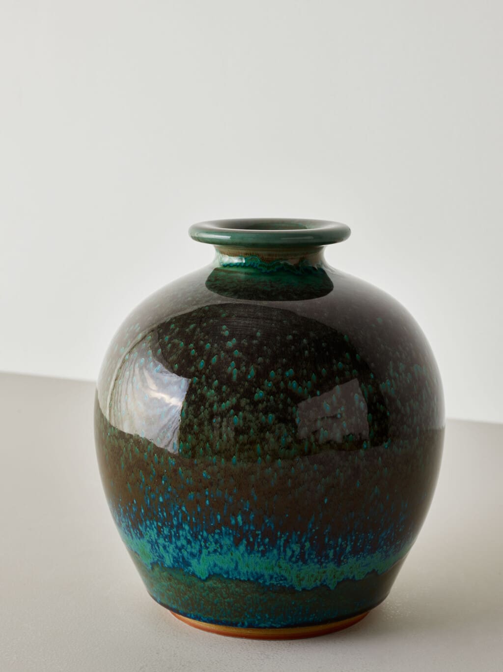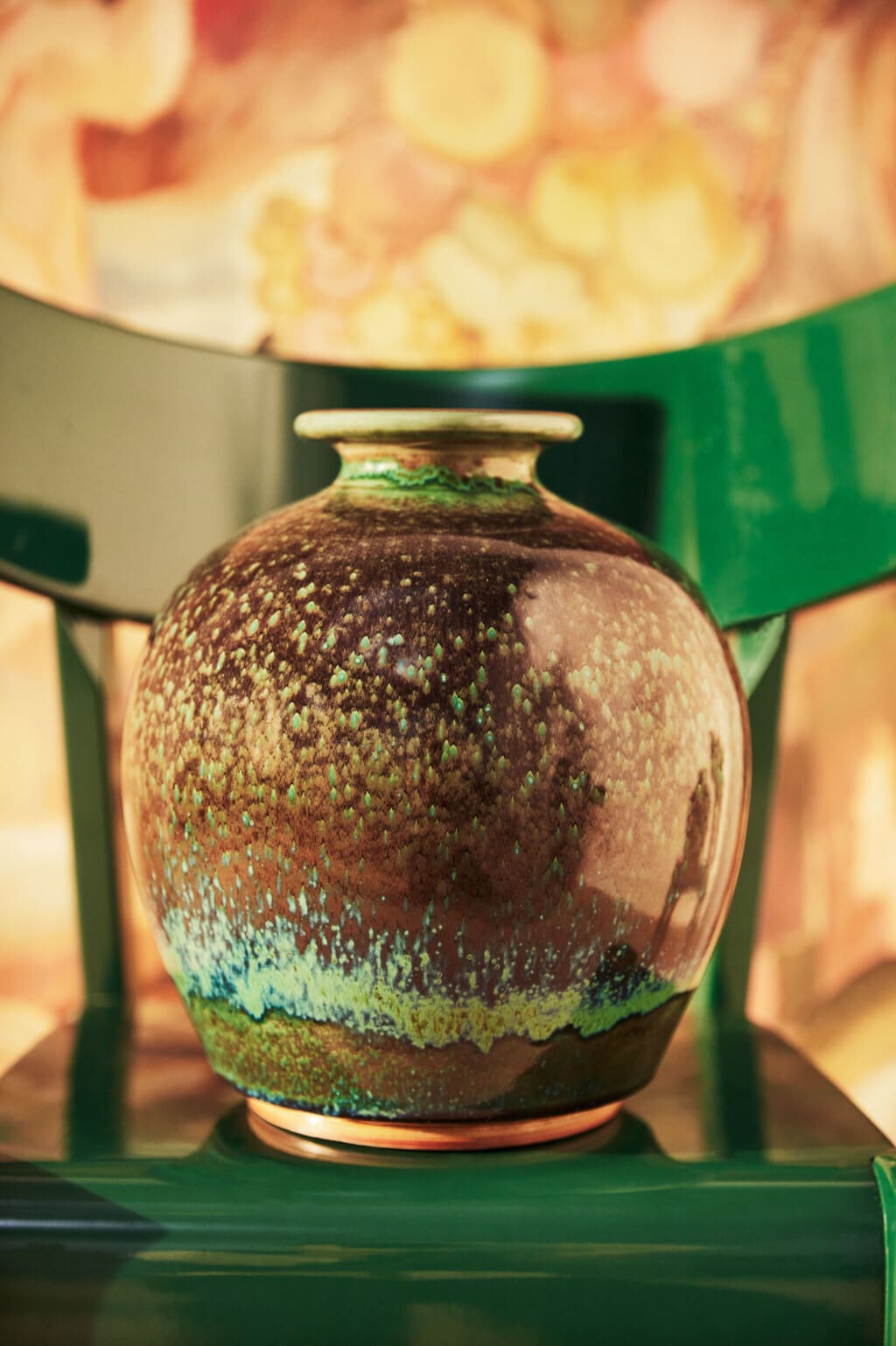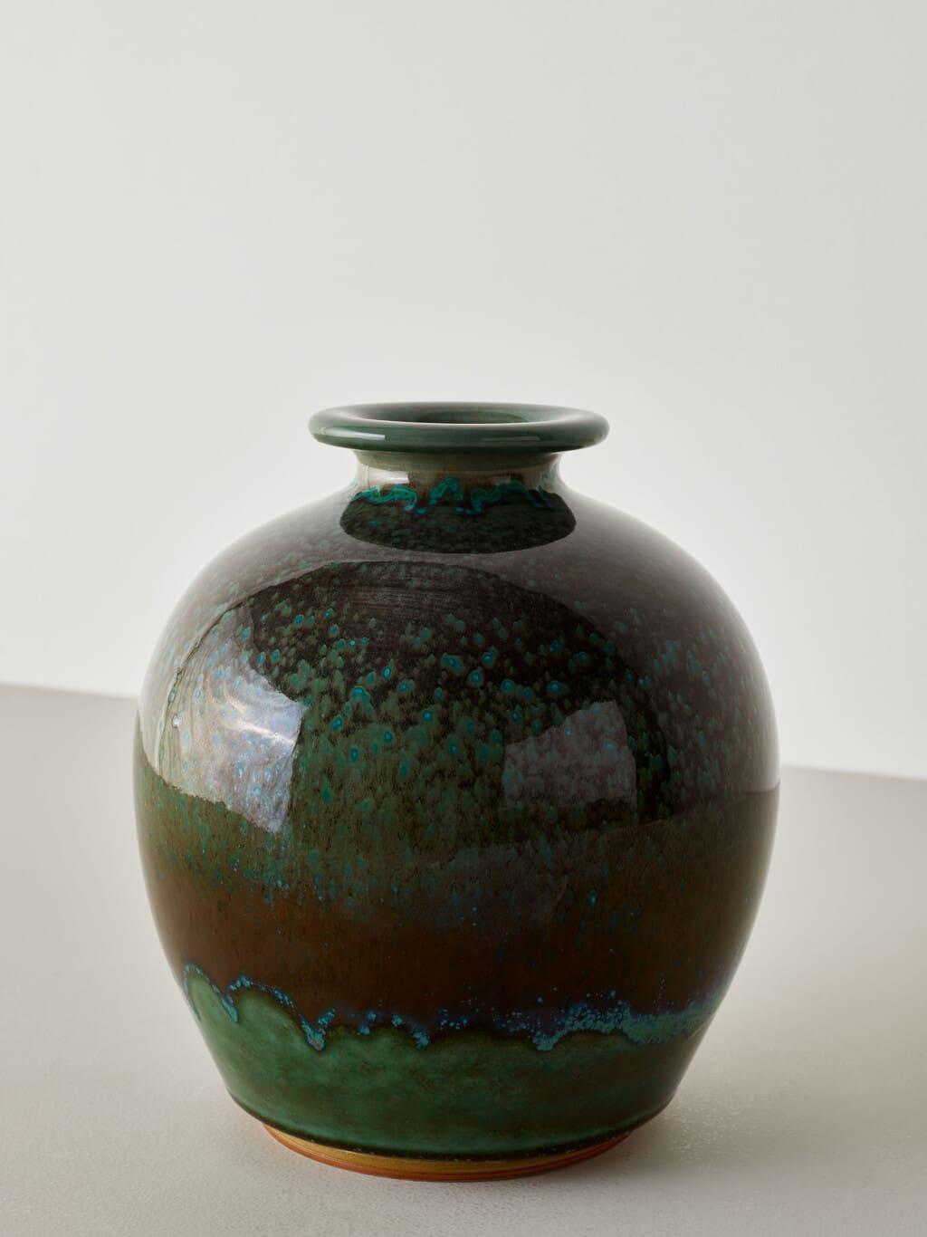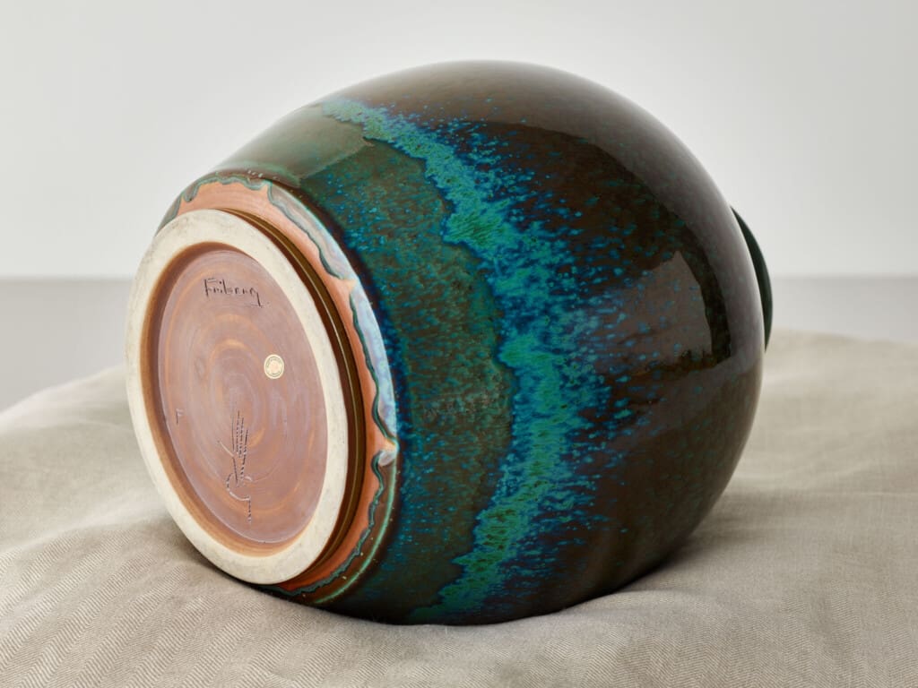 This Berndt Friberg vase from Gustavsberg’s studio, Sweden in 1964 showcases a deep, lustrous glaze, which transitions subtly in color from rich, earthy tones to a muted, smoky grayish green near the top. Friberg’s choice of a hare’s fur glaze—a technique he perfected—creates a textured, almost velvety appearance that invites closer inspection. The glaze’s finely layered colors emphasize the vase’s sleek silhouette, with the deep brown base shifting gracefully into softer hues. This controlled yet organic color gradient highlights Friberg’s skill in combining traditional Japanese-inspired techniques with Scandinavian minimalism, resulting in a piece that feels both serene and striking.
