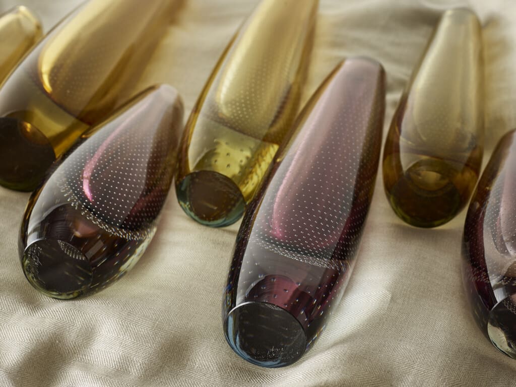 A group of eight glass vases, five yellow and three purple with controlled bubbles designed by Swedish-Finnish Glass artist Gunnel Nyman for Nuutajärvi-Notsjö in Finland during the 1940’s. Finland. Albeit her career was cut short due to illness, Gunnel Nyman (1909-48) was one of the founders of modern glass design in Finland. She began as a furniture designer in the 1930s but quickly became facinated by glass during that decade. Internal bubbles are inherent in glass production and the blower often seeks to eliminate them. Instead, Nyman made a virtue of such bubbles and used then in a deliberate way to enhance her subtle shapes. In her short life she produced a dozen of so designs in the 1940s like this one that have gone on to become some of the greatest and most iconic pieces of Finnish glass. This group comprises different sizes and two colours to create a perfectly balanced collection to enhance your home.
