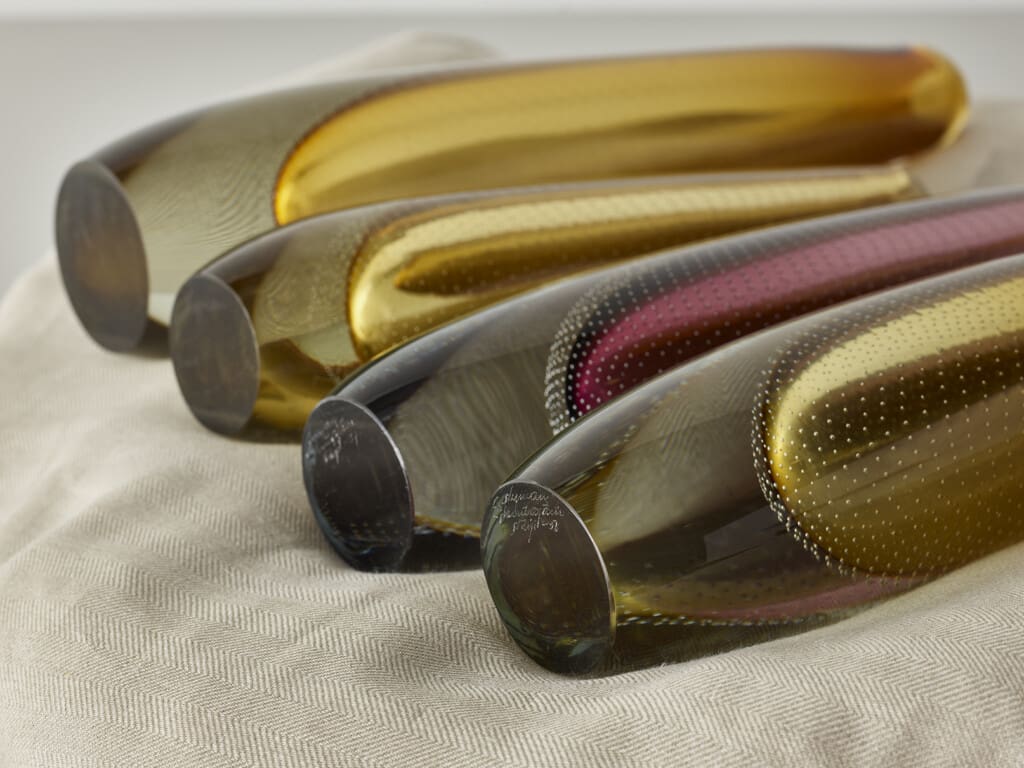 Gunnel Nyman (1909-48) was one of the founders of modern glass design in Finland. She began as a furniture designer in the 1930s but quickly became facinated by glass during that decade. Internal bubbles are inherent in glass production and the blower often seeks to eliminate them. Instead, Nyman made a virtue of such bubbles and used then in a deliberate way to enhance her subtle shapes. In her short life she produced a dozen of so designs in the 1940s like this one that have gone on to become some of the greatest and most iconic pieces of Finnish glass. Her work is held in museums worldwide.