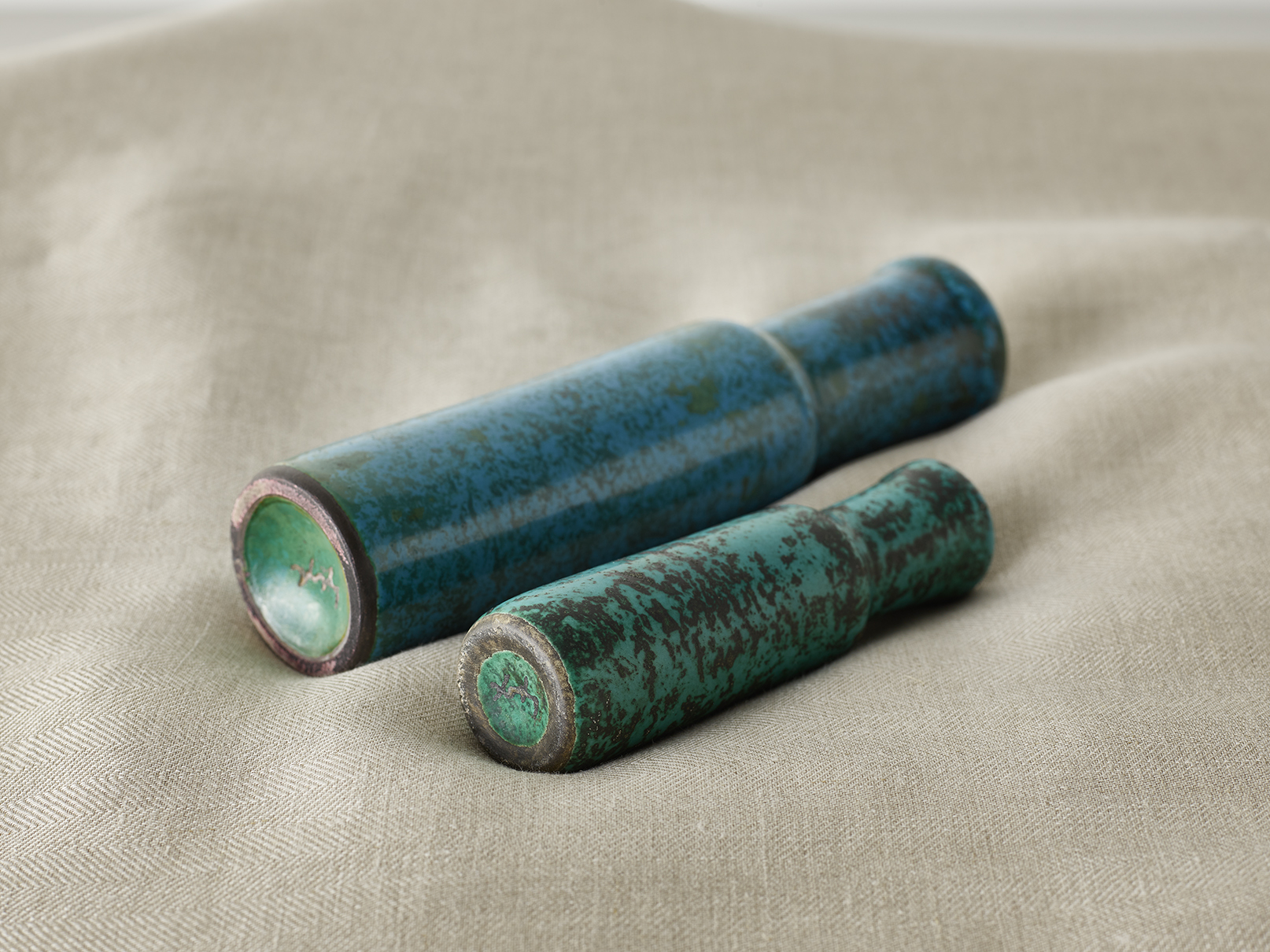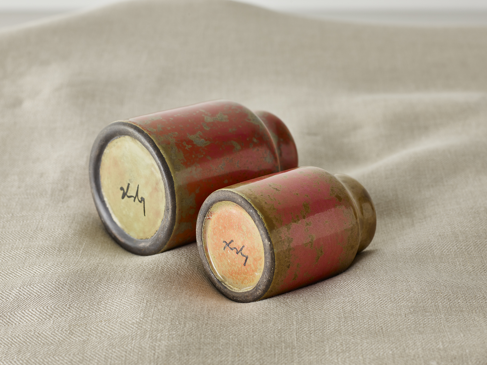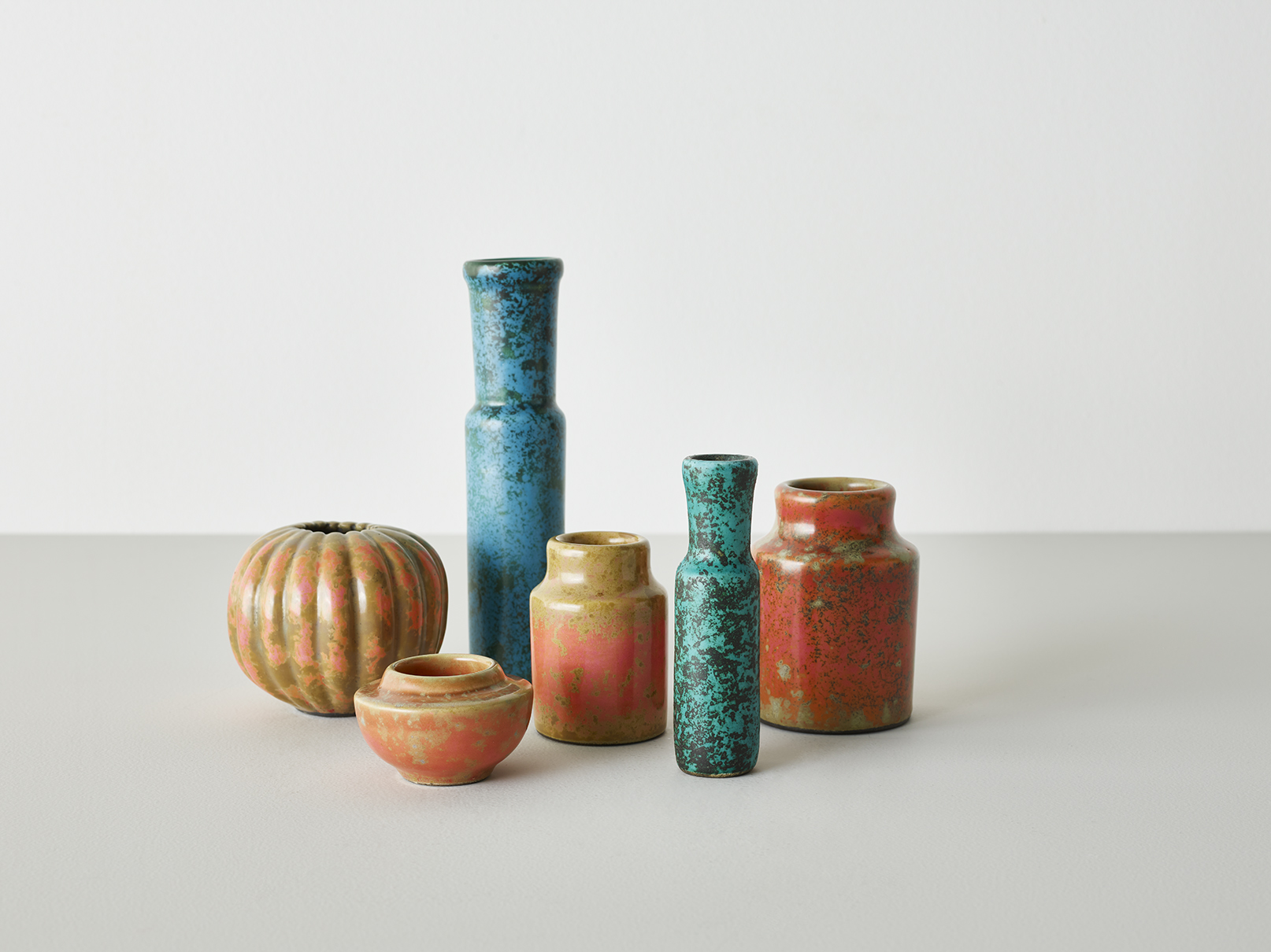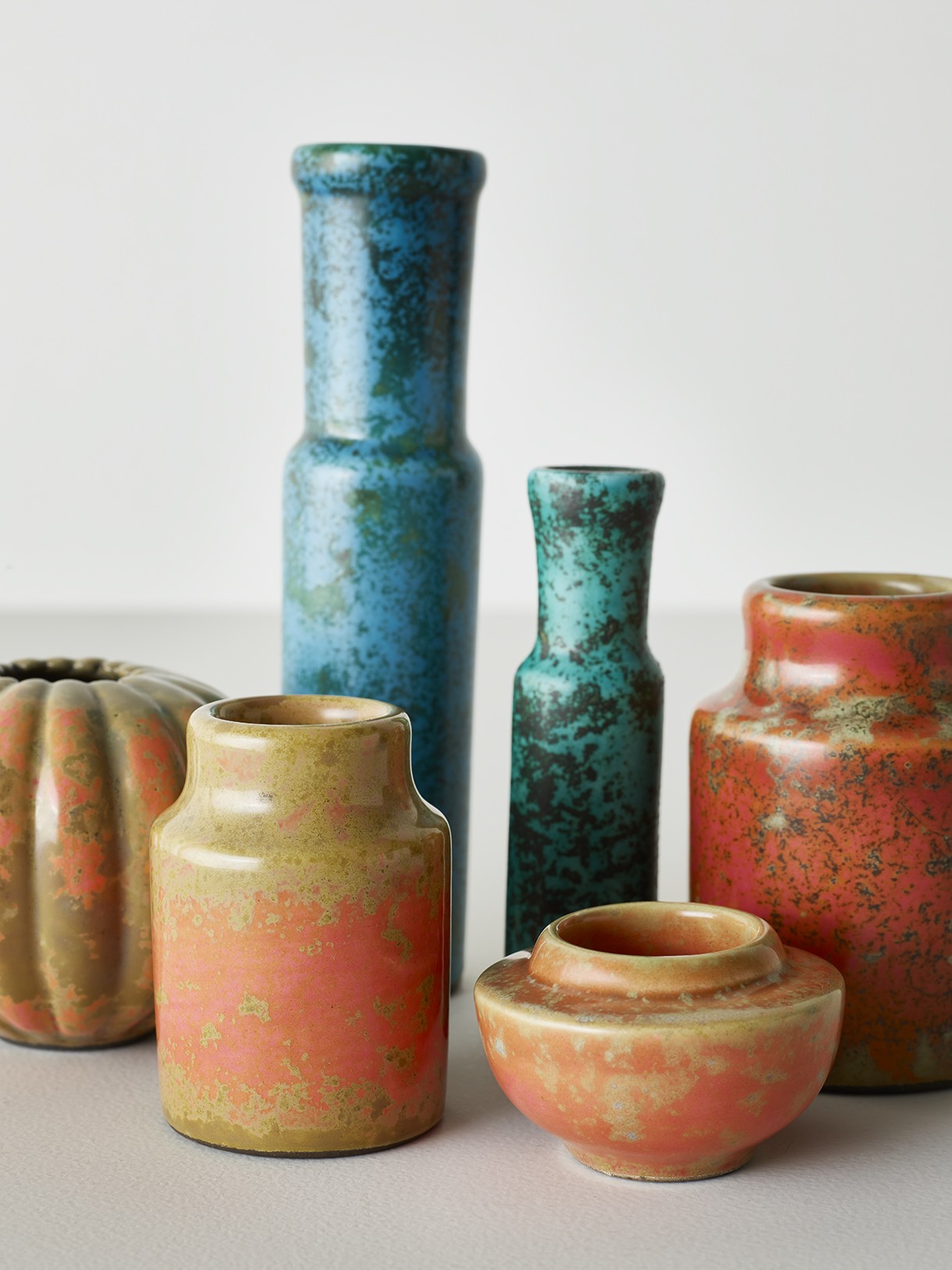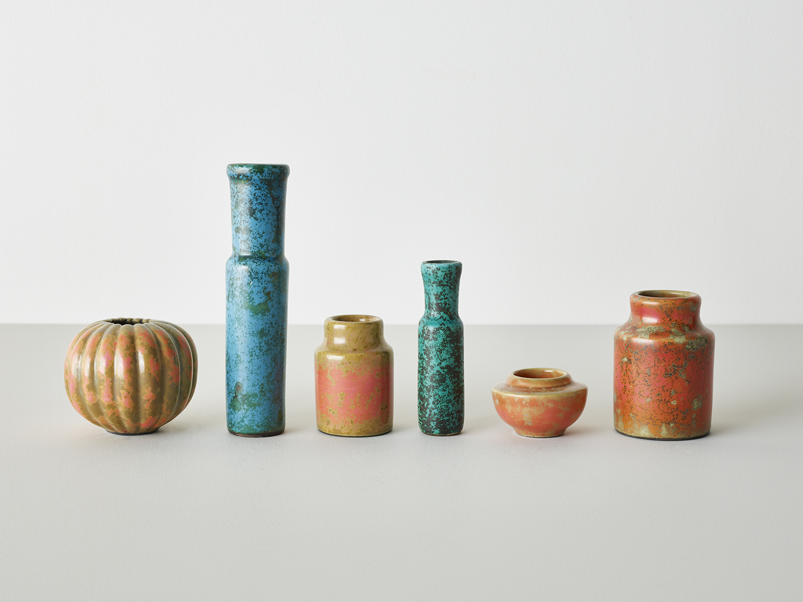 A group of six vases made in high-fired faience or stoneware faiance by Hans Hedberg in Biot, France. The heights of the vases vary between 9 cm and 21 cm. Hans Hedberg (1917-2007) was a Swedish ceramic artist renowned for his mastery of stoneware faience. His work was characterized by vibrant, large-scale ceramic sculptures, often resembling oversized fruits. Hedberg combined traditional ceramic techniques with innovative glazing methods, resulting in durable, high-fired stoneware pieces with a faience-like finish. His artistry bridged the gap between functional pottery and sculptural art, making him a significant figure in the world of ceramics.