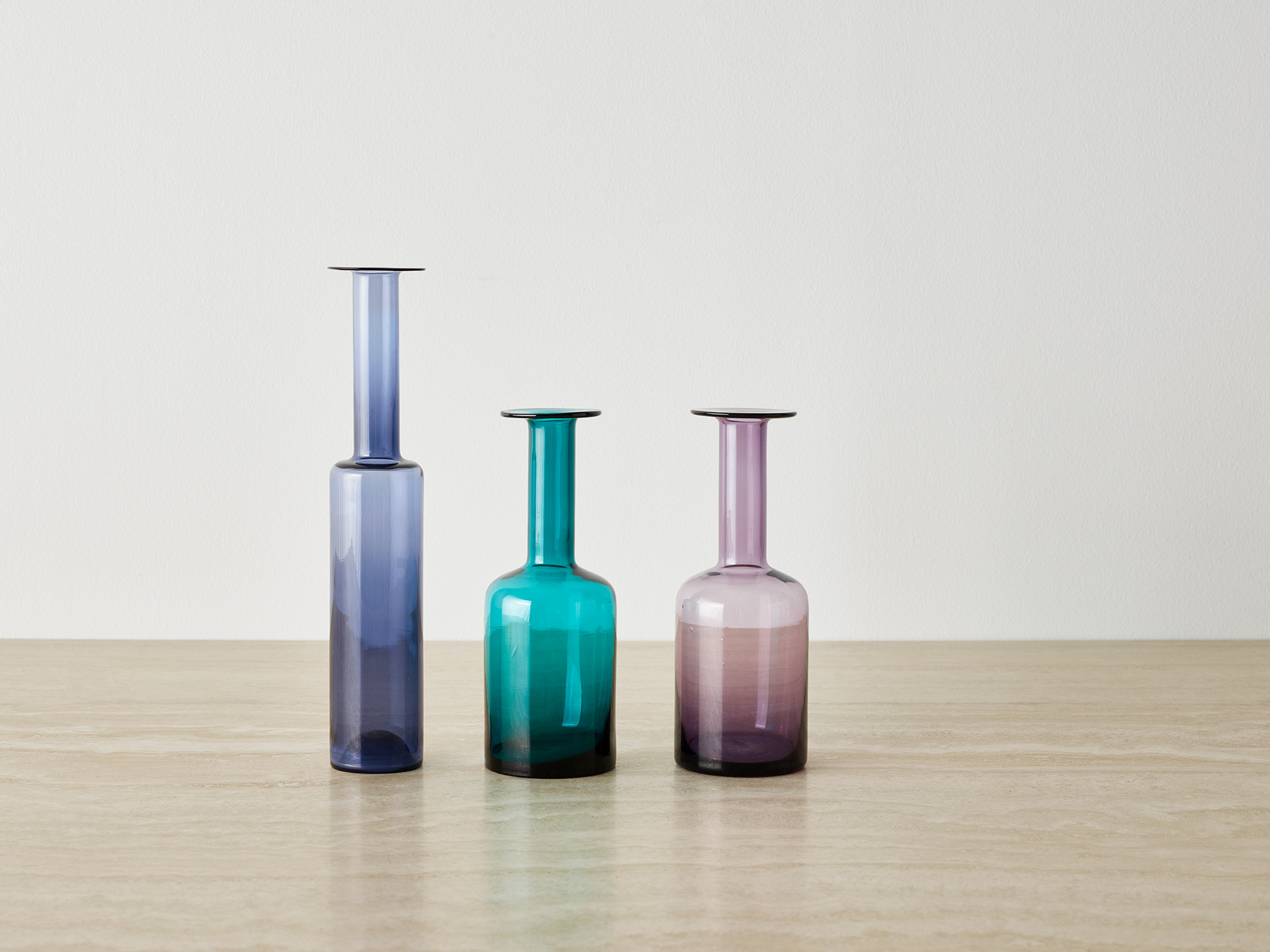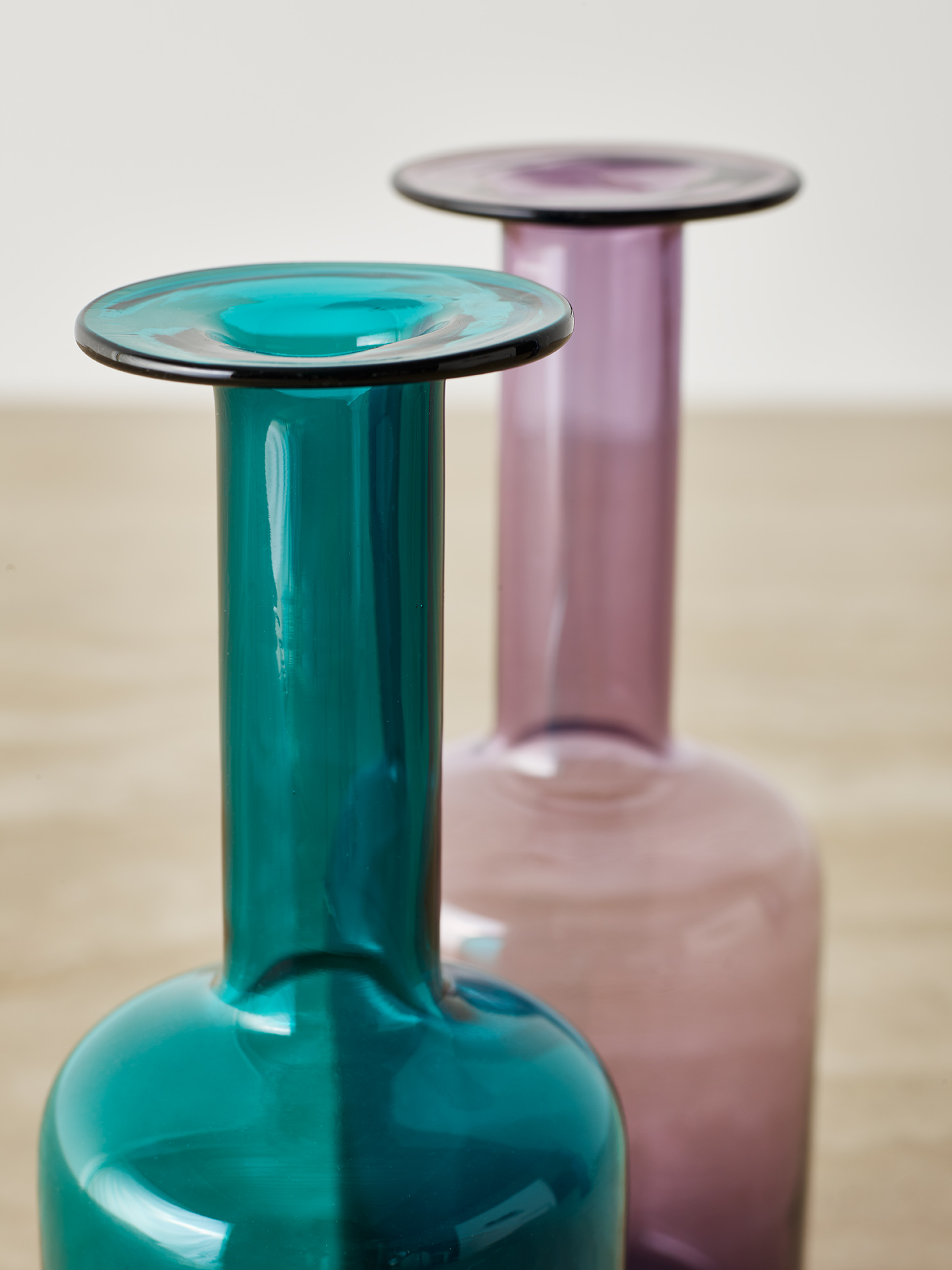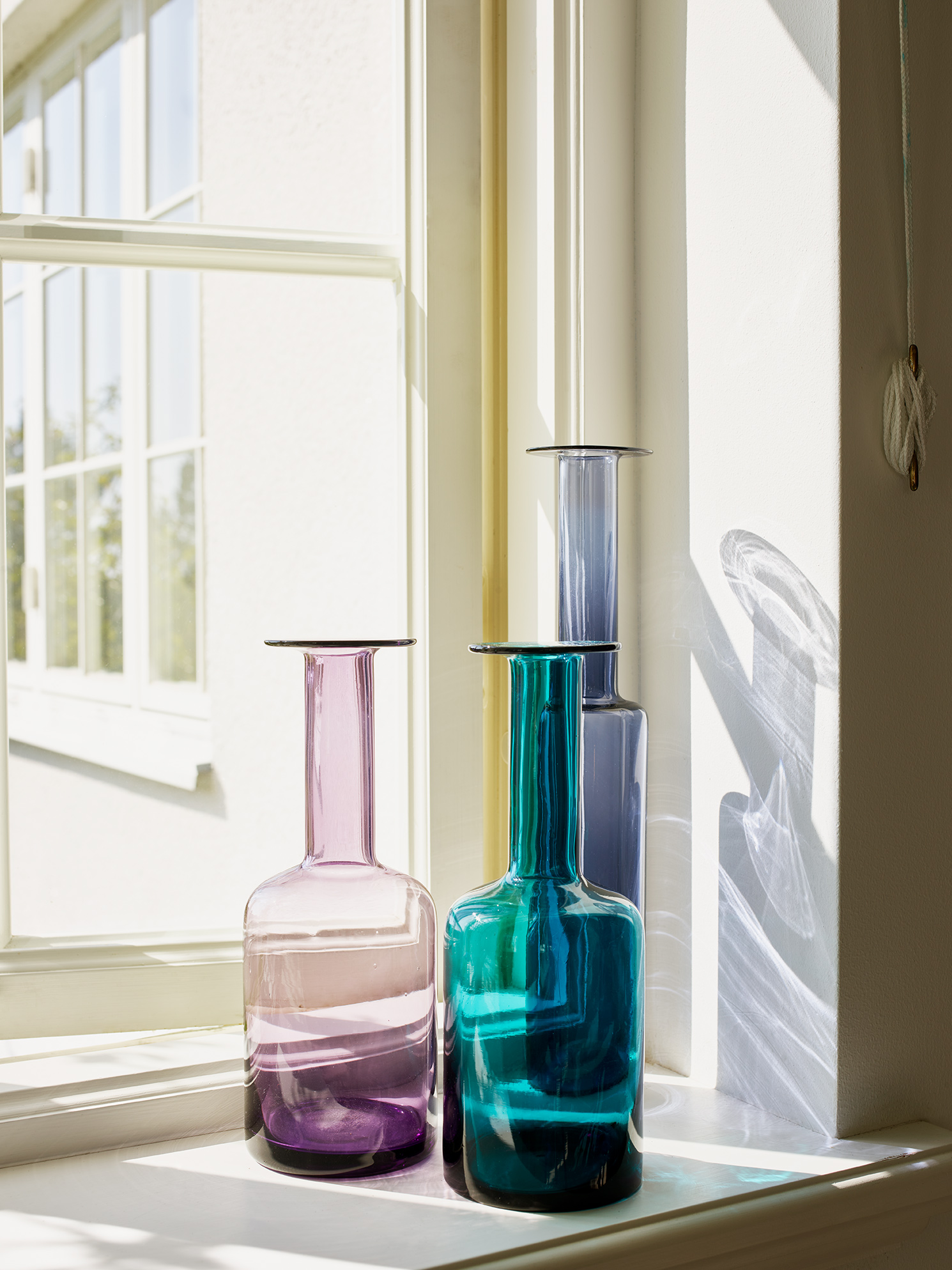 A group with a combination of Nanny Still and Holmegaards glassbottles in beautiful colours.