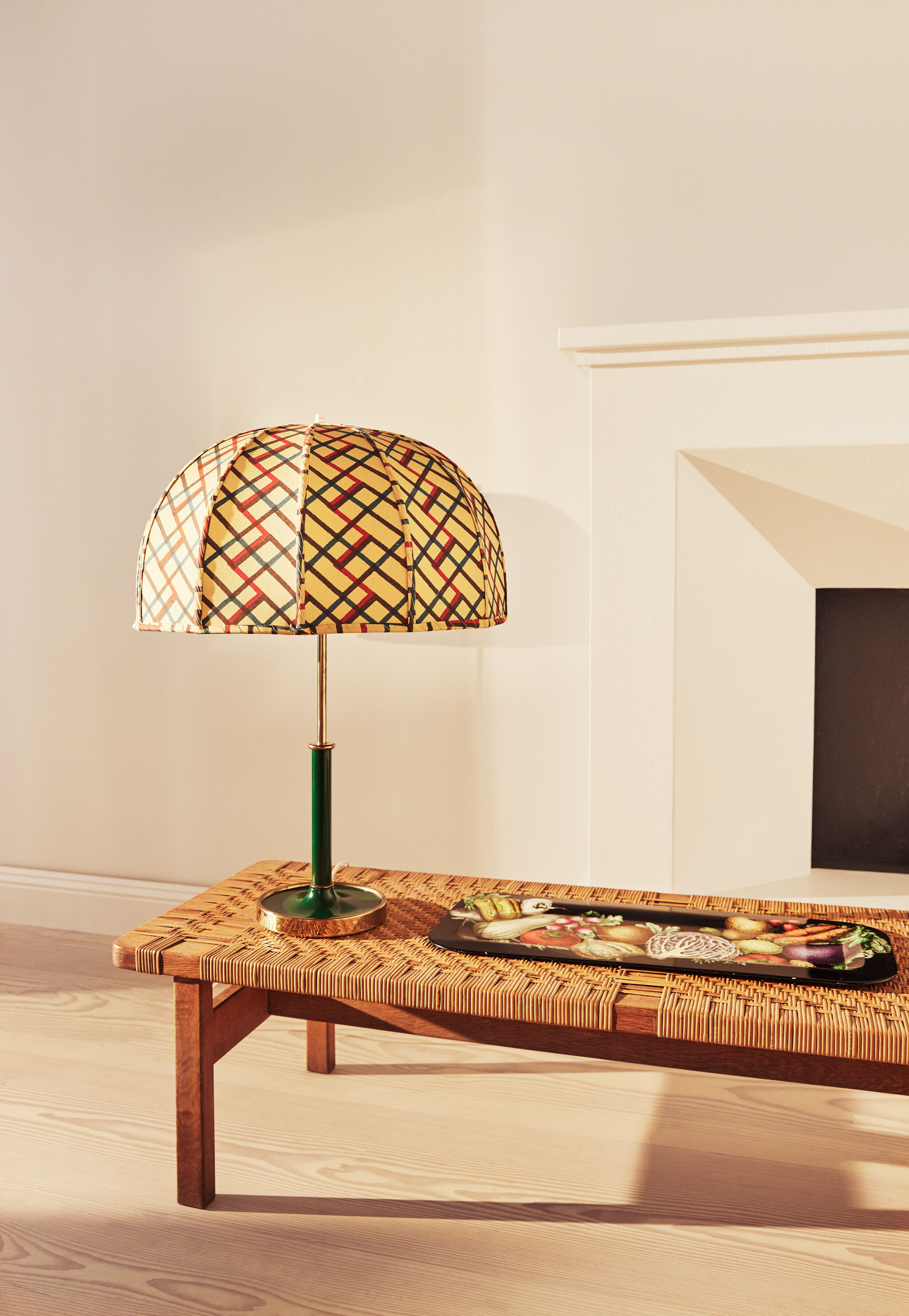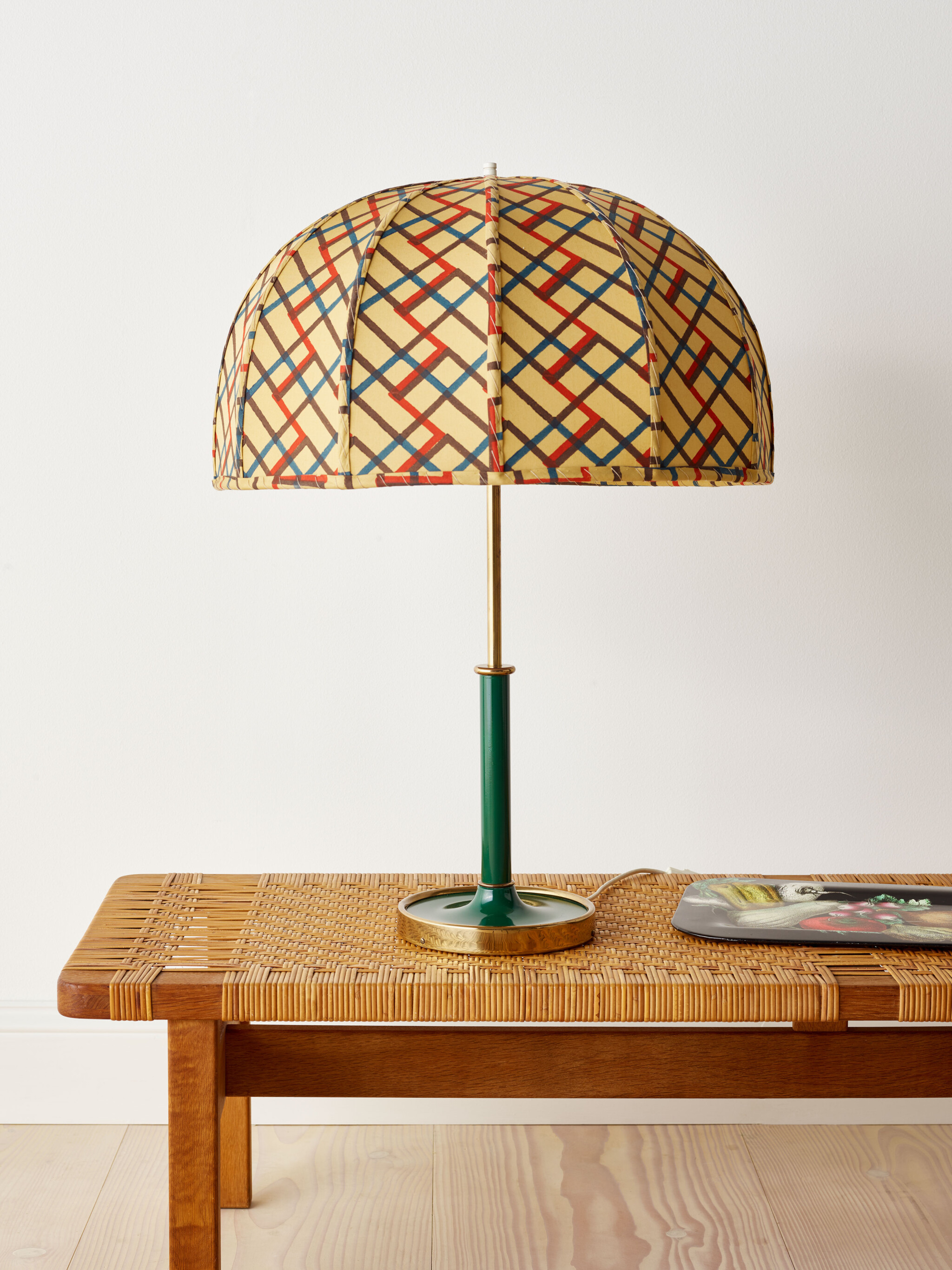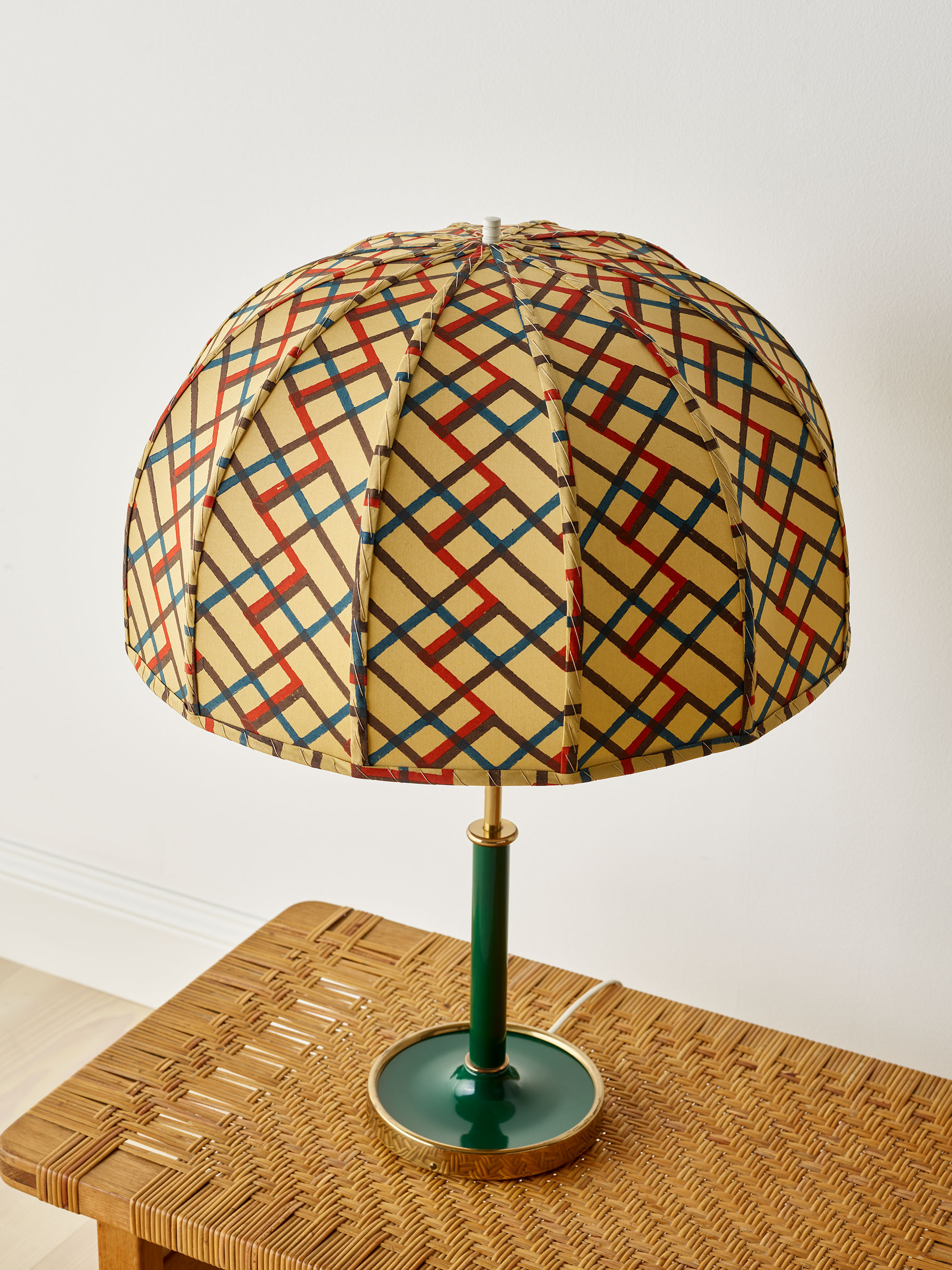 This Josef Frank table lamp, model number 2466, created for Svenskt Tenn, is a beautiful example of his unique blend of functional design and playful aesthetics. The addition of an eye-popping Muriel Brandolini fabric to the lamp that feautres a brass base partially lacquered in green, adds a subtle pop of color and creating an elegant contrast with the brass elements. This combination of polished brass and green lacquer enhances the lamp’s sophisticated yet lively character, typical of Frank’s designs. Known for his vibrant and organic approach, Frank designed pieces that feel timeless and are perfectly suited for adding both light and artistic flair to any interior.