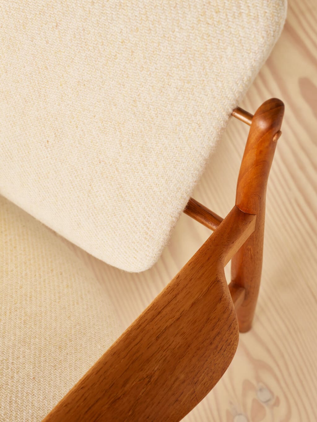 This pair of teak lounge chairs with a fabric seat and “floating” back upholstered in a winter white fabric is one of the most technical and sophisticated of Finn Juhl’s designs. These chairs with clear reference to his earlier work with cabinet maker Niels Vodder were given the name “Model 136” and were designed in 1956 and manufactured in the 1960s by France & Søn, and they have maker’s metal plaque to prove this. Finn Juhl is considered to be one of the most influential Danish Modern furniture designers and in our view, this is one of the most attractive of his lounge chairs with a very bold and timeless design featuring a sculpted solid teak frame with equally sculpted seat cushions that appear to float above the frame on brass supports.
