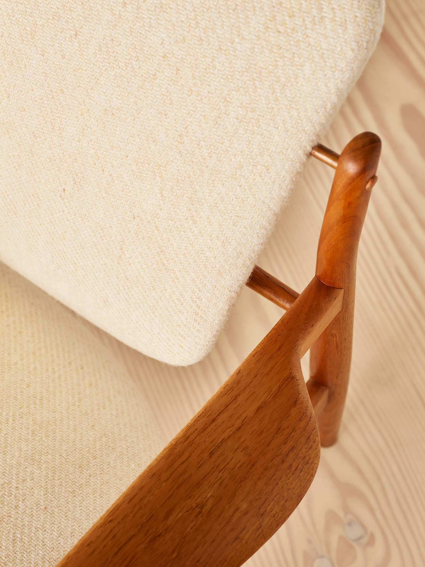 This pair of teak lounge chairs with a fabric seat and “floating” back upholstered in a winter white fabric is one of the most technical and sophisticated of Finn Juhl’s designs. These chairs with clear reference to his earlier work with cabinet maker Niels Vodder were given the name “Model 136” and were designed in 1956 and manufactured in the 1960s by France & Søn, and they have maker’s metal plaque to prove this. Finn Juhl is considered to be one of the most influential Danish Modern furniture designers and in our view, this is one of the most attractive of his lounge chairs with a very bold and timeless design featuring a sculpted solid teak frame with equally sculpted seat cushions that appear to float above the frame on brass supports.