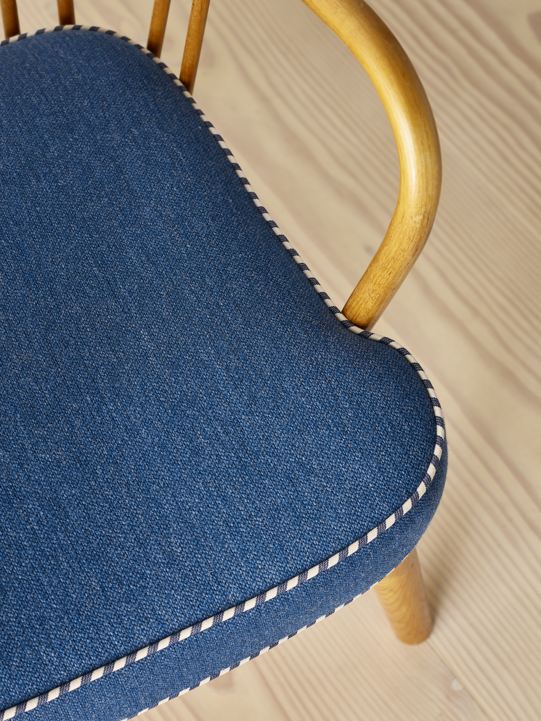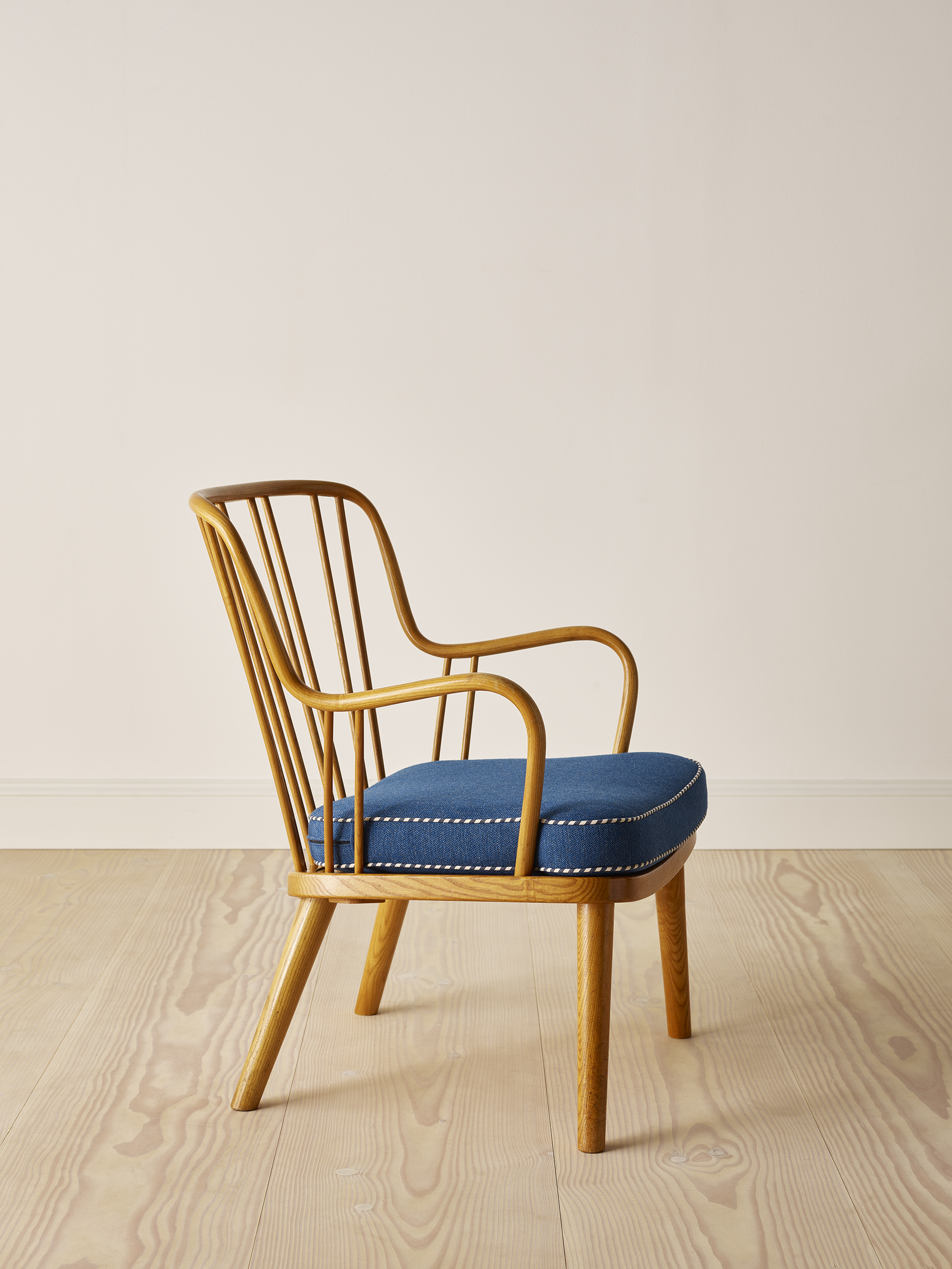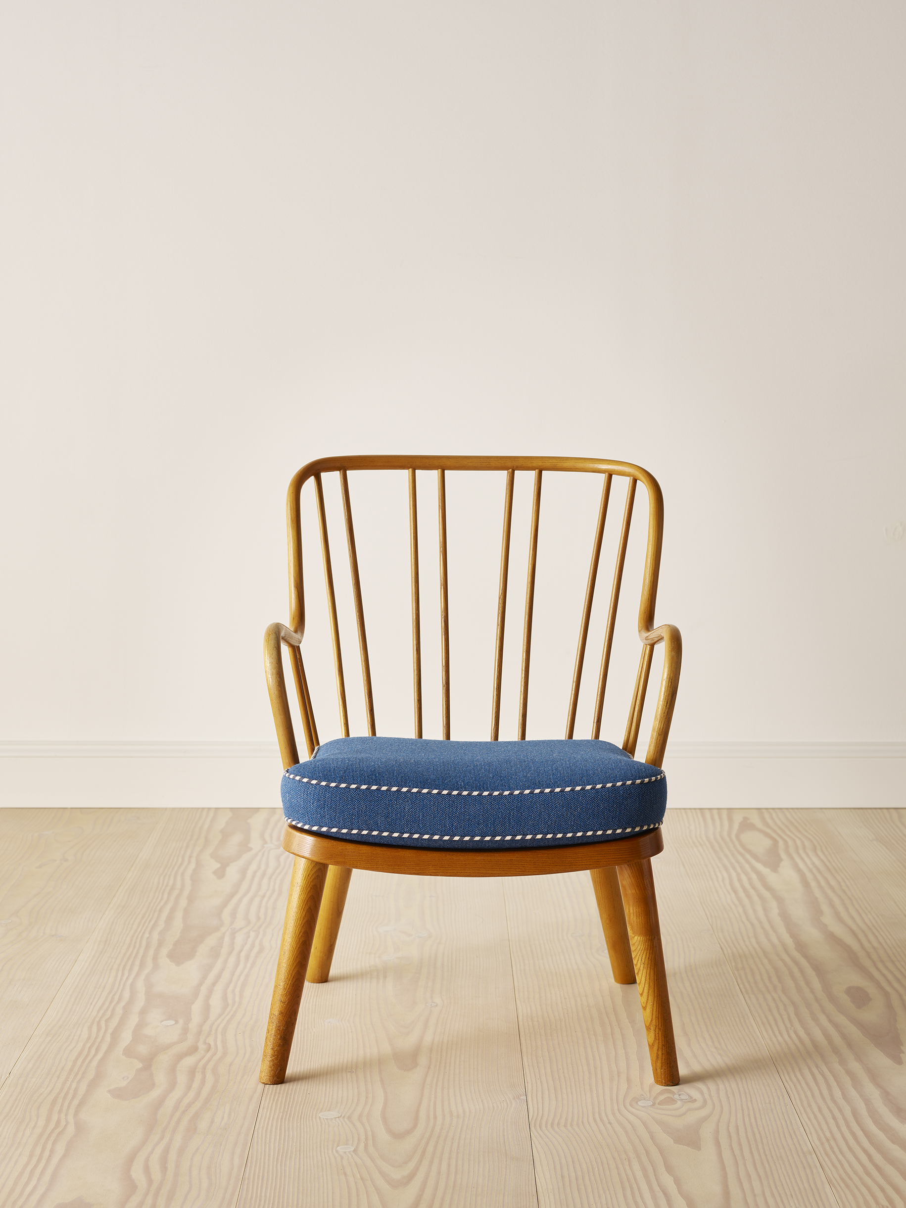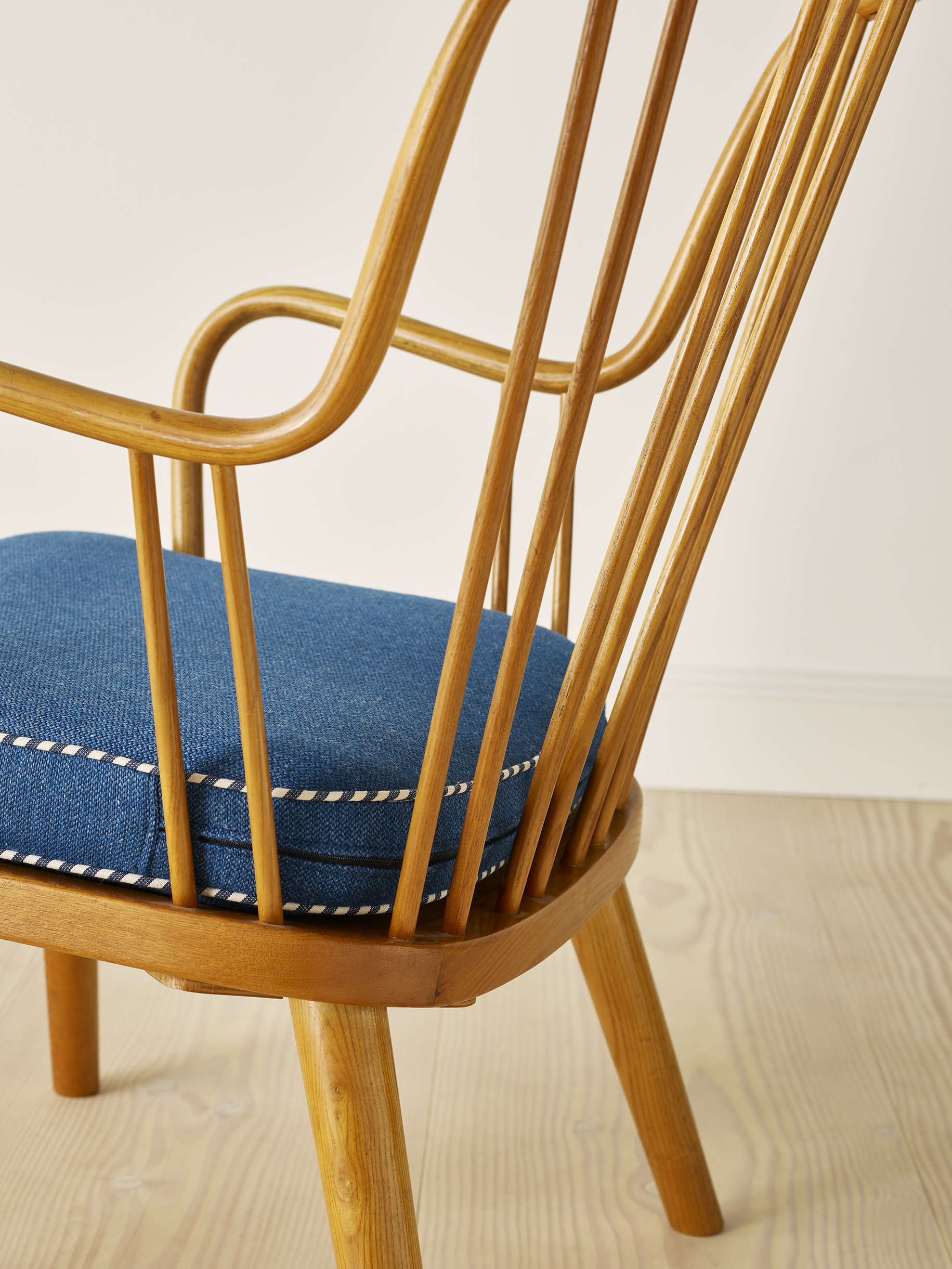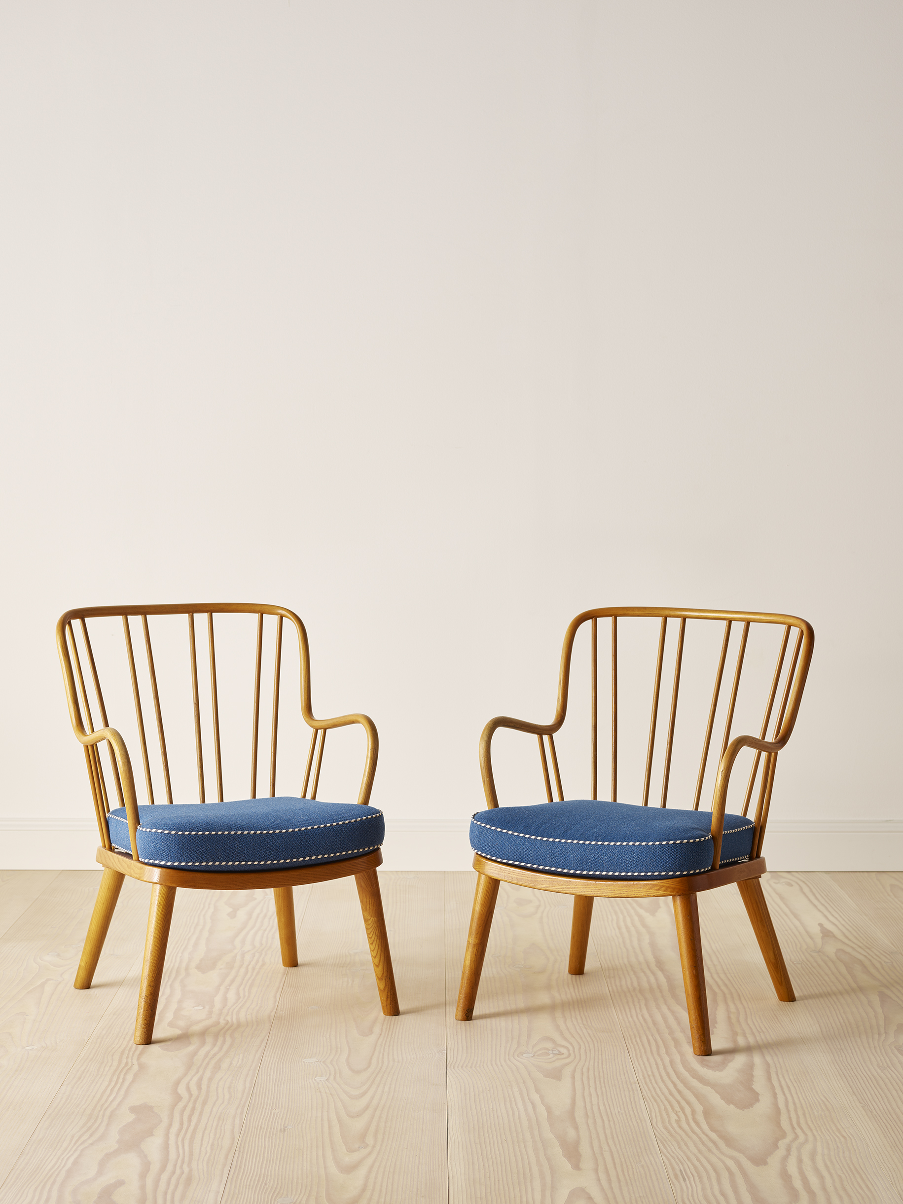 A pair of easy chairs in elm wood with removable cushions upholstered in an attractive blue fabric with blue & white striped piping. This particular model of chair is light and playful and is entitled “Model 1774” and was designed by Aage Herman Olsen in 1945 and manufactured and stamped by Fritz Hansen in 1948.