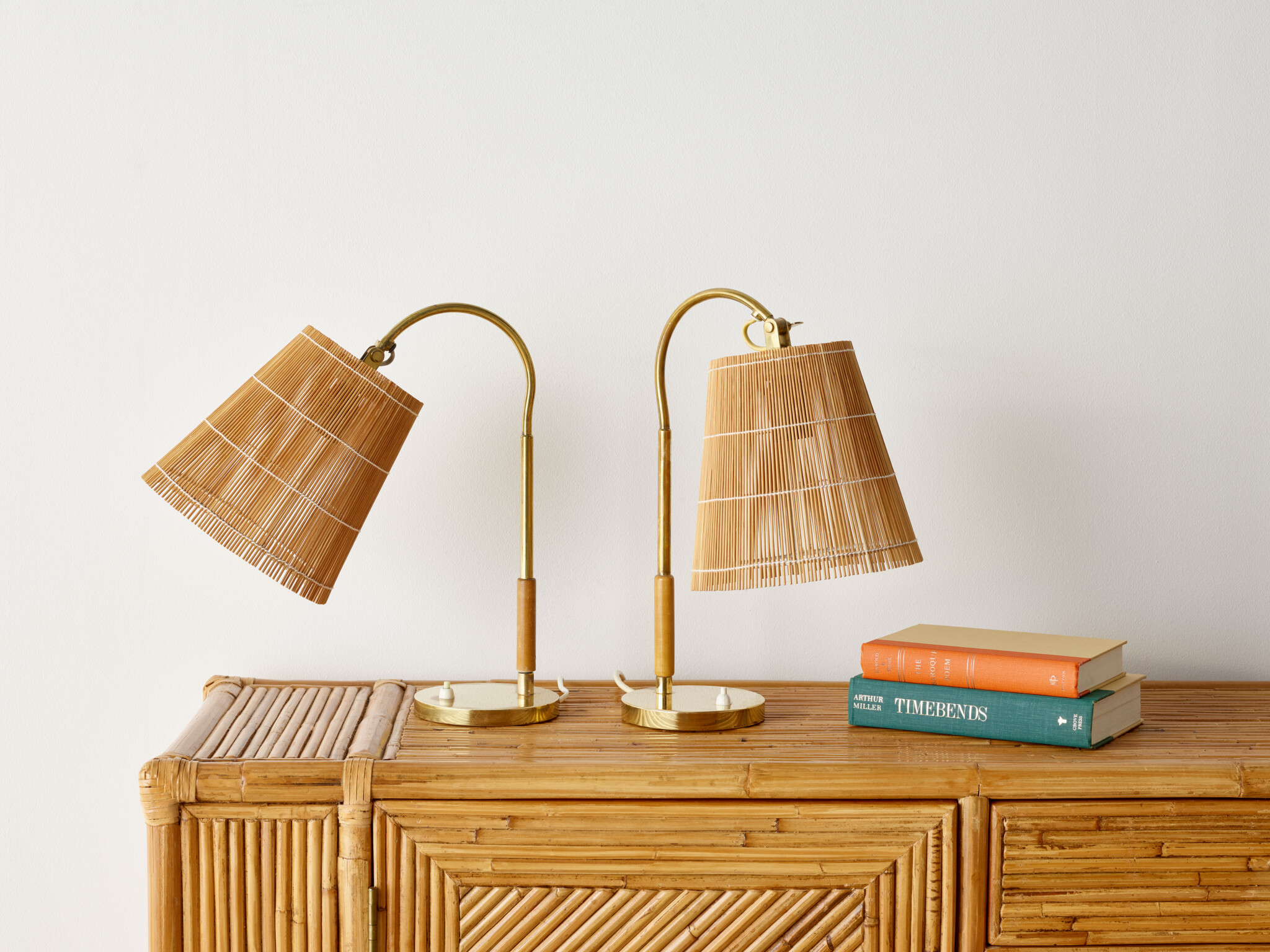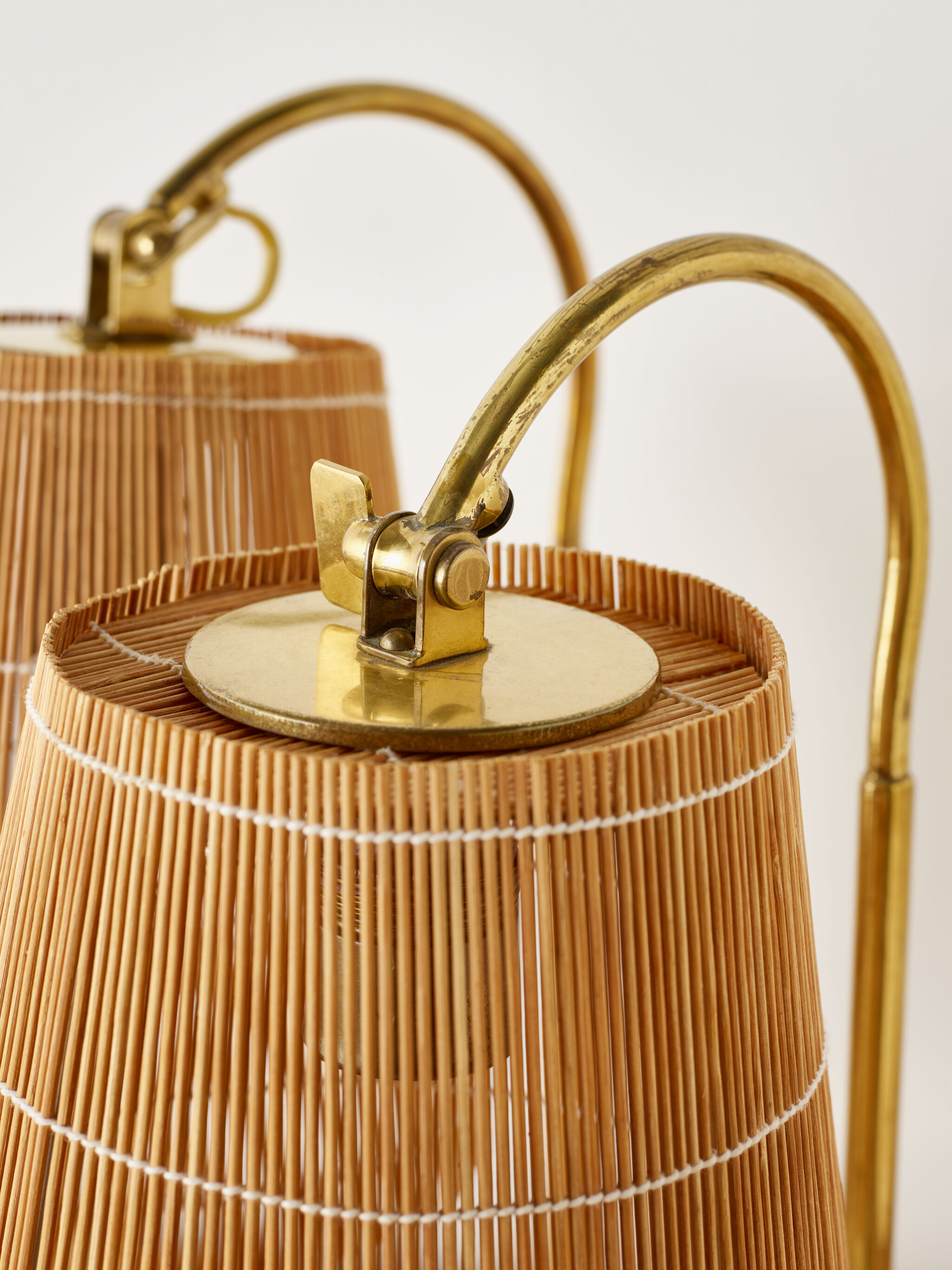 A pair of rattan cane and brass table lights by Paavo Tynell