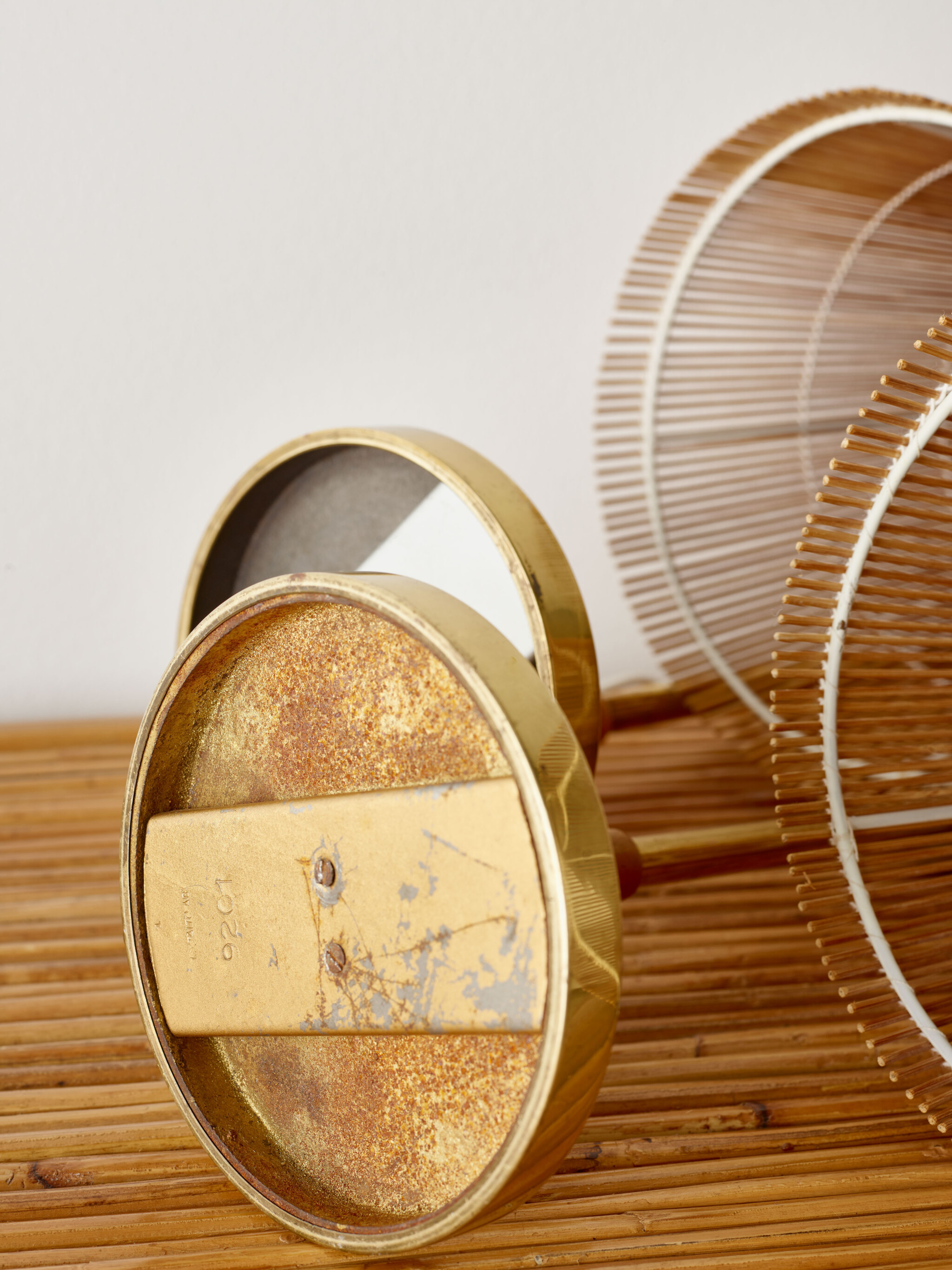 These table lamps, designed by the renowned Finnish lighting designer Paavo Tynell for Taito Oy, exemplify his distinctive blend of natural materials and refined craftsmanship. The polished brass bases and stems radiate a warm, luxurious glow that beautifully complements the woven rattan or cane shades. The shades allow light to gently diffuse through the gaps, creating a soft, ambient glow and showcasing Tynell’s skill in balancing elegance with functionality. Known for his ability to fuse Scandinavian minimalism with organic forms, Tynell’s work has left a lasting impact on modern lighting design, making pieces like these highly sought after by collectors worldwide.