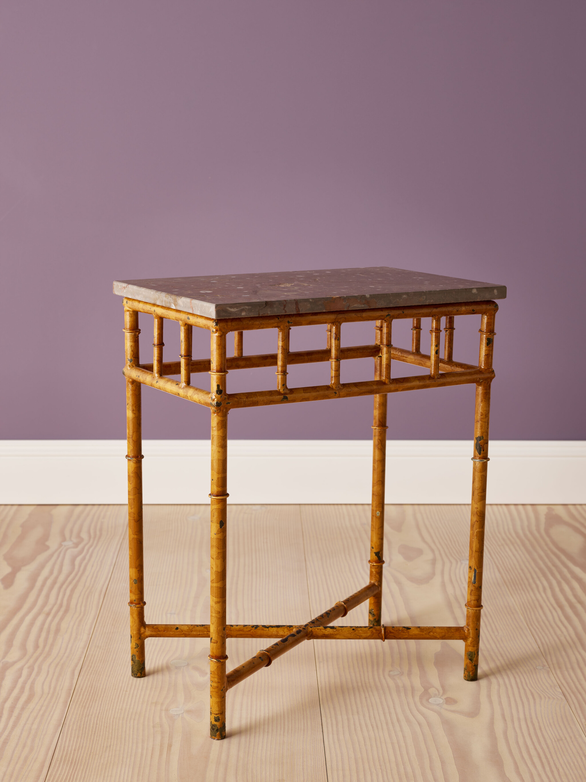 A Pair of side tables in bamboo imitation, painted iron & marble tops
