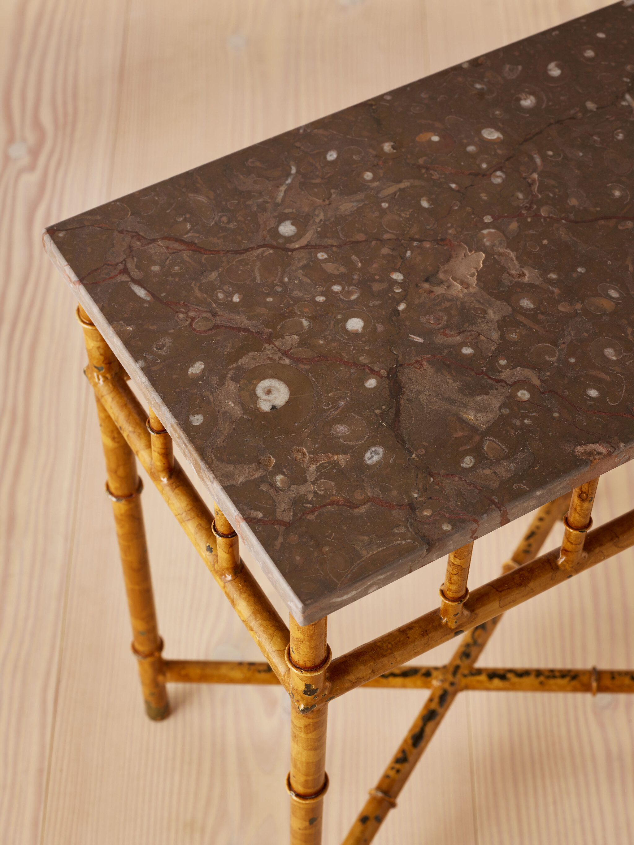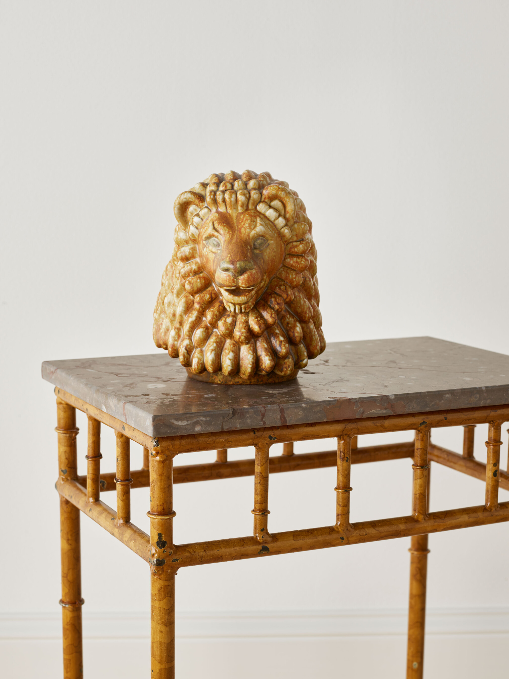 A pair of 19th-century side tables designed in the faux bamboo style, a popular trend during that era. Each table features a painted iron frame meticulously crafted to mimic the appearance of bamboo, highlighting the period’s fascination with exotic aesthetics. The frames support elegant marble tops, adding a touch of sophistication and durability to the pieces. While the specific designer of these tables remains unidentified, the faux bamboo style was widely embraced in 19th-century Europe, particularly in England and France. Artisans of the time often employed materials like iron and wood, painted to resemble bamboo, to create furniture that exuded an exotic charm. This design approach was part of a broader trend known as “Japonisme,” where Western designers drew inspiration from Asian art and motifs. The combination of painted iron frames and marble tops in these tables reflects the era’s blend of aesthetic appeal and functional design.