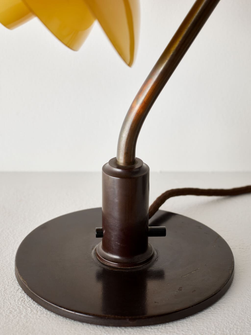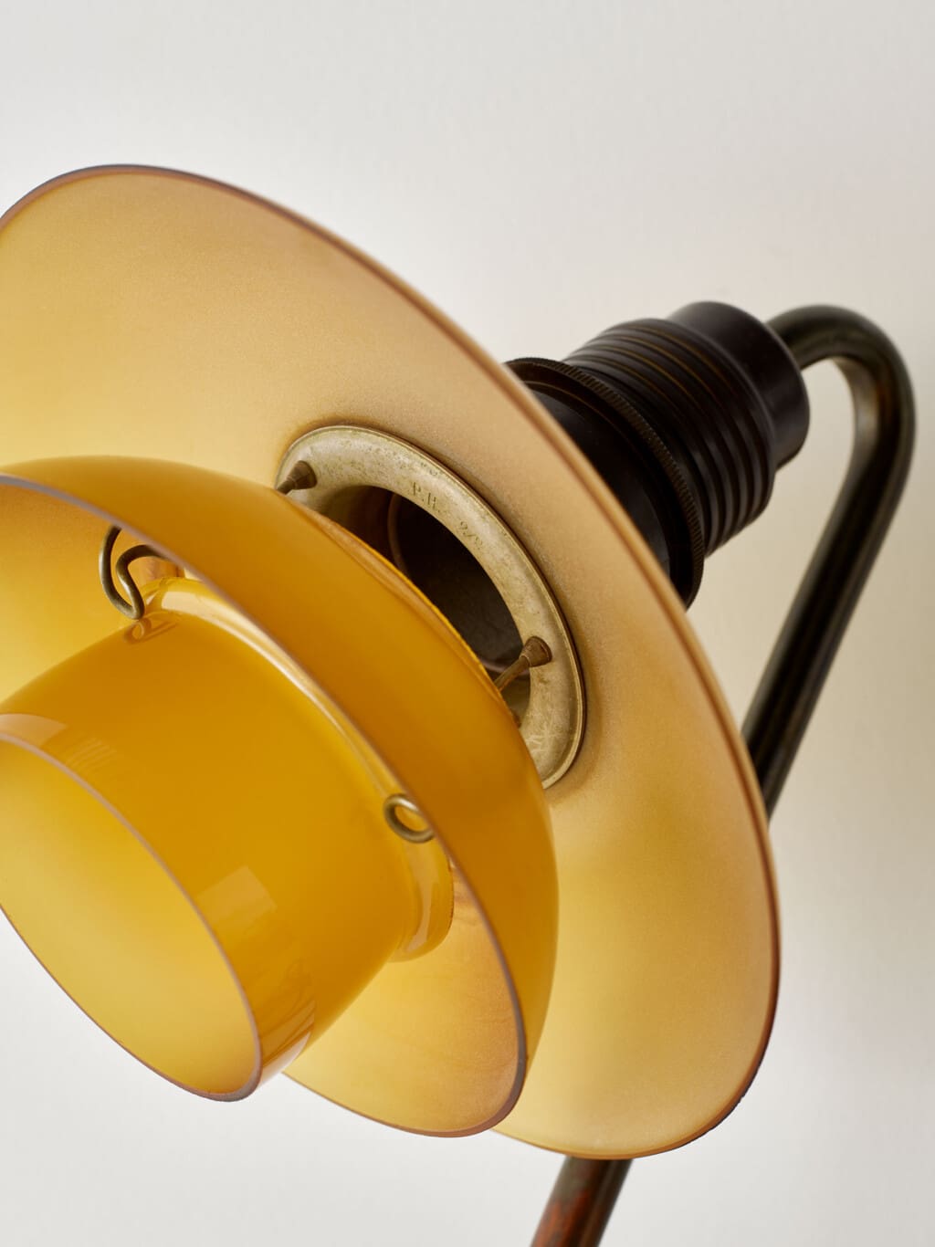 The PH 2/2 series is part of Henningsen’s innovative lighting system, where the proportions of the shades are designed to optimize light distribution and reflection. This model, with its smaller size, was specifically tailored for intimate settings like desks or side tables, making it both a functional and decorative piece. The patinated brass base and stem contribute to its vintage charm, showcasing the material’s natural aging process over nearly a century.