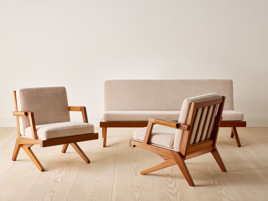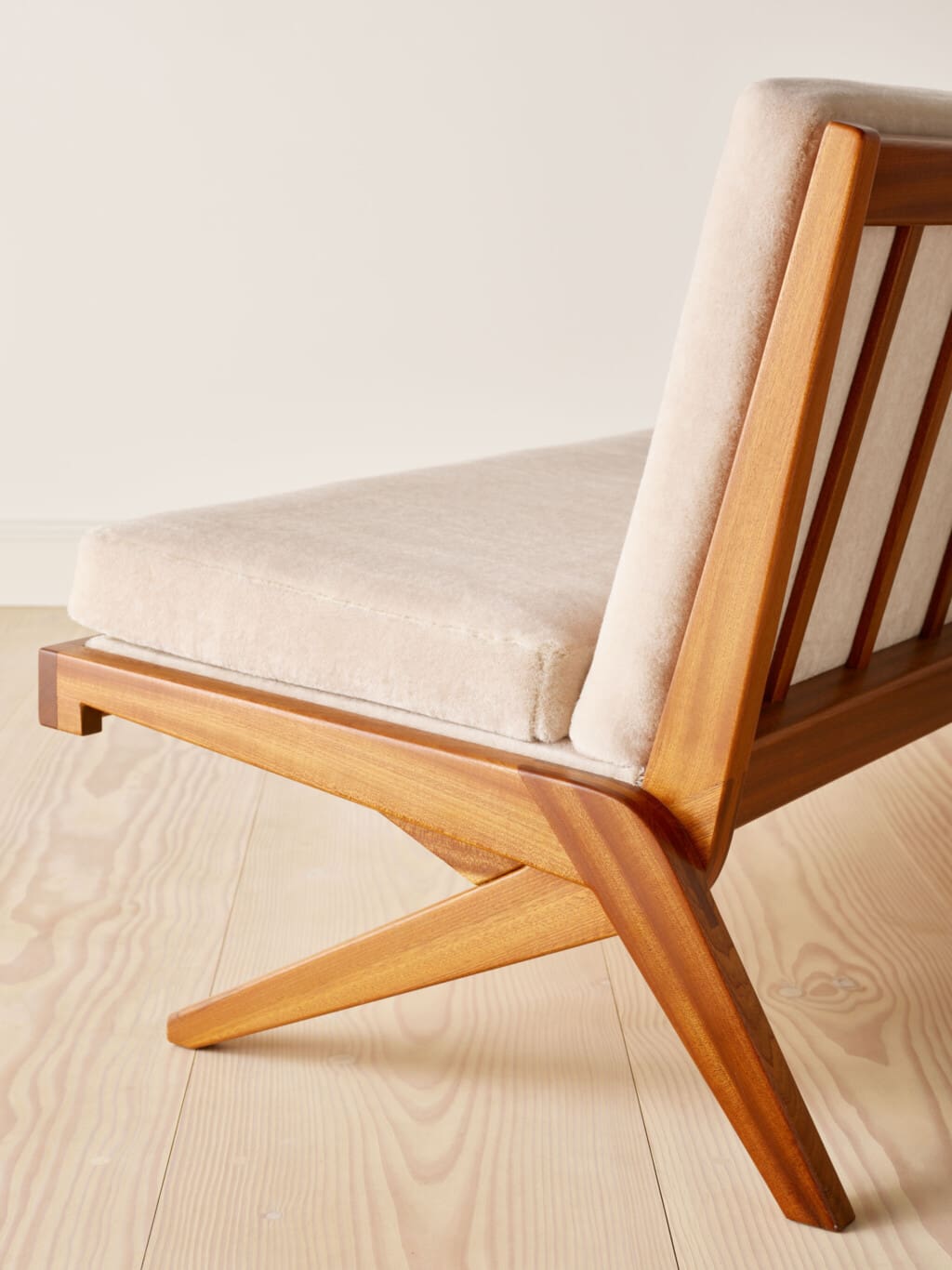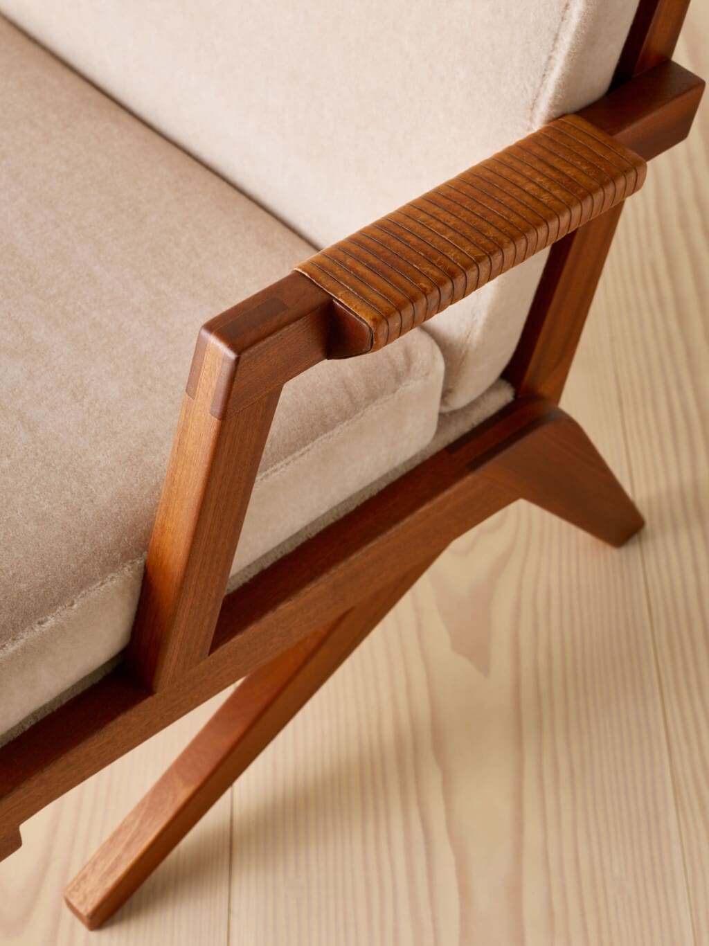 This suite of two armchairs and one sofa in solid mahogany is designed by Finnish designer and interior architect Olavi Hänninen for Huonekalu Mikko Nupponen (HMN), Lahtis, Finland in the 1960’s. The model features crossed legs on each side which have the shape of a boomerang, hence its name “Bumerang”. The backrest is divided into slats and the armrests are finished with leather straps. The seating leans slightly backwards and creates a dynamic look whilst at the same time creating a wonderful sitting comfort. All pillows have been professionally reupholstered in a soft and inviting grey velvet mohair fabric from Pierre Frey, Paris.