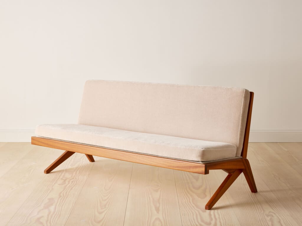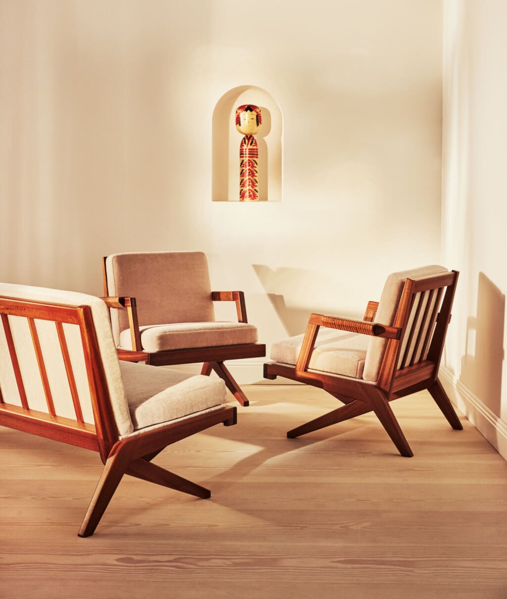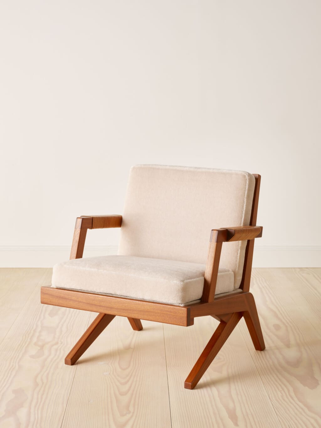 This suite of two armchairs and one sofa in solid mahogany is designed by Finnish designer and interior architect Olavi Hänninen for Huonekalu Mikko Nupponen (HMN), Lahtis, Finland in the 1960’s. The model features crossed legs on each side which have the shape of a boomerang, hence its name “Bumerang”. The backrest is divided into slats and the armrests are finished with leather straps. The seating leans slightly backwards and creates a dynamic look whilst at the same time creating a wonderful sitting comfort. All pillows have been professionally reupholstered in a soft and inviting grey velvet mohair fabric from Pierre Frey, Paris.