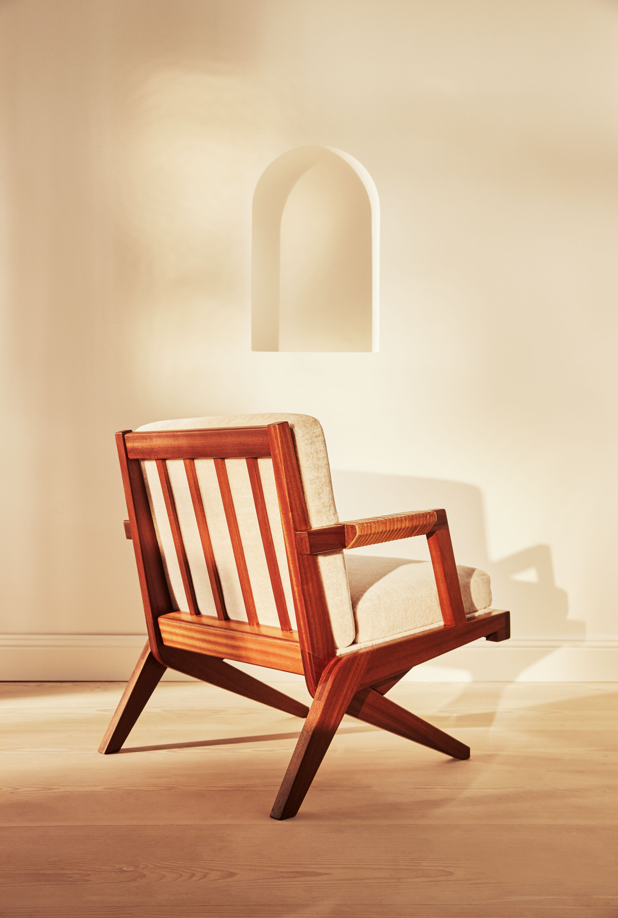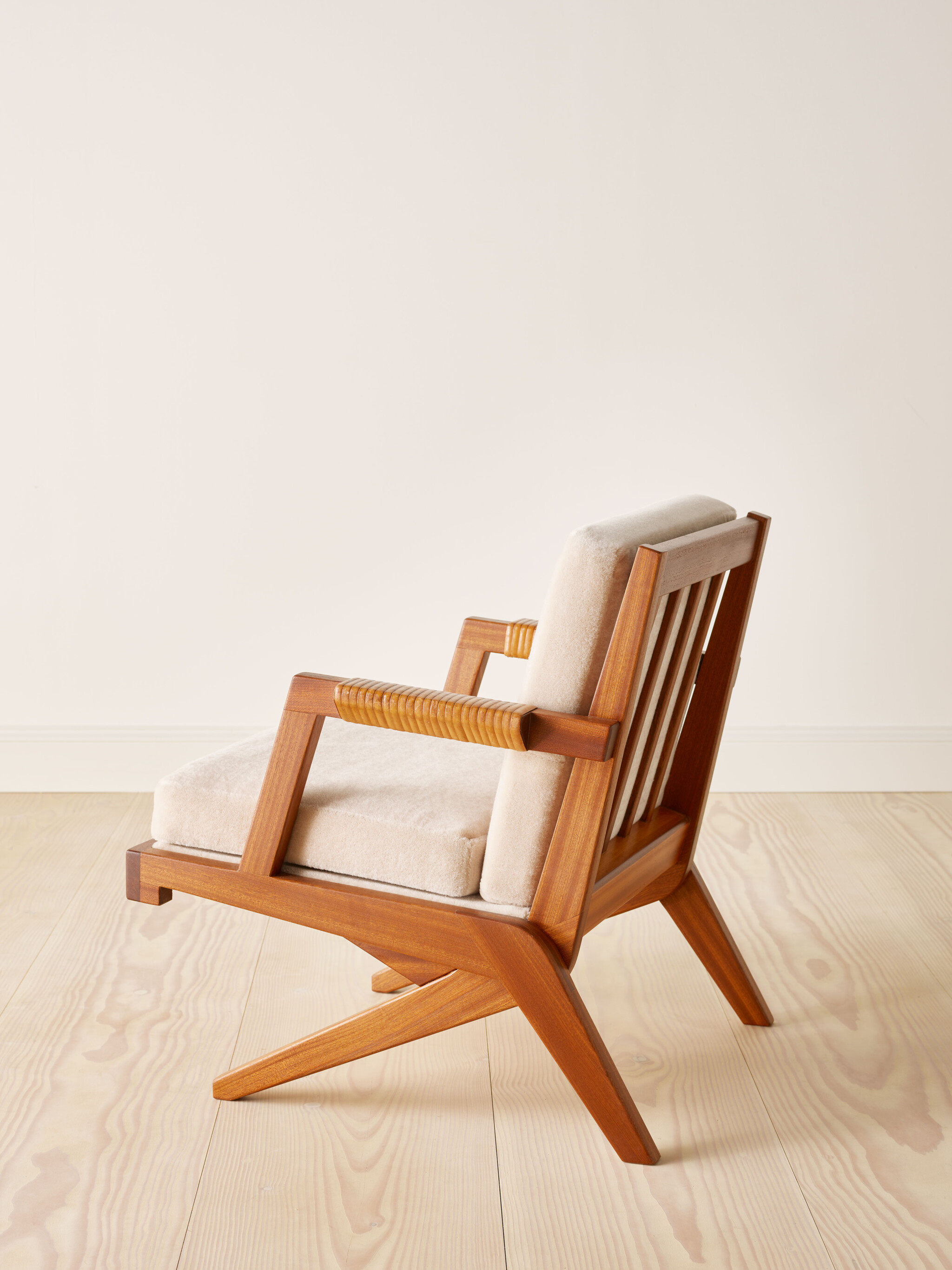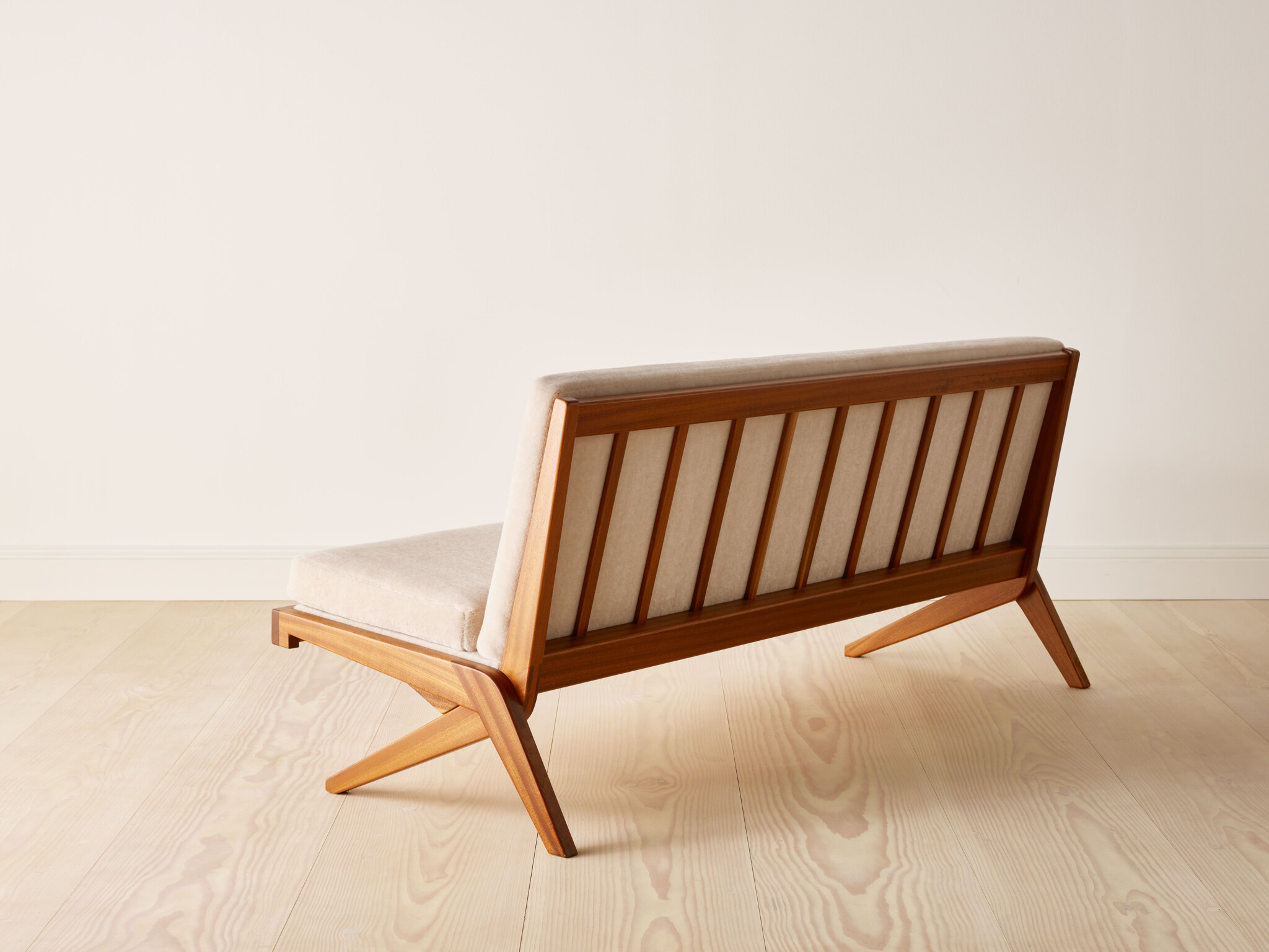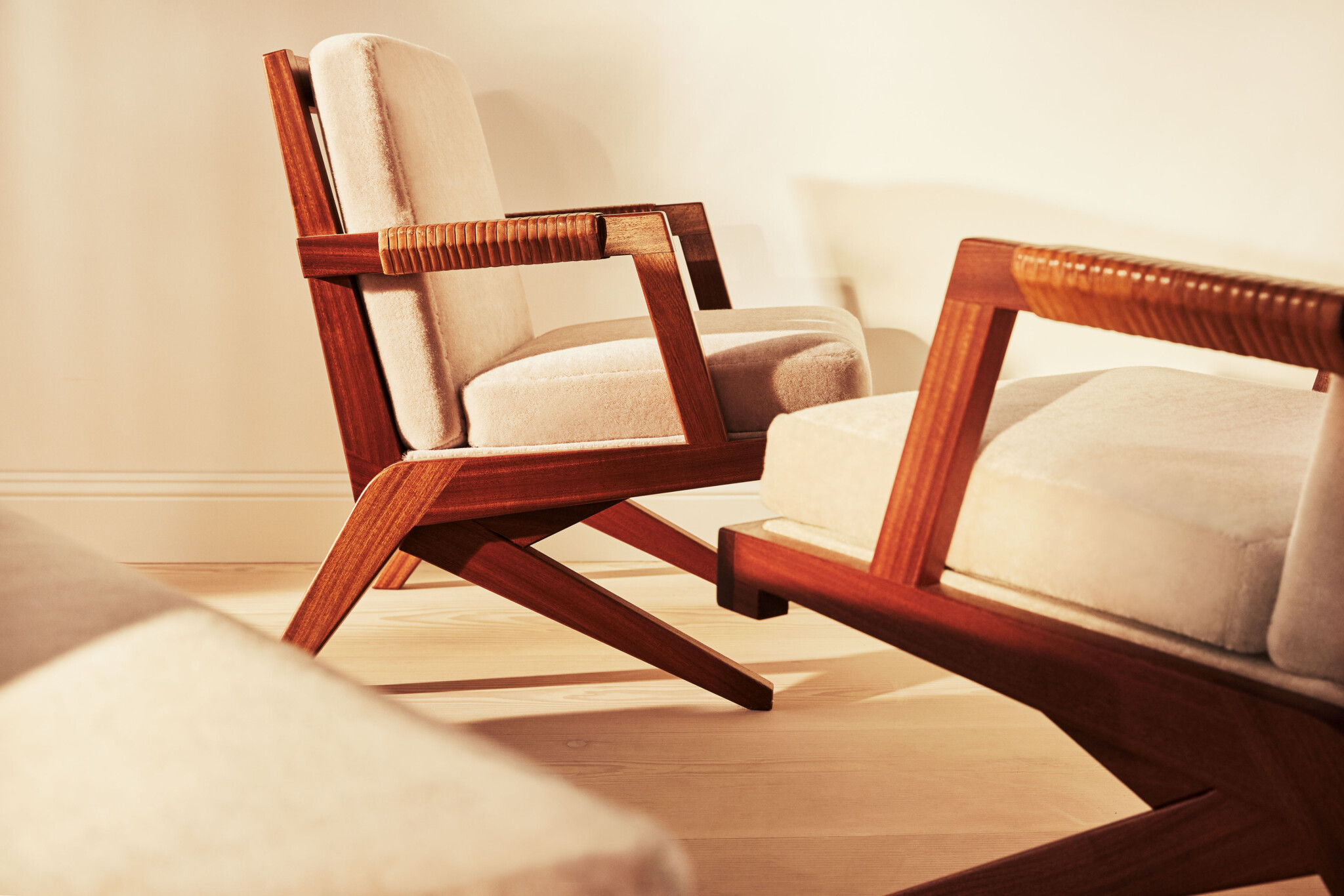 This suite of two armchairs and one sofa in solid mahogany is designed by Finnish designer and interior architect Olavi Hänninen for Huonekalu Mikko Nupponen (HMN), Lahtis, Finland in the 1960’s. The model features crossed legs on each side which have the shape of a boomerang, hence its name “Bumerang”. The backrest is divided into slats and the armrests are finished with leather straps. The seating leans slightly backwards and creates a dynamic look whilst at the same time creating a wonderful sitting comfort. All pillows have been professionally reupholstered in a soft and inviting grey velvet mohair fabric from Pierre Frey, Paris.