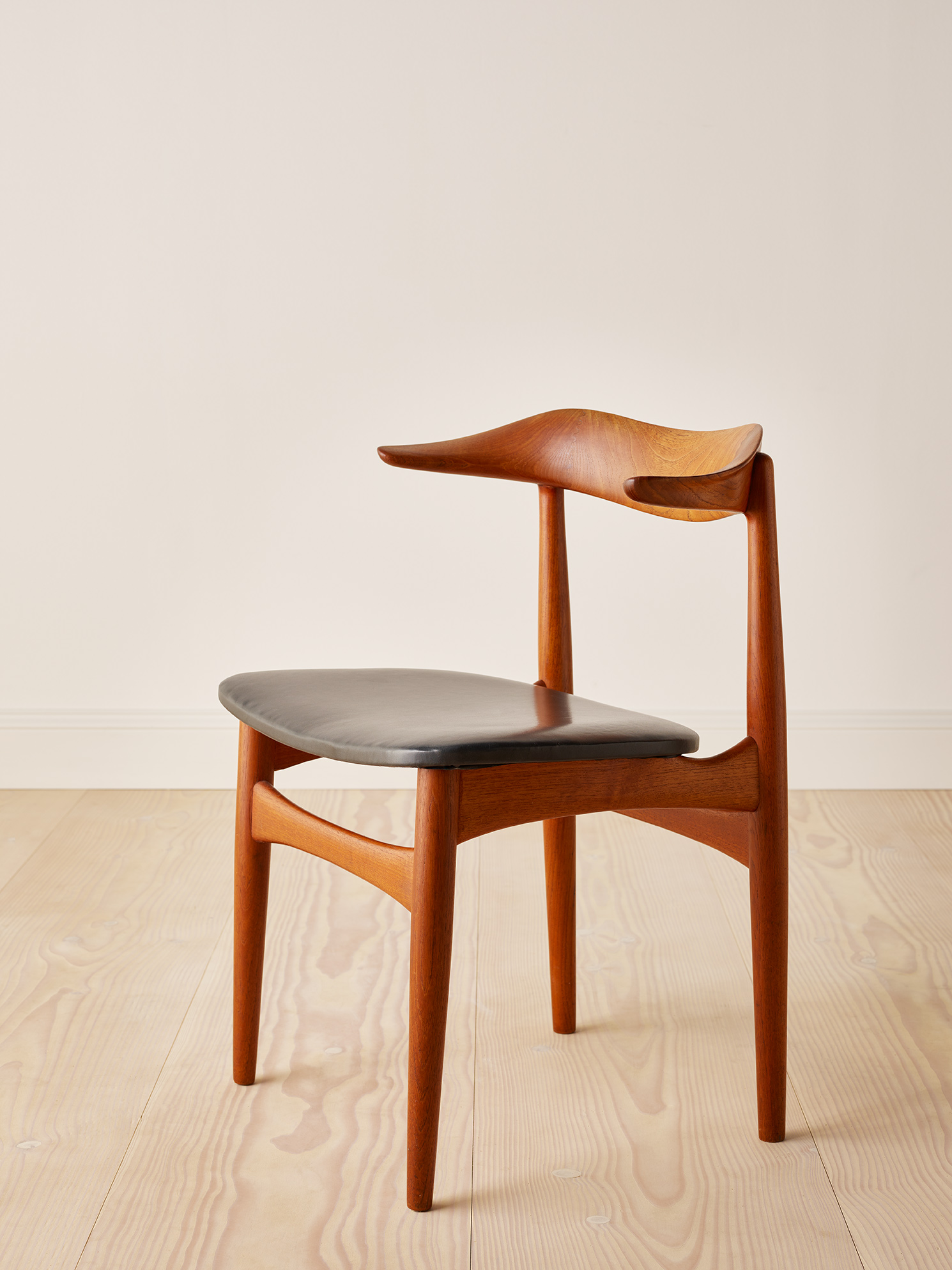 Here is a unique opportunity to acquire a set of no less than 12 dining chairs in the rare and sought-after model chair model “SM 521” or “The Cowhorn chair” designed by furniture designer Knud Færch and produced by Slagelse Møbelfabrik in Denmark in the 1950’s. These amazing chairs showcase Danish craftmanship at its finest with impressive joinery in the backrest and with its original patina visible on both leather seat and frame, the original condition can only be described as impeccable.