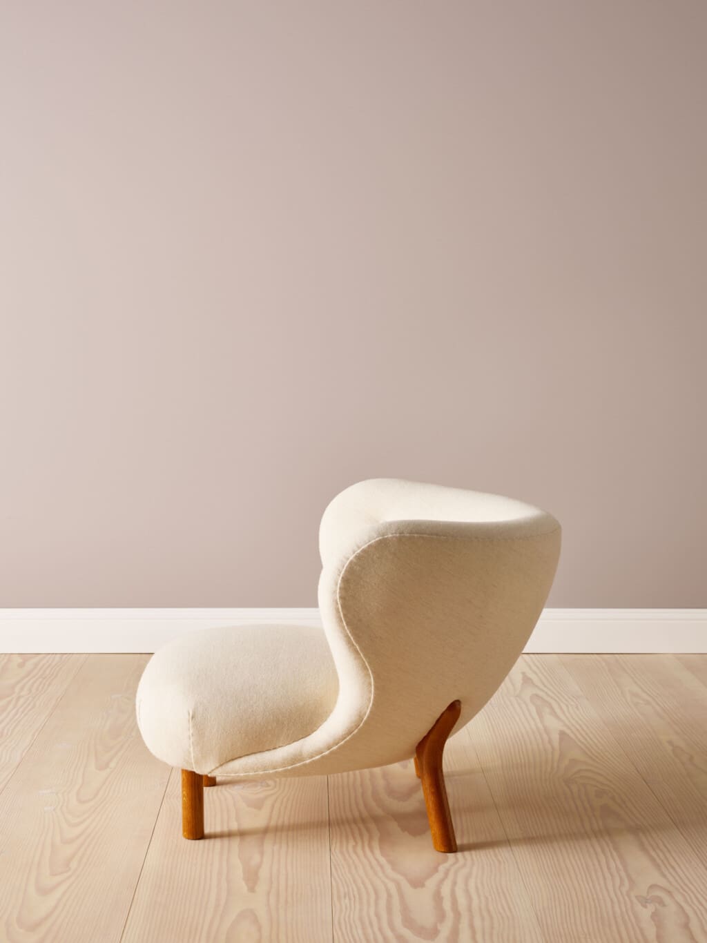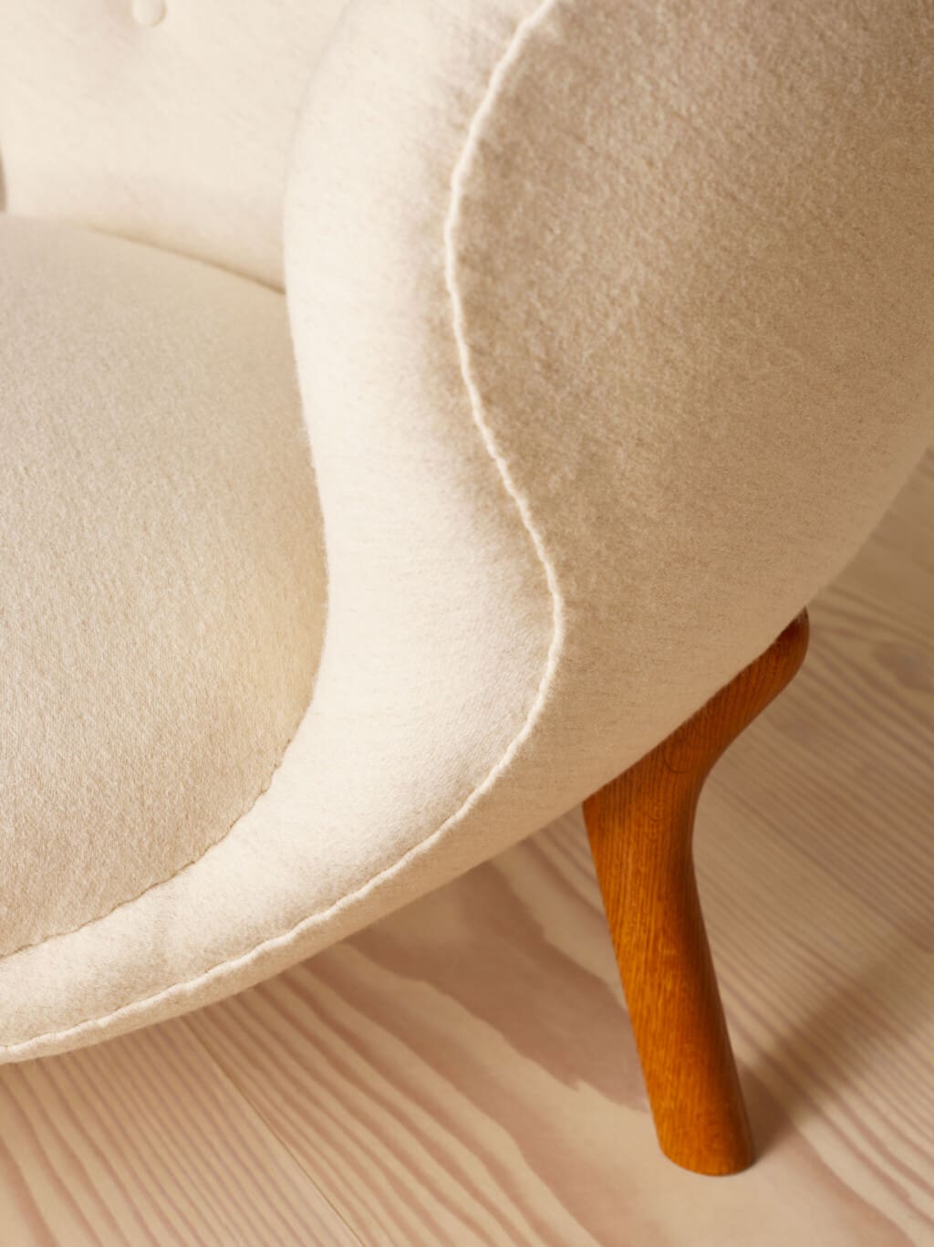 The Little Petra chair was first made for the Copenhagen Cabinetmakers Guild in 1938. Designed by Viggo Boesen, a Danish architect who wasn’t widely known at the time and was therefore nicknamed the “unknown Artisan“. His so-called “funkis” designs contributed to Denmark’s signature design aesthetic in the 1930’s and 1940’s. The Little Petra chair was in fact named after Boesen’s mother-in-law and is among his best and most desirable designs. Boesen underestimated the popularity of the Little Petra, and only a small numbers of the original chair was ever made. It was made to order and handcrafted by one of Denmark’s most respected cabinetmakers A.J. Iversen. The Little Petra”. Easy chair with oak legs. Seat and back upholstered with light wool, back fitted with buttons. Designed 1938. This example comes with oak legs and with the seat and back upholstered in a light-coloured fabric entitled ‘White ‘Savak’ fabric by Danish fabric experts Gabriel A/S., made in the 1940s by cabinetmaker A. J. Iversen.
