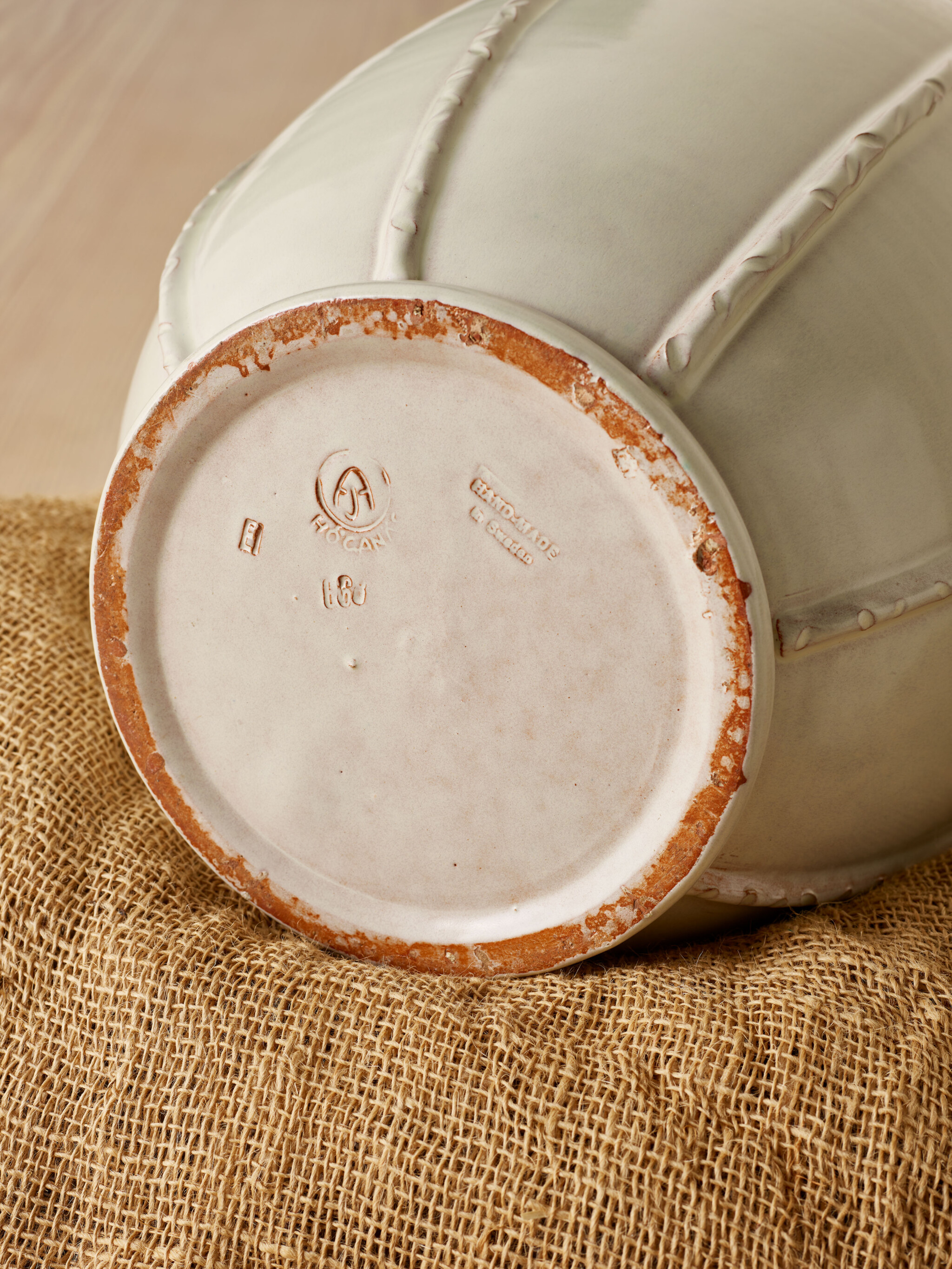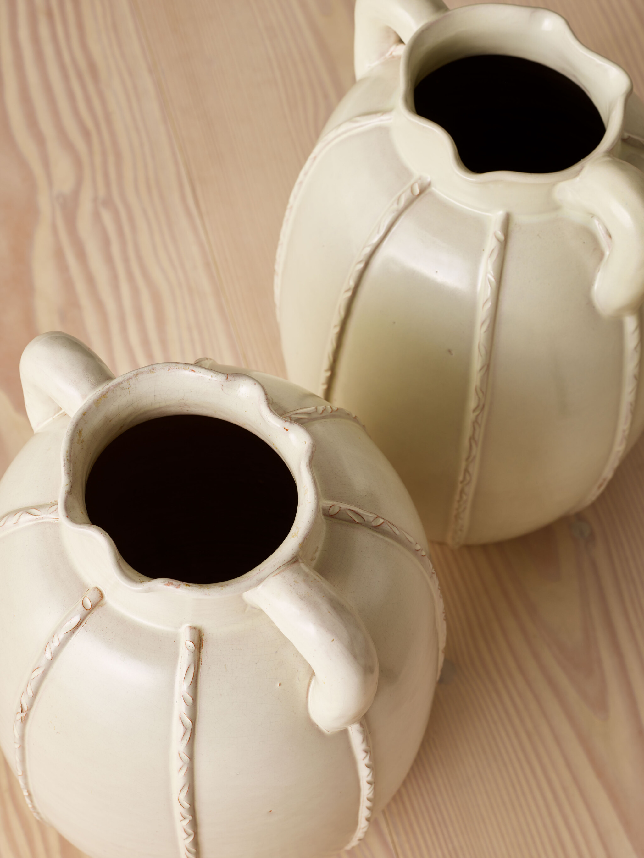 These Swedish floor vases by Andersson & Johansson, crafted in the 1940s at Höganäs, are an elegant example of Scandinavian ceramic artistry. Standing 47 cm tall, the vases are made from stoneware and features a creamy white glaze that gives them a soft, refined finish. The vases’ design includes vertical ridges with subtle decorative detailing, adding texture and depth to their smooth and rounded forms. Their stamped markings, “AJ Höganäs Made in Sweden,” emphasize the authentic Swedish craftsmanship. This pair beautifully reflects the Scandinavian approach to combining simplicity with organic, understated details.