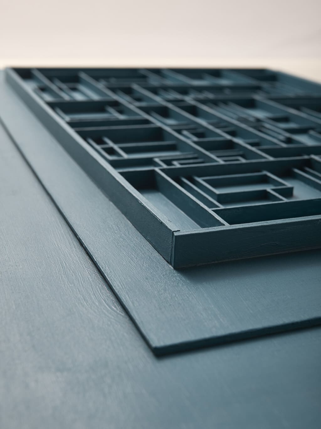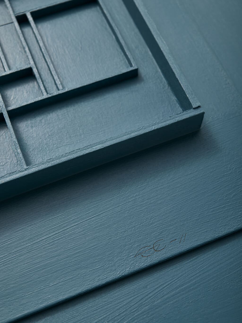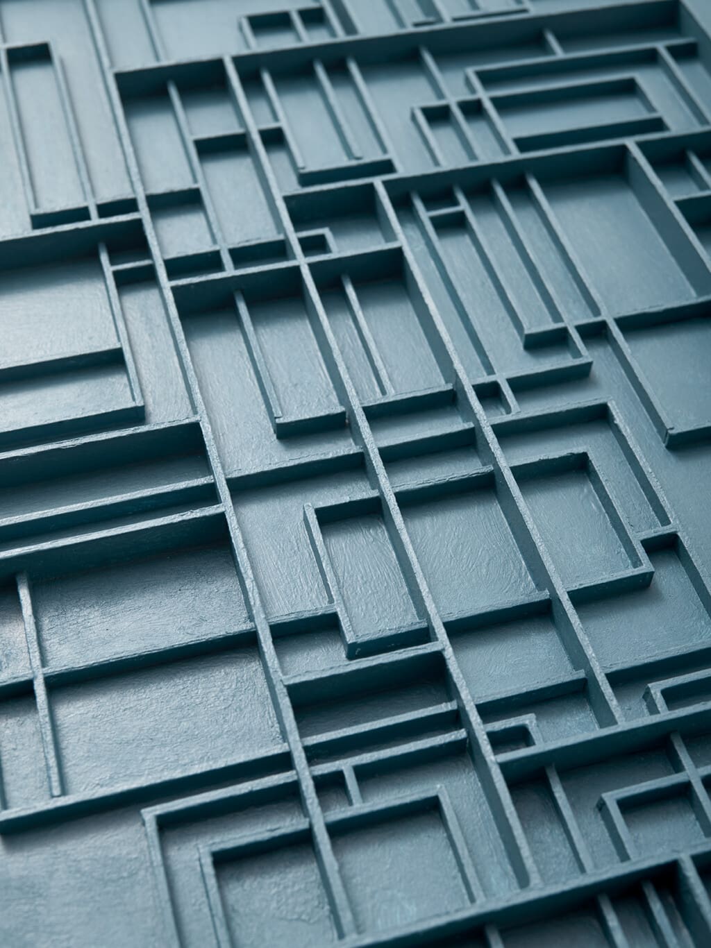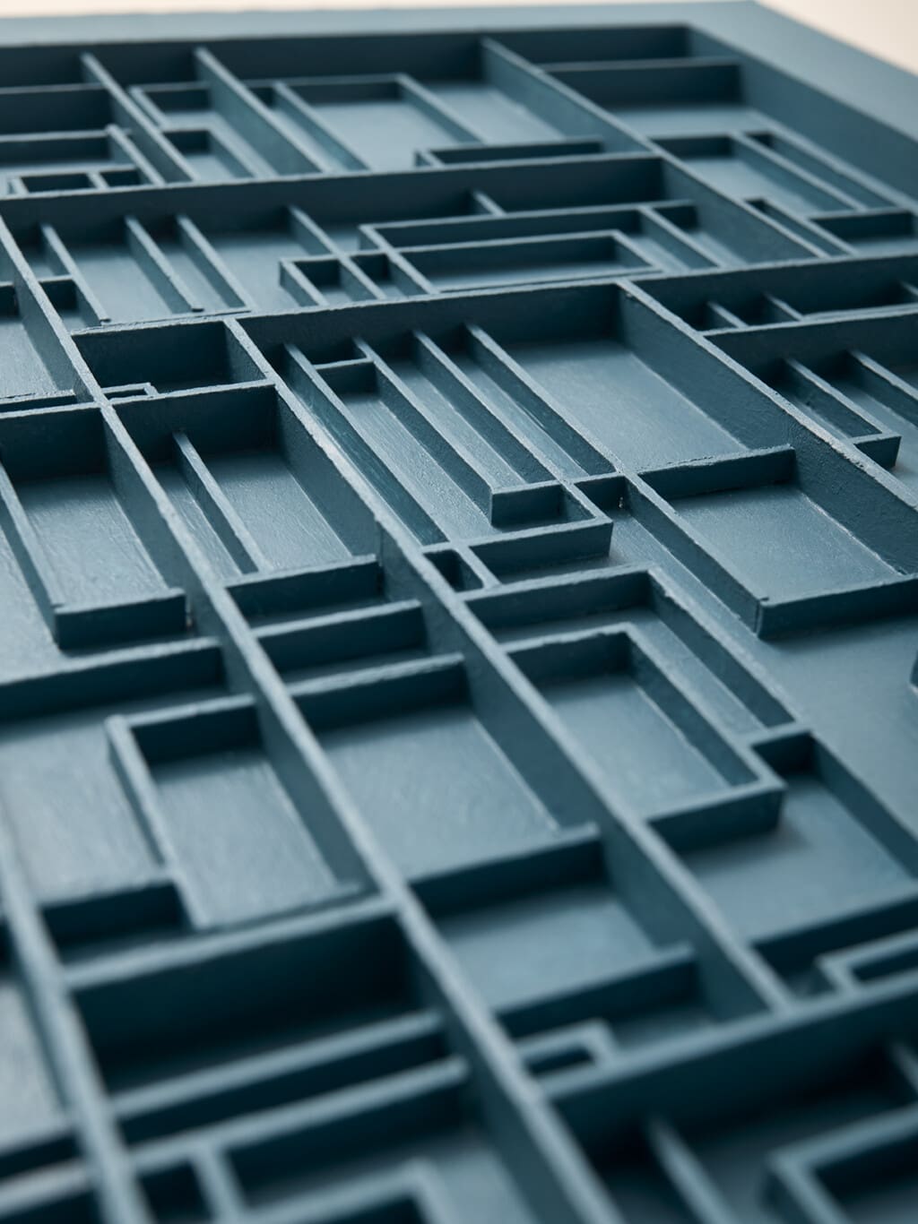 A cardboard and acrylic paint relief art piece in turquoise colour entitled “Knossos” by Finnish artist and architecjt Sakari Laitinen. Laitinen was a key Finnish architect who studied in the late 1950s and worked with Alvar Aalto. He contributed to Helsinki’s master plan and his architectural style was rooted in 1960s constructivism with diverse influences. Alongside architecture, Laitinen excelled in drawing and graphic design. The shift to digital design led him to close his practice in 1997 and focus entirely on art. This piece is dated 2011 and is an amazing conversation starter.