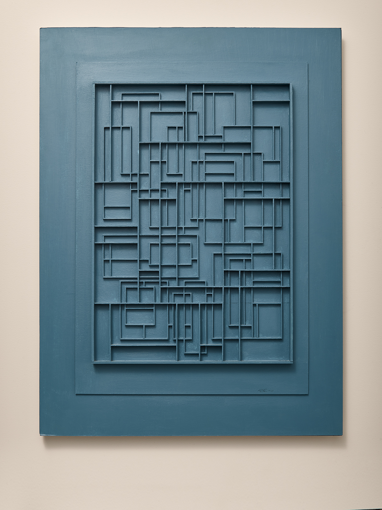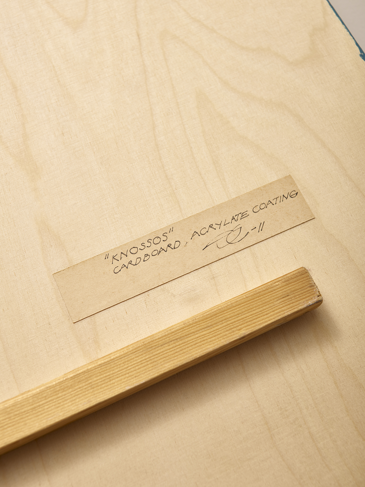 A cardboard and acrylic paint relief art piece in turquoise colour entitled “Knossos” by Finnish artist and architecjt Sakari Laitinen. Laitinen was a key Finnish architect who studied in the late 1950s and worked with Alvar Aalto. He contributed to Helsinki’s master plan and his architectural style was rooted in 1960s constructivism with diverse influences. Alongside architecture, Laitinen excelled in drawing and graphic design. The shift to digital design led him to close his practice in 1997 and focus entirely on art. This piece is dated 2011 and is an amazing conversation starter.
