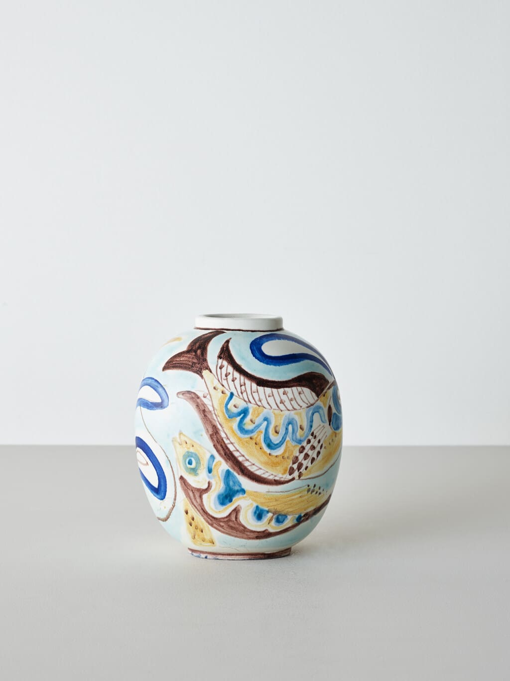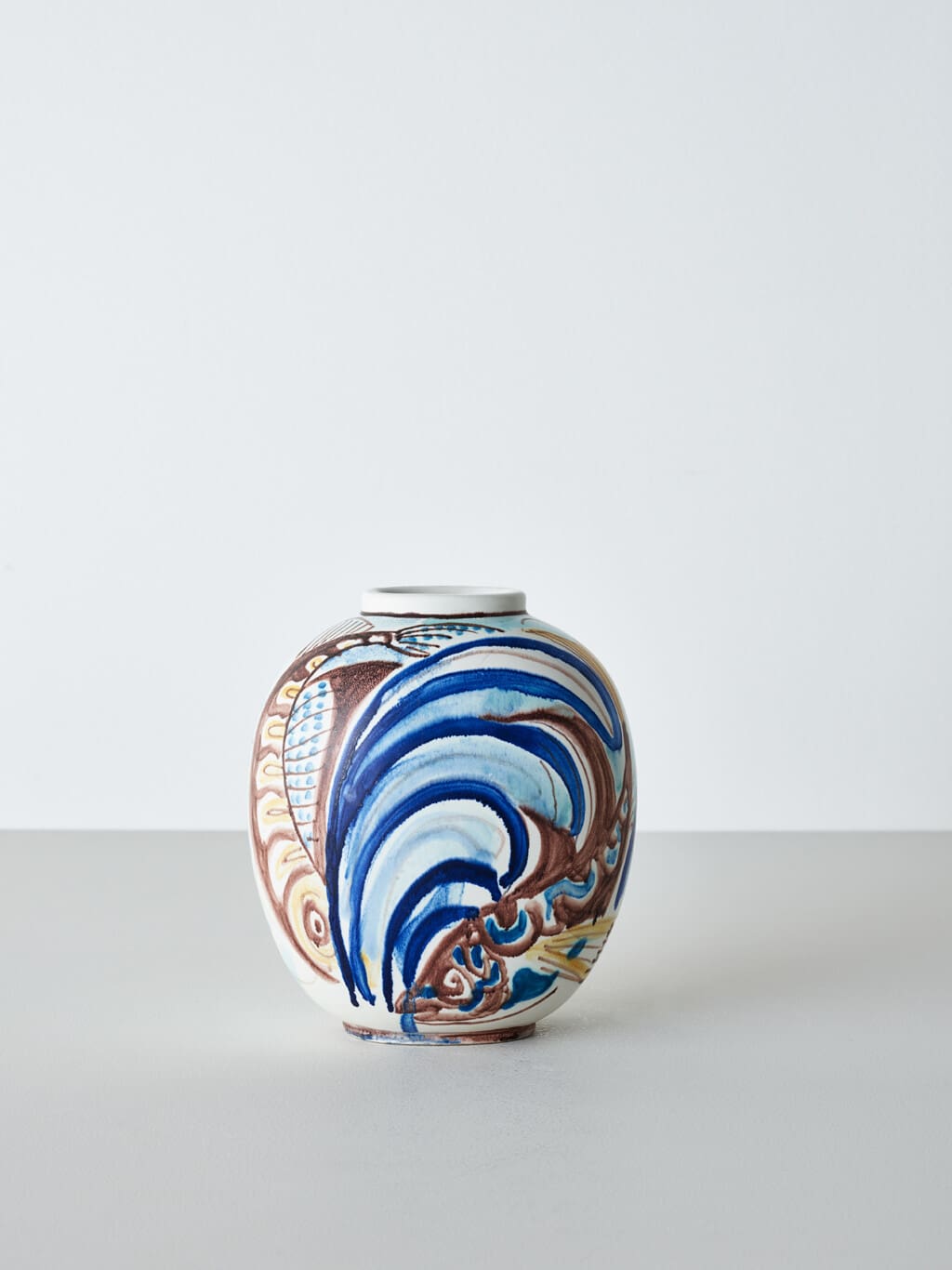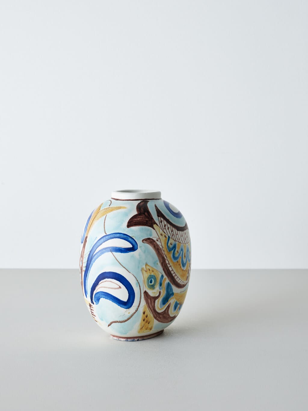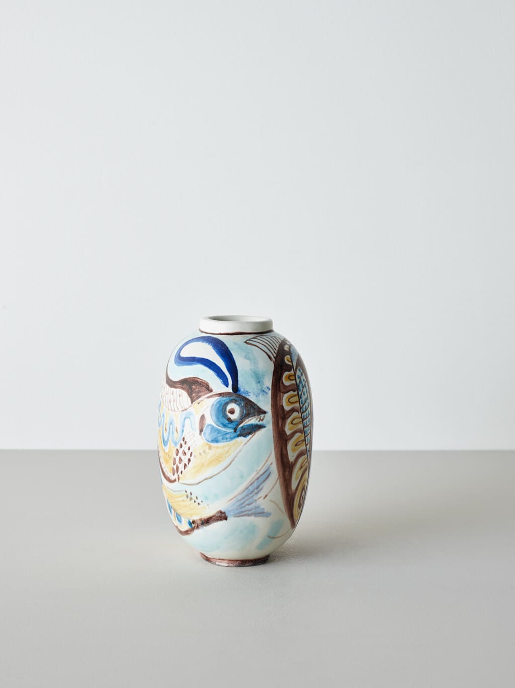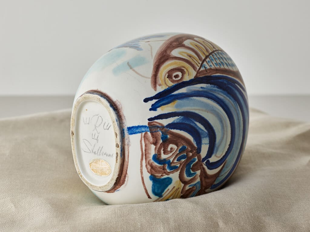Painted decor of fish, stoneware. Signed Steel Faucet, height 24 cm.