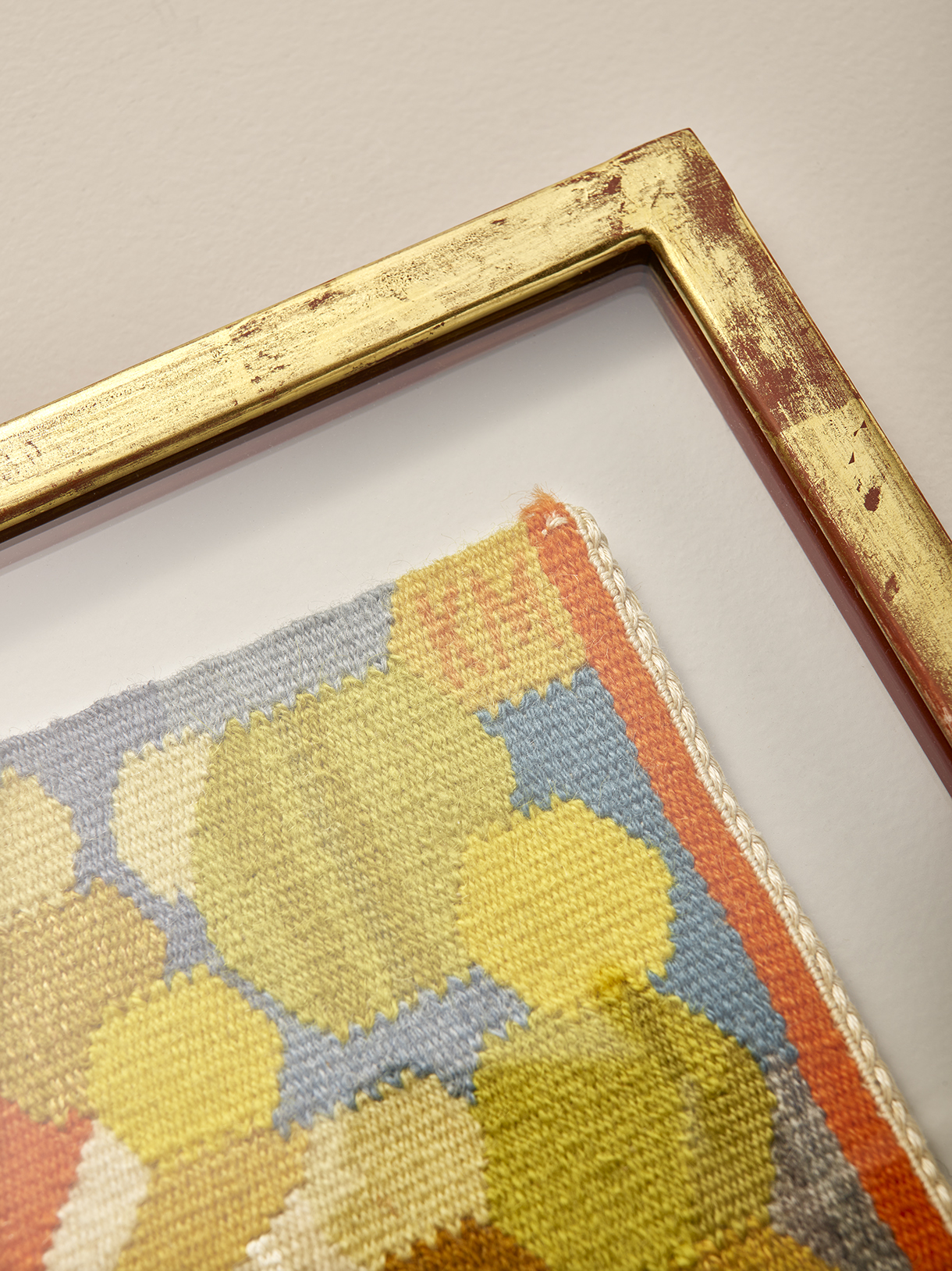 The tapestry has been expertly framed between two sheets of glass surrounded by a gold frame.