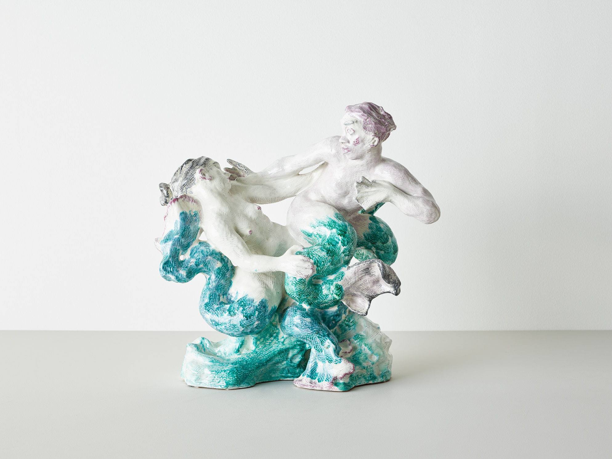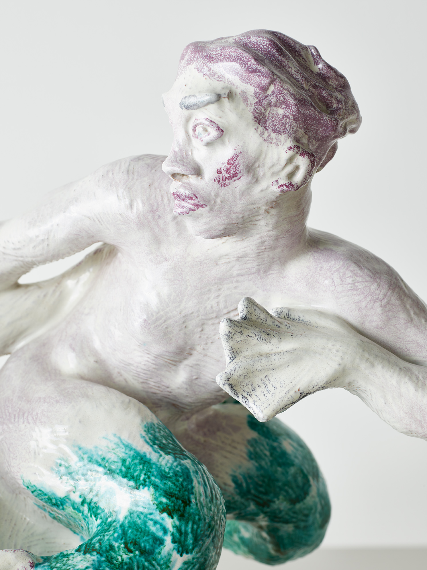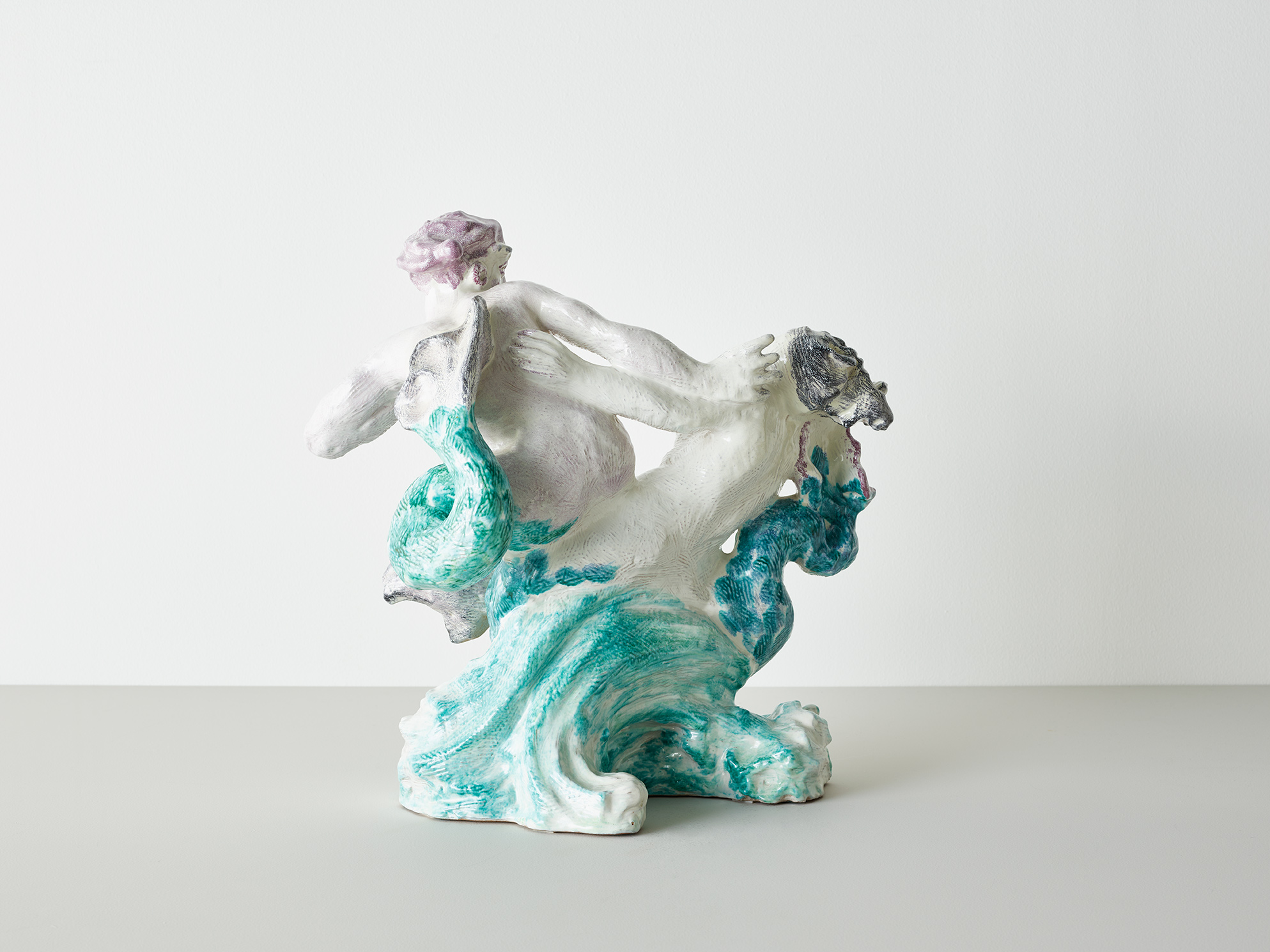 This expressive faience sculpture by Jean René Gauguin, created for Bing & Grøndahl, is titled “Bølgenes leg” (“Play of the Waves”). It captures two mythic sea beings intertwined in a dynamic, swirling struggle atop curling waves. Their torsos, glazed in soft ivory and lilac, twist with dramatic tension, while the boldly modelled turquoise and deep green tails surge with rhythmic force. Gauguin’s characteristic focus on movement and physicality emerges in the taut musculature, sharply defined features and splayed hands, all brought to life through textured, layered glazes. The piece radiates vitality and theatricality, illustrating his fascination with myth, motion and sculptural drama.
