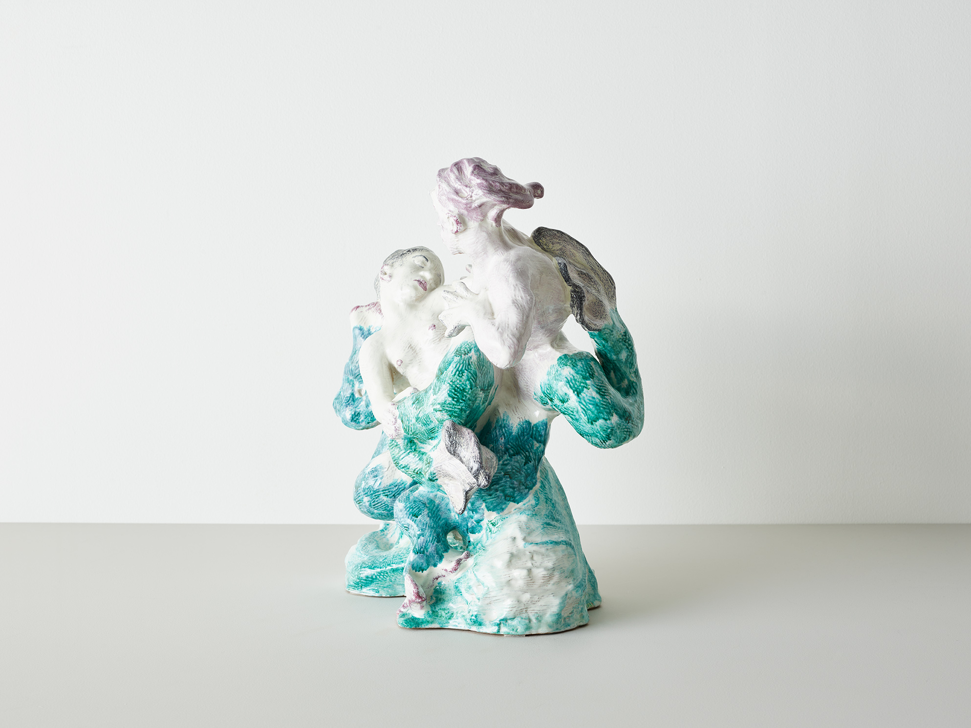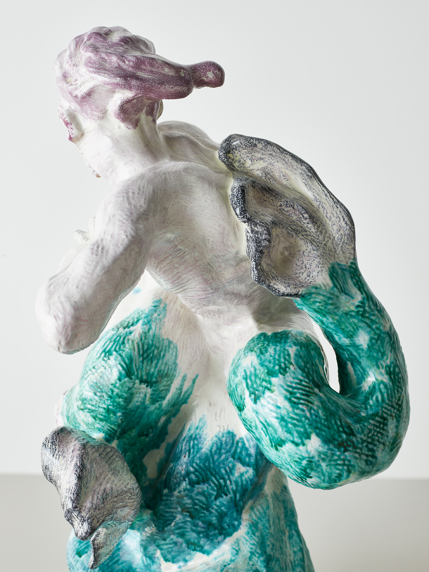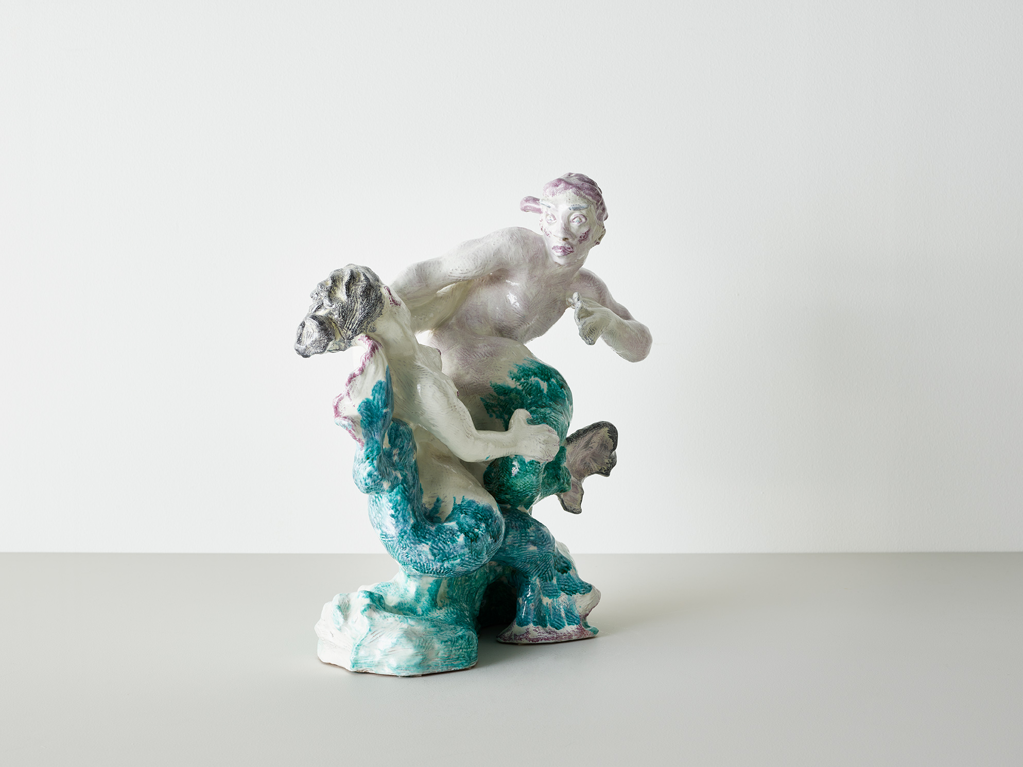 This expressive faience sculpture by Jean René Gauguin, created for Bing & Grøndahl, is titled “Bølgenes leg” (“Play of the Waves”). It captures two mythic sea beings intertwined in a dynamic, swirling struggle atop curling waves. Their torsos, glazed in soft ivory and lilac, twist with dramatic tension, while the boldly modelled turquoise and deep green tails surge with rhythmic force. Gauguin’s characteristic focus on movement and physicality emerges in the taut musculature, sharply defined features and splayed hands, all brought to life through textured, layered glazes. The piece radiates vitality and theatricality, illustrating his fascination with myth, motion and sculptural drama.