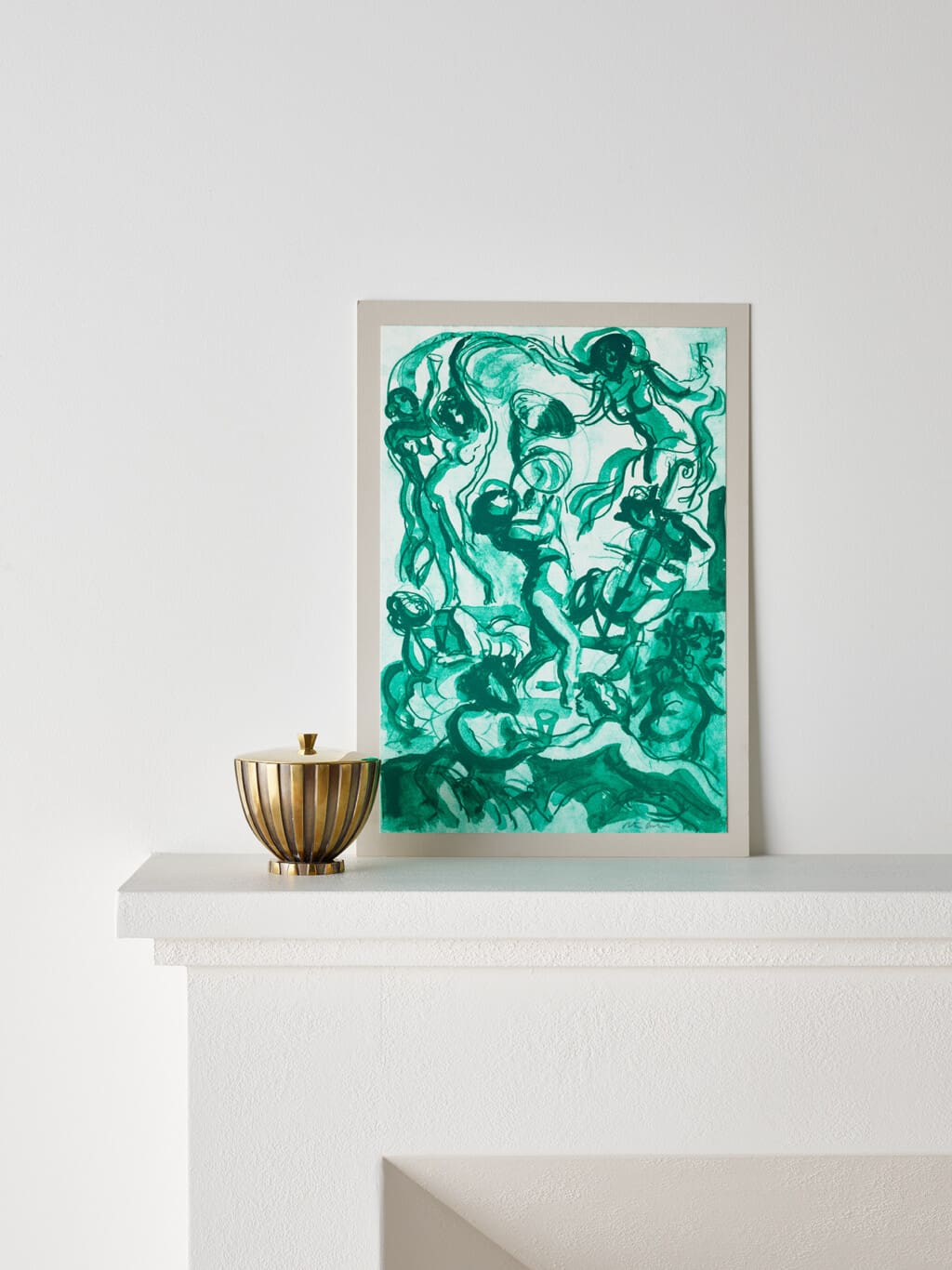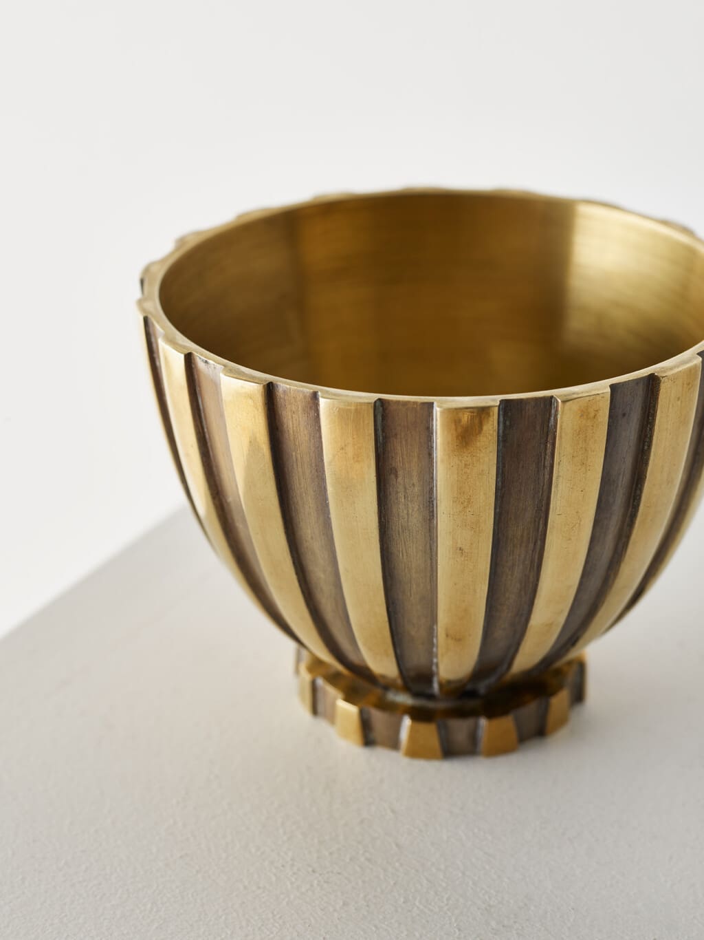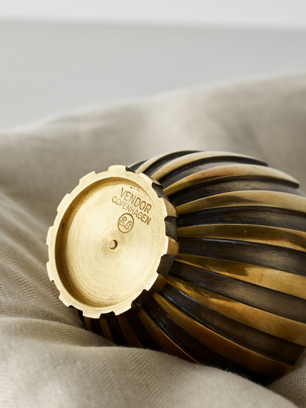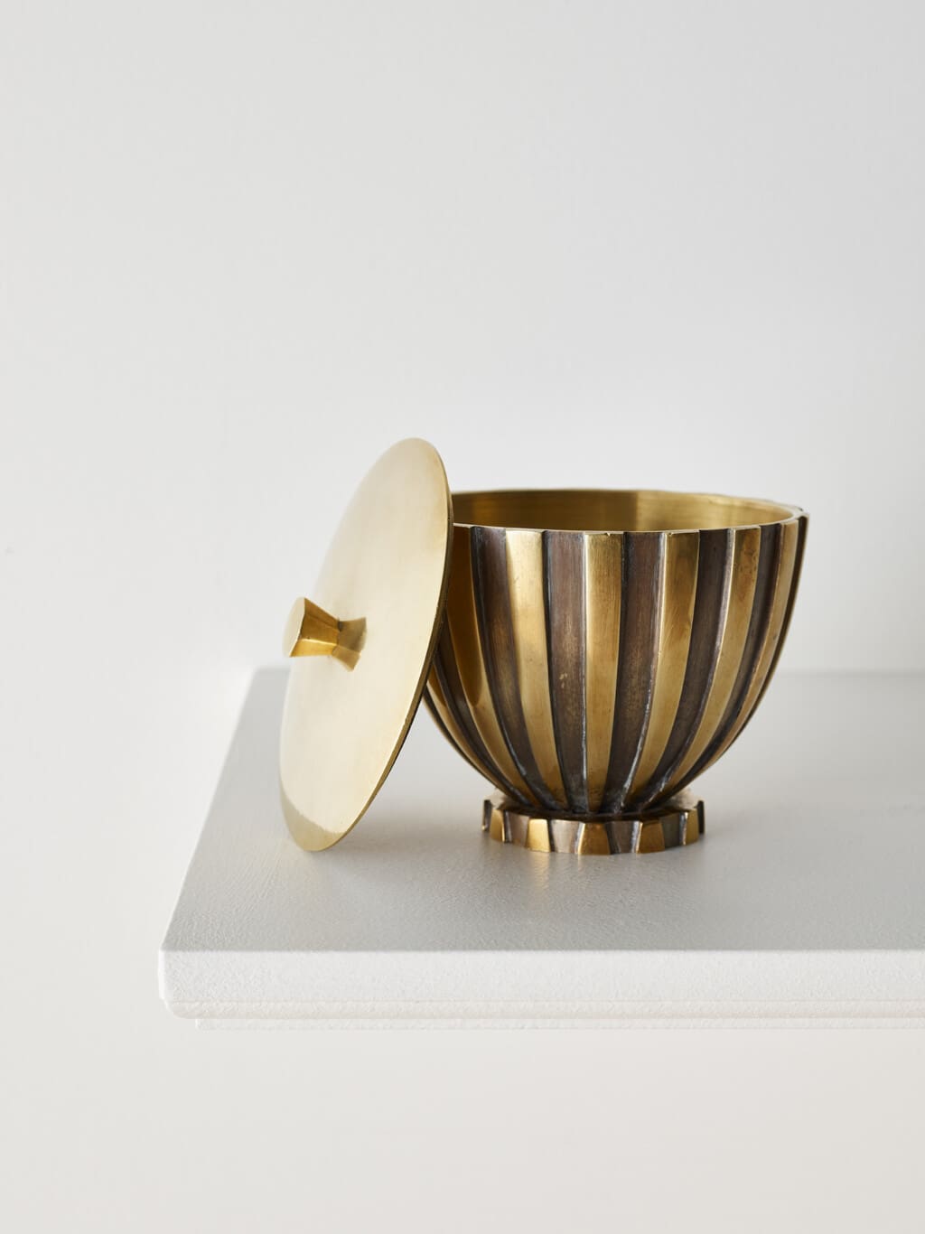 This bronze lidded jar by Vendor, Copenhagen, from the latter half of the 20th century, features a striking vertical stripe pattern in raised relief. Alternating polished and darkened bronze segments give the vessel a strong rhythmic presence, emphasizing its rounded, sculptural form. The lid is topped with a faceted finial that adds a refined geometric accent. With its weighty material and elegant detailing, it serves as both a decorative statement and a functional container.