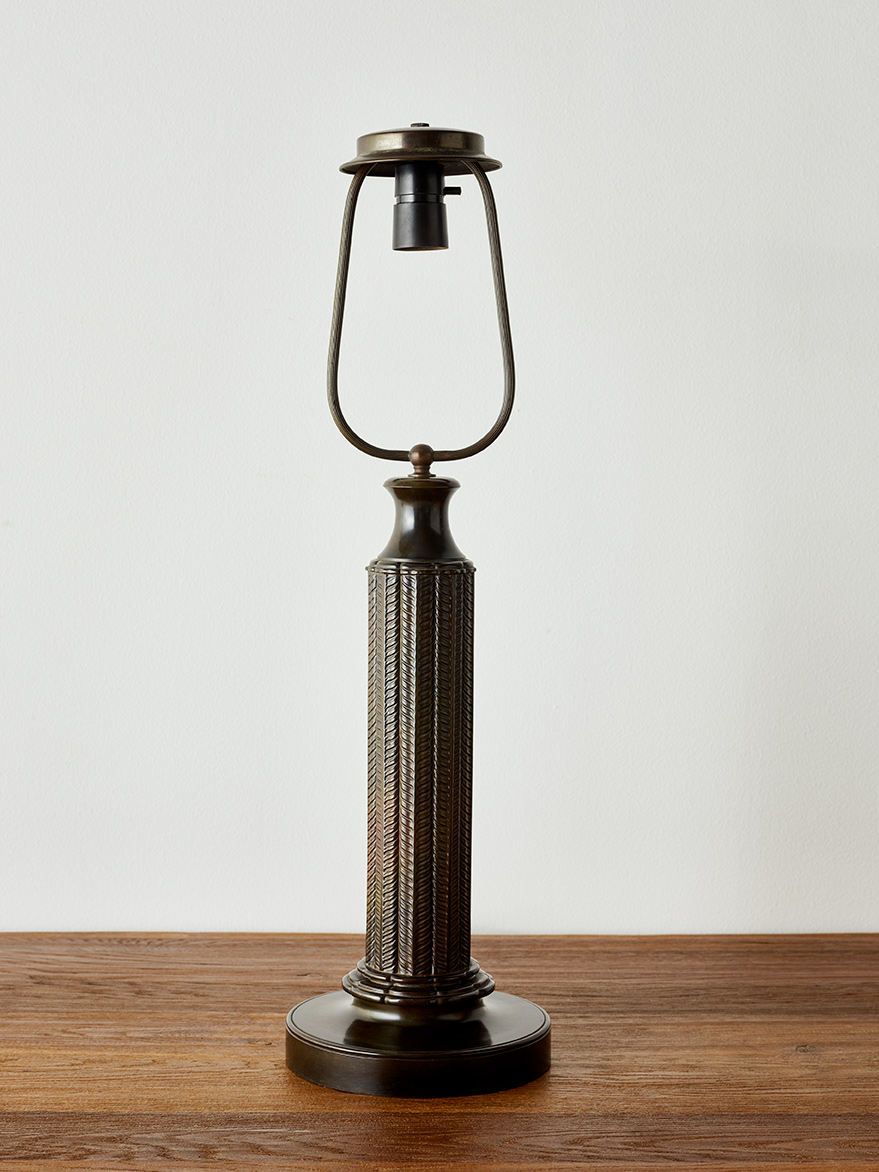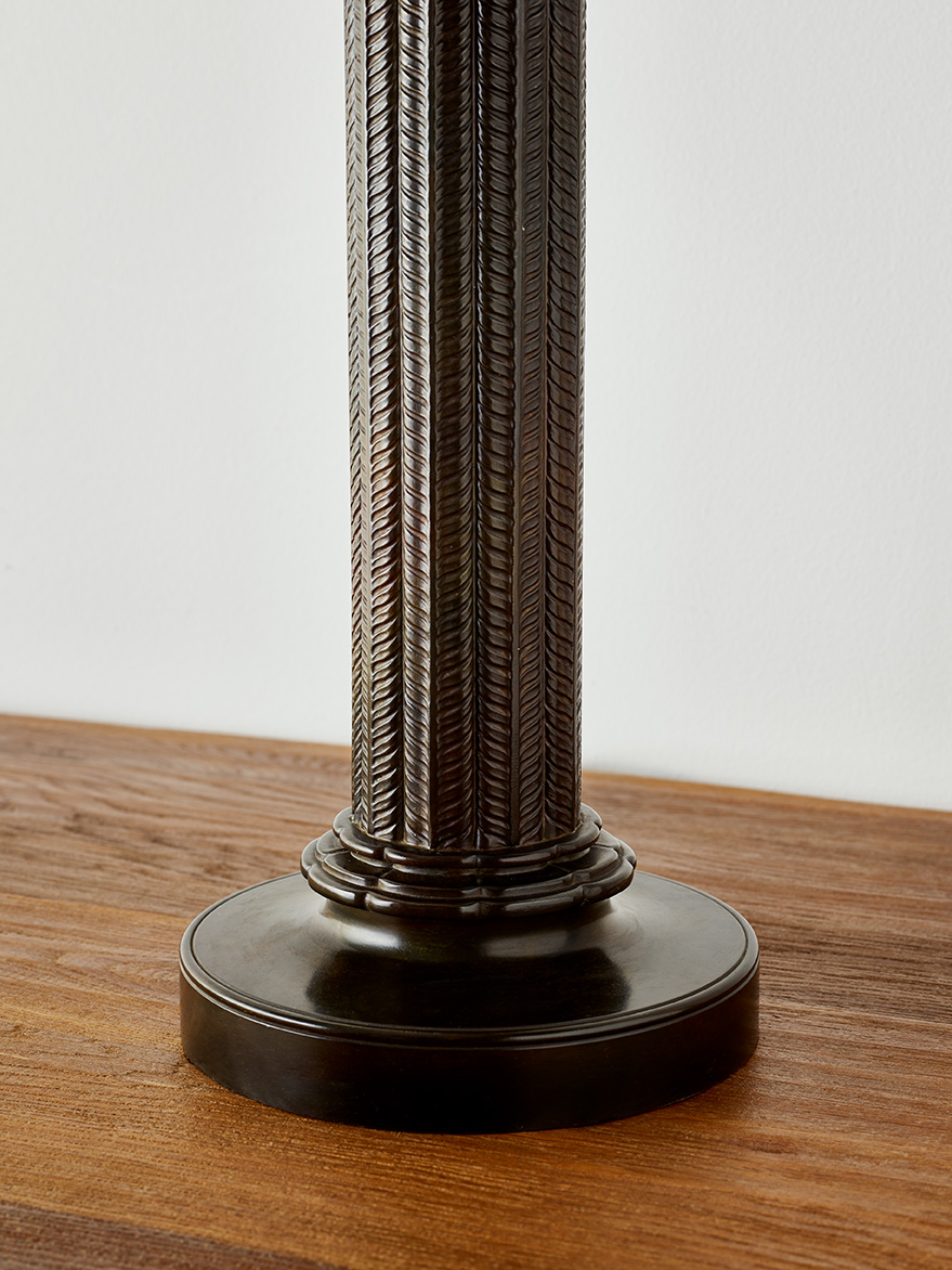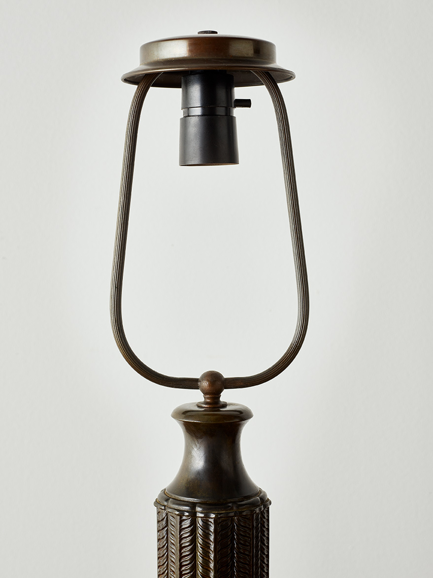 “Kolonne”. A patinated “disko” metal table lamp, stem with stylized ornamentation. Stamped monogram Just A. Design no. 1858. H. incl. shadeholder 61.5 cm