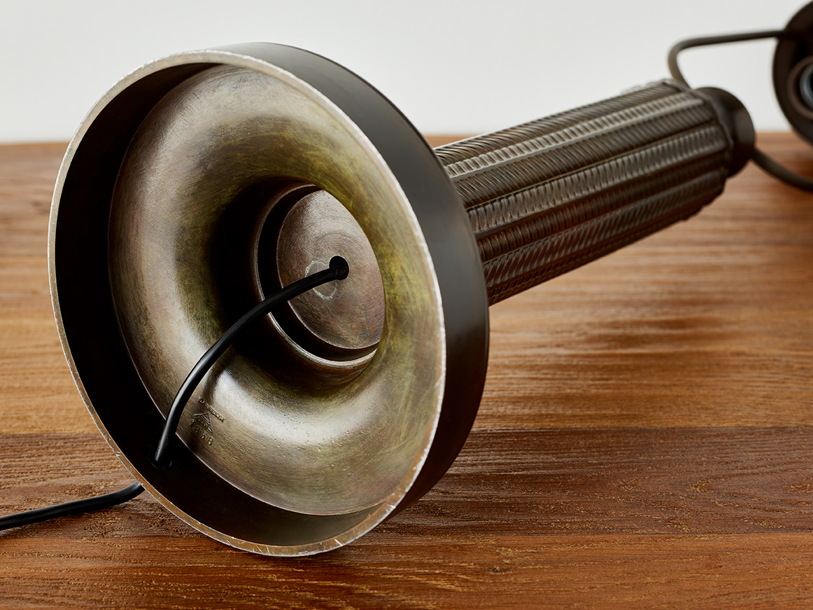 “Kolonne”. A patinated “disko” metal table lamp, stem with stylized ornamentation. Stamped monogram Just A. Design no. 1858. H. incl. shadeholder 61.5 cm