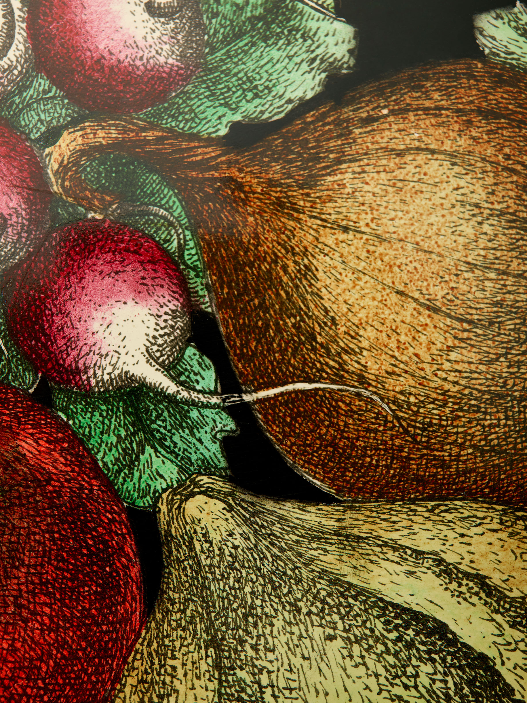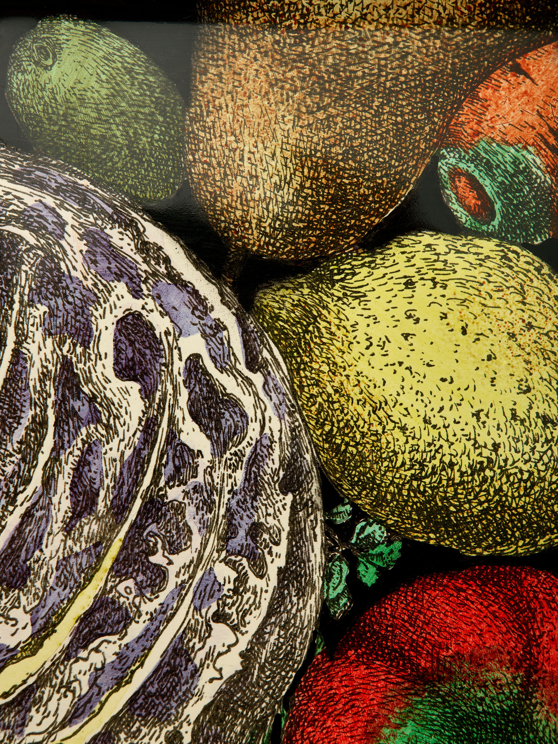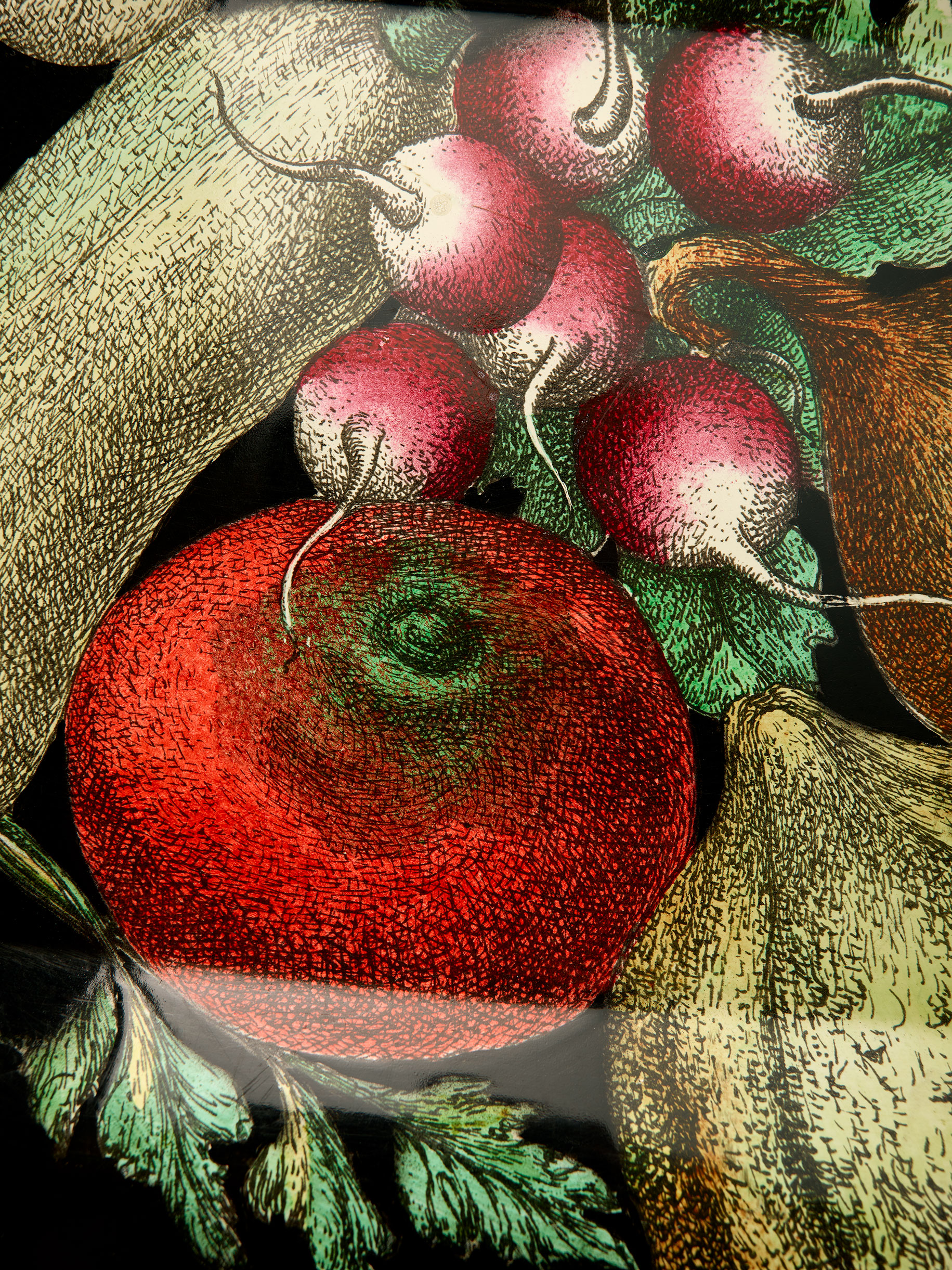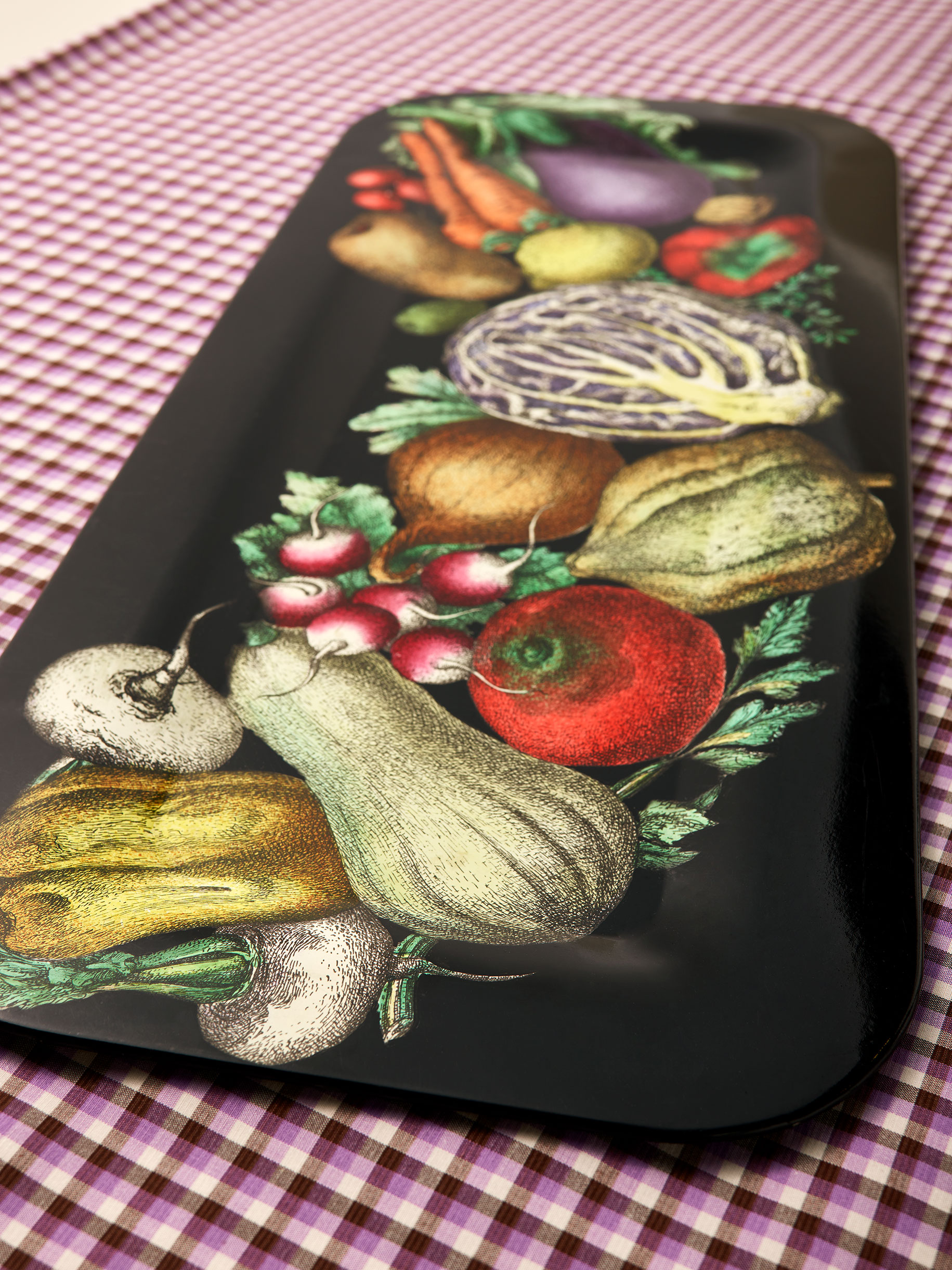 This stunning Fornasetti “Tablett Verdura” tray is a timeless piece of Italian design, featuring a bold, surrealist pattern of lush greenery and vibrant fruit motifs. Crafted from metal, it embodies Fornasetti’s whimsical yet sophisticated aesthetic, blending nature-inspired imagery with high-end craftsmanship.