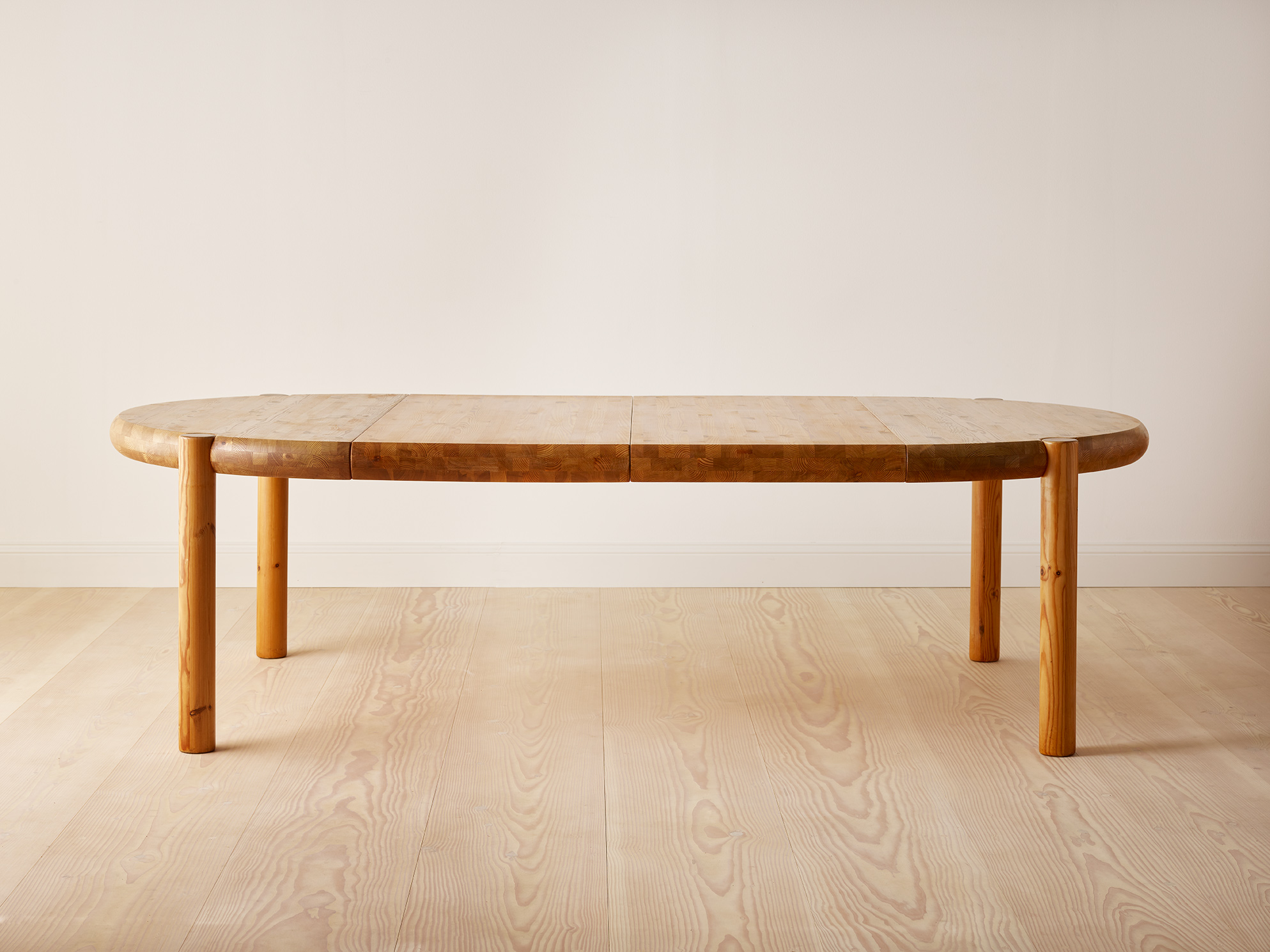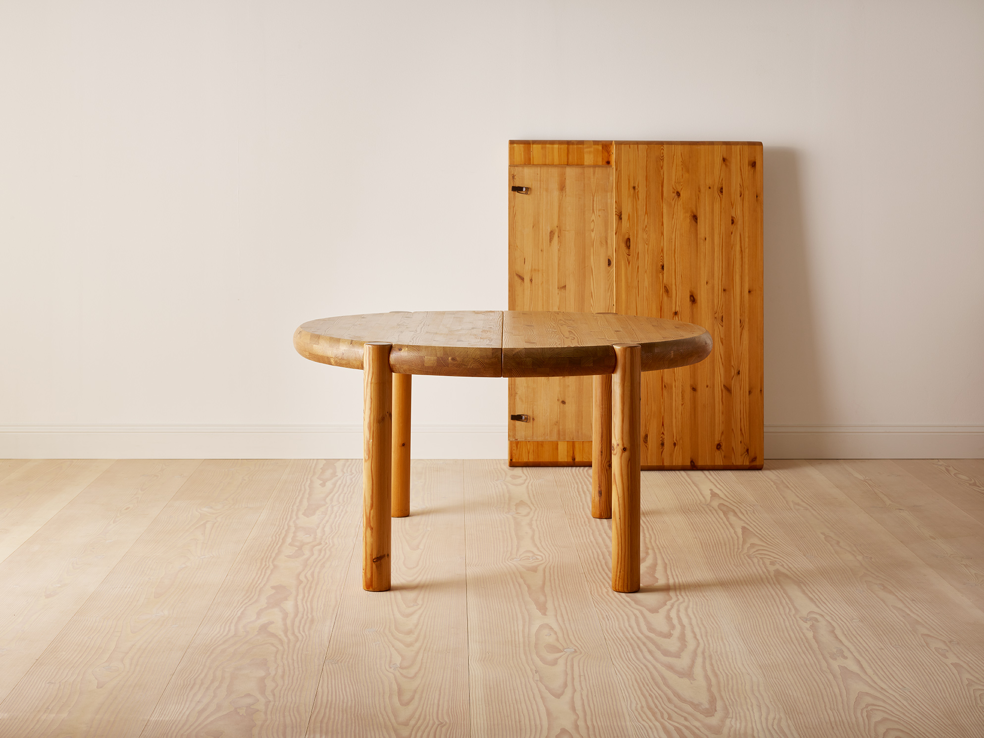 Round pine extending table / dining table with 8 armchairs by Rainer Daumiller for Hirtshals Savværk. Denmark, 1970s. Extendable table with 2 extension leaves measuring 130 cm x 60 cm. 8 chairs with armrests and rounded backrests.