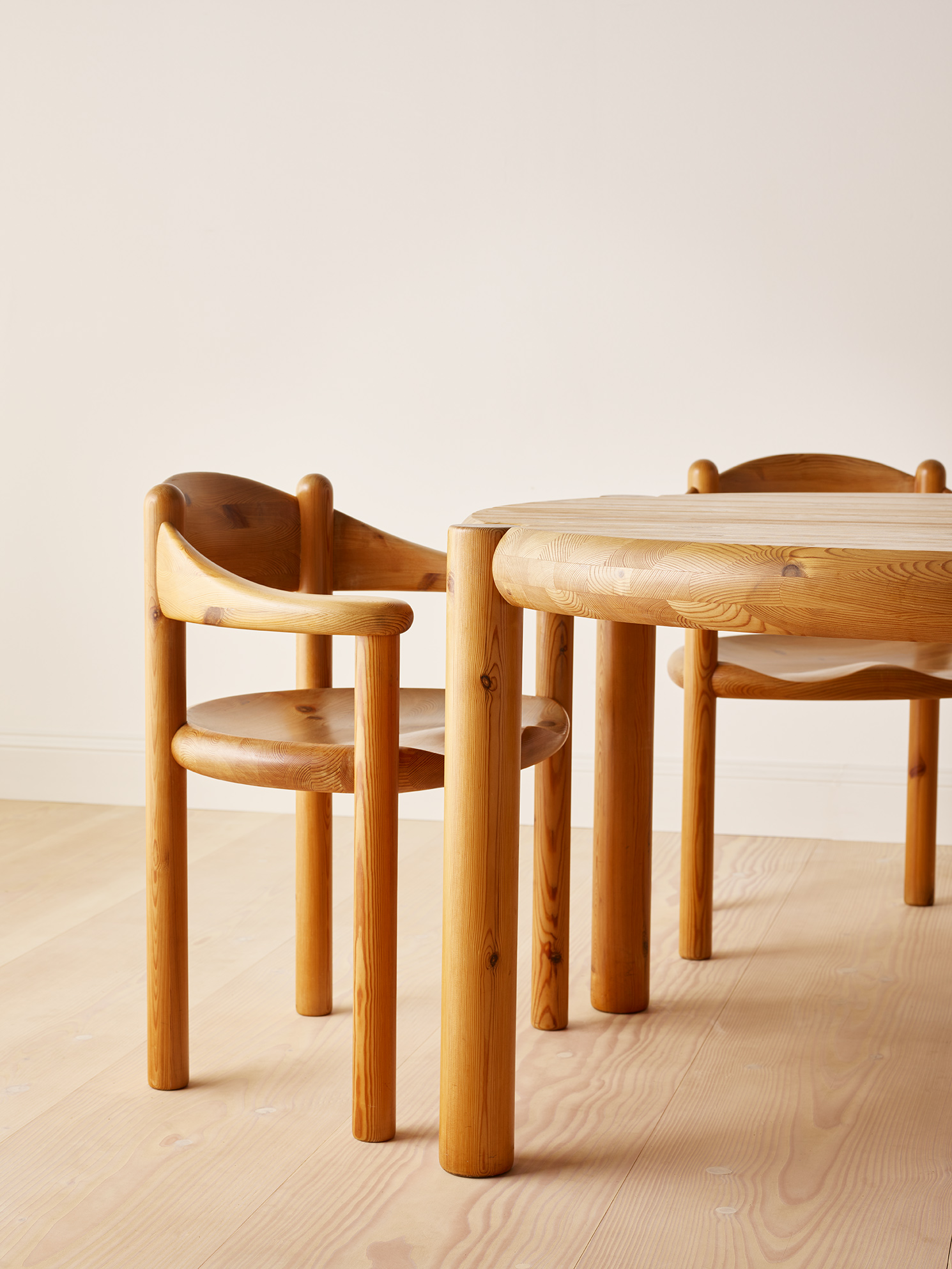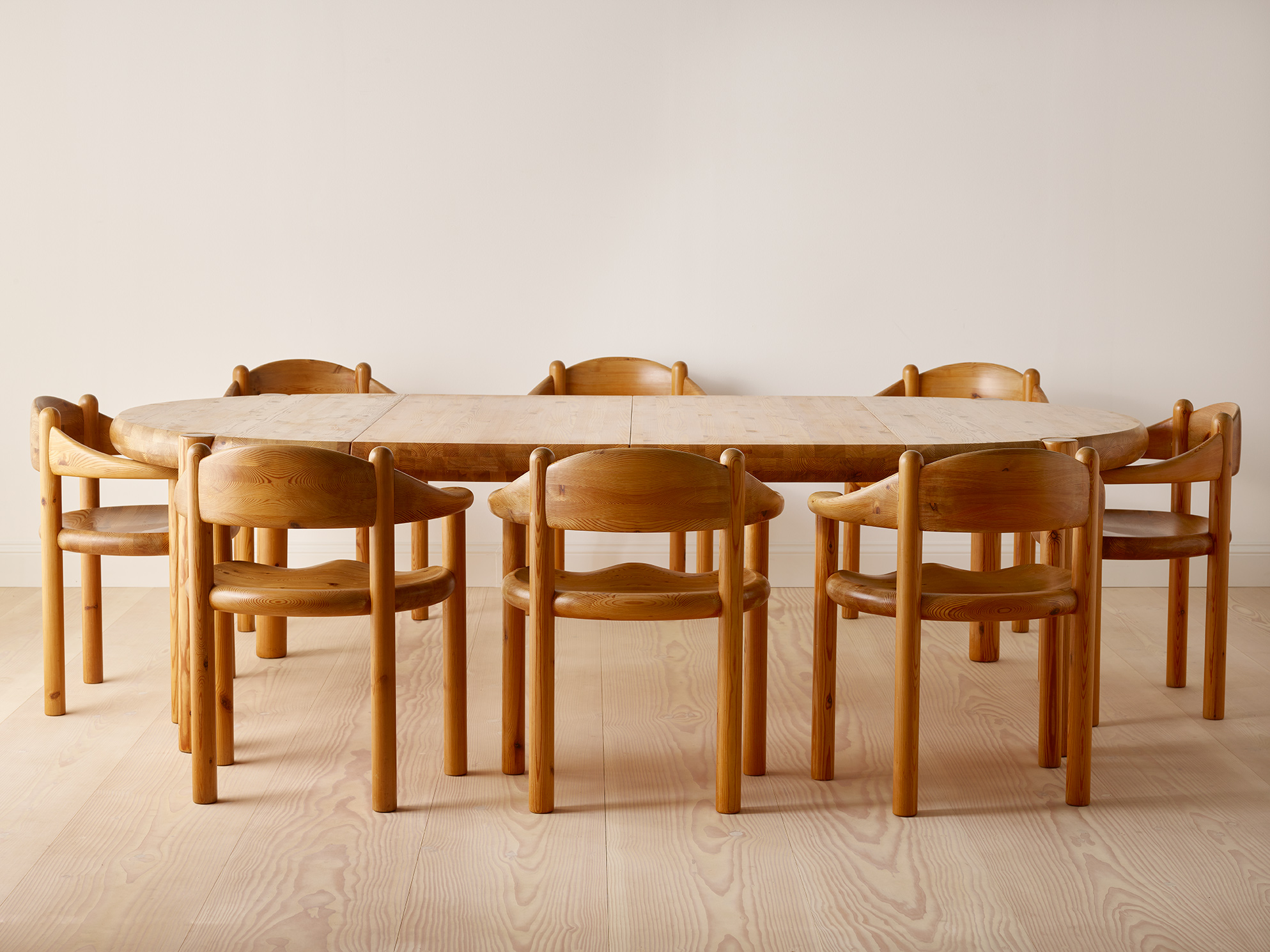 Round pine dining table with eight armchairs by Rainer Daumiller for Hirtshals Savværk. Denmark, 1970s