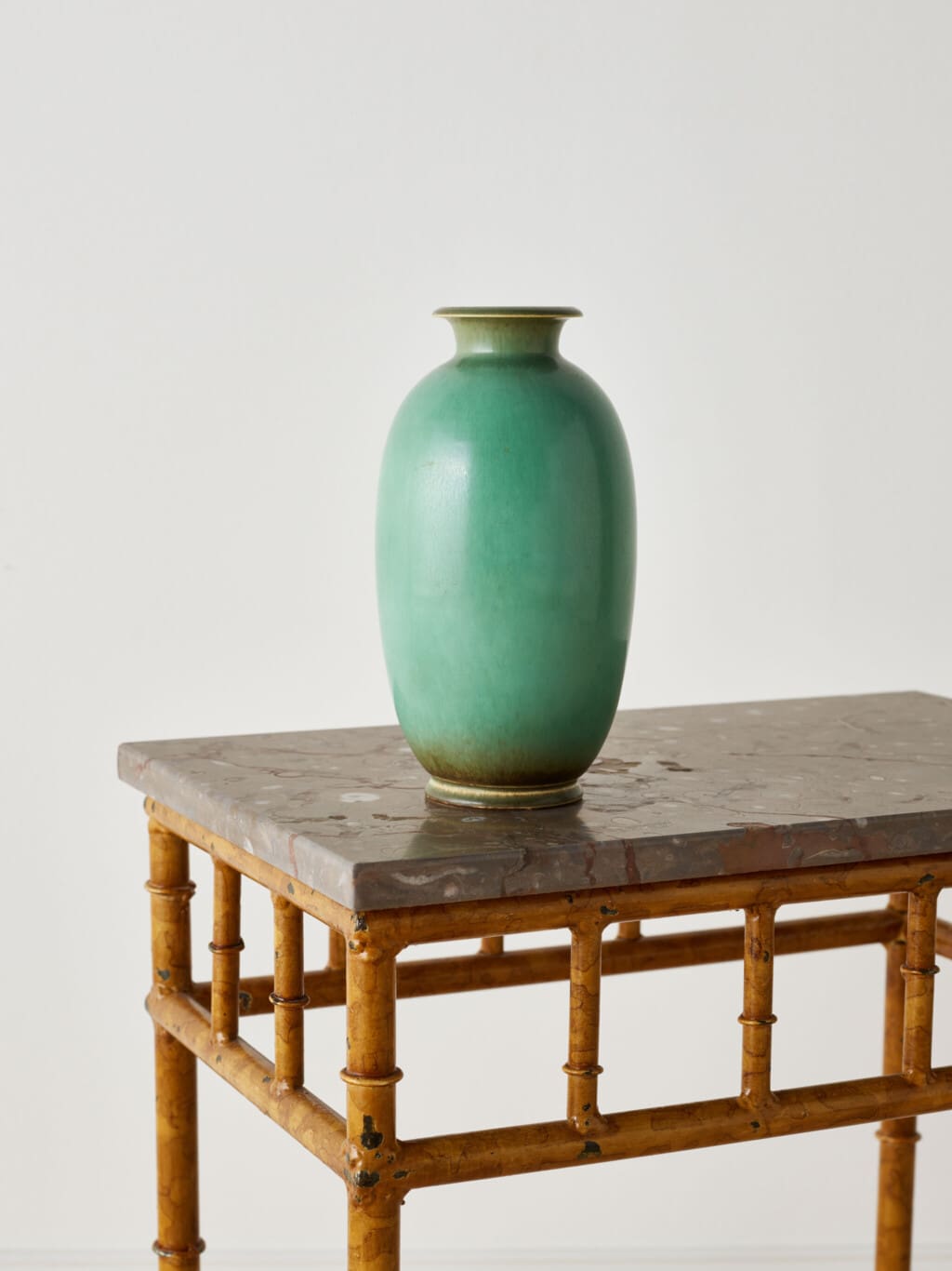 This vintage vase by Sven Wejsfelt for Gustavsberg Studio is a striking piece of Scandinavian ceramic design, crafted from durable stoneware and featuring a unique green hare’s fur glaze that creates a soft, textured appearance. Standing at 21 cm tall, the vase showcases subtle handwork details, embodying the artisanal quality typical of Wejsfelt’s work. It bears both the studio’s mark and the artist’s signature, emphasizing its authenticity and collectible value. This piece would add character to any space, blending form and function beautifully.