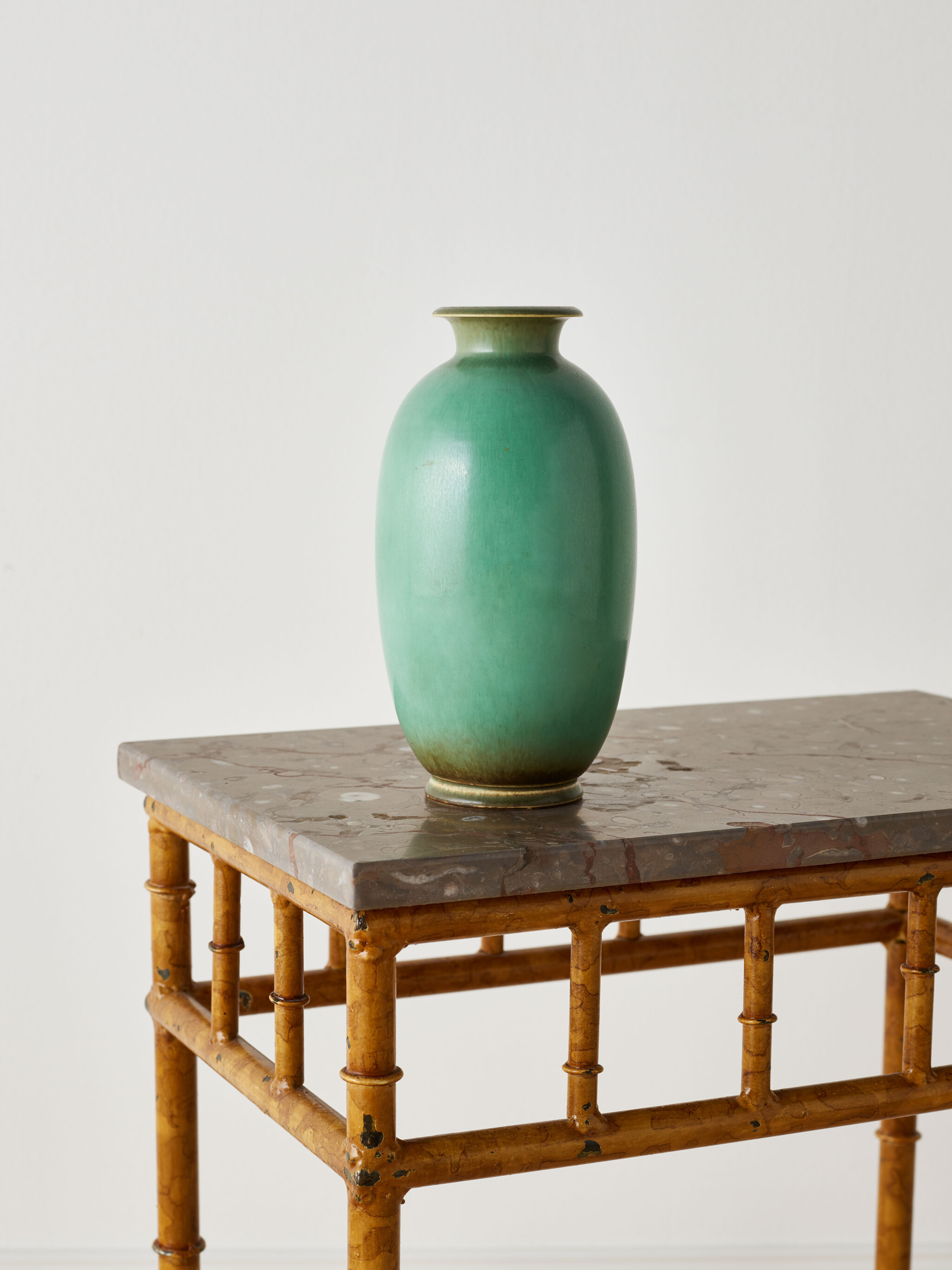 This vintage vase by Sven Wejsfelt for Gustavsberg Studio is a striking piece of Scandinavian ceramic design, crafted from durable stoneware and featuring a unique green hare’s fur glaze that creates a soft, textured appearance. Standing at 21 cm tall, the vase showcases subtle handwork details, embodying the artisanal quality typical of Wejsfelt’s work. It bears both the studio’s mark and the artist’s signature, emphasizing its authenticity and collectible value. This piece would add character to any space, blending form and function beautifully.