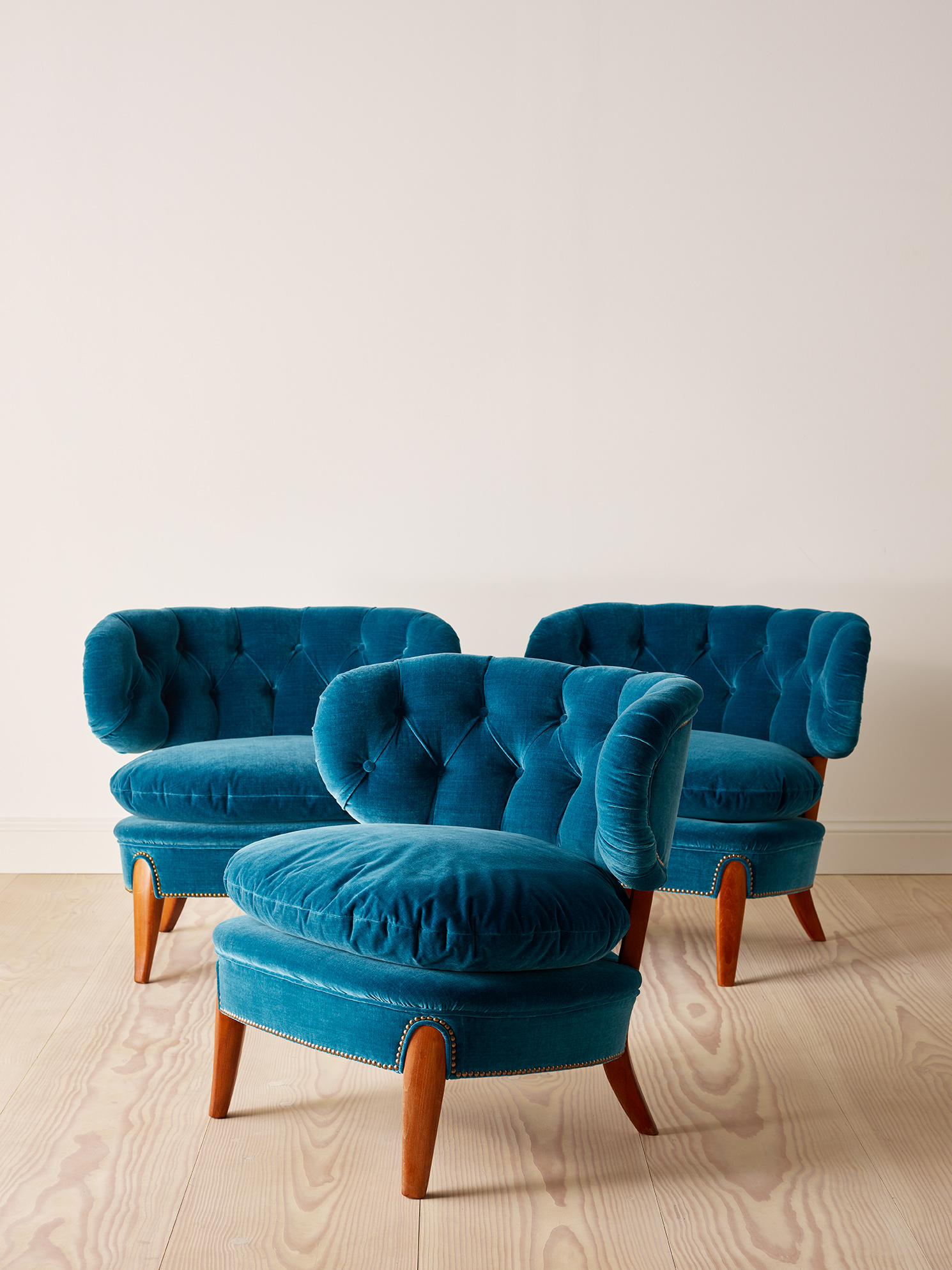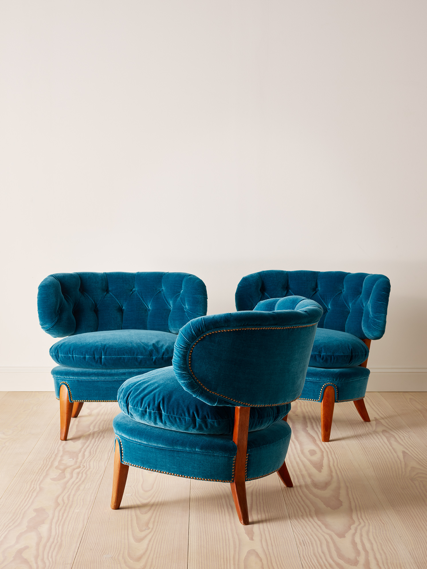 Three Otto Schulz lounge chairs in turqouise velvet, Sweden 1940’s