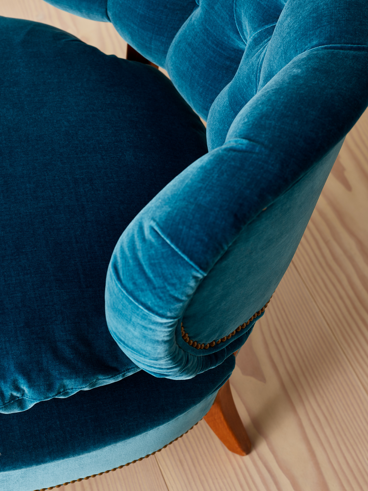 A set of three beautiful lounge chairs by Swedish-German designer Otto Schulz for the furniture company Boet in Gothenburg, Sweden in the 1940s. The chairs have been reupholstered in turquoise (blue) velvet. The wooden legs are made from stained beech tree in a reddish-brown nuance (måste verifieras IRL). This chair is a modern design classic, very striking to look at as well as extremely comfortable to sit in.