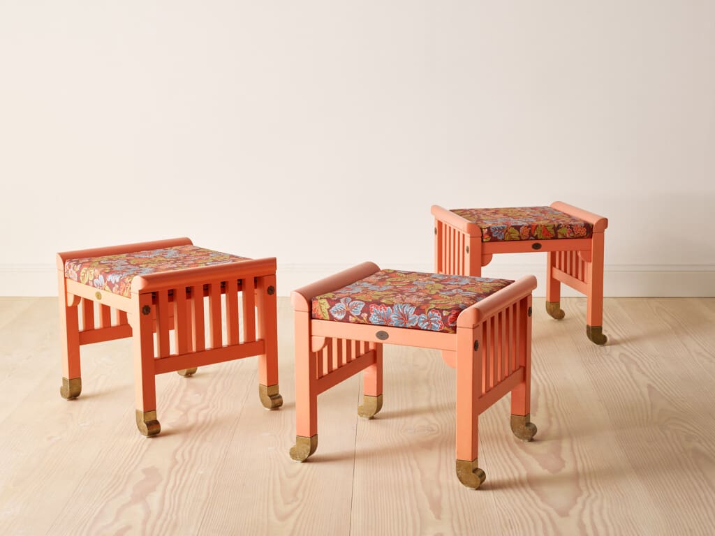 Three peach-colored stools with cushions from “The Eden Collection” by Swedish designer Kerstin Hörlin-Holmquist