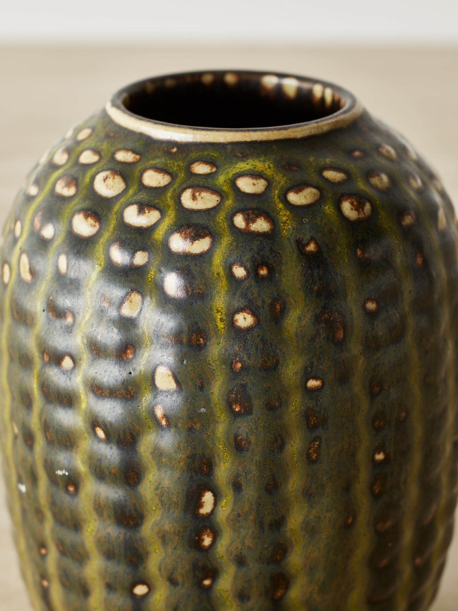 Salto was initially trained as a painter, but he shifted his focus to ceramics in the 1920s, where he became famous for his innovative glazing techniques and organic forms. His work is characterized by elegant, flowing lines, intricate textures, and a refined sense of balance. He often drew inspiration from nature, and his ceramic pieces feature abstract interpretations of plant forms, landscapes, and natural textures.
