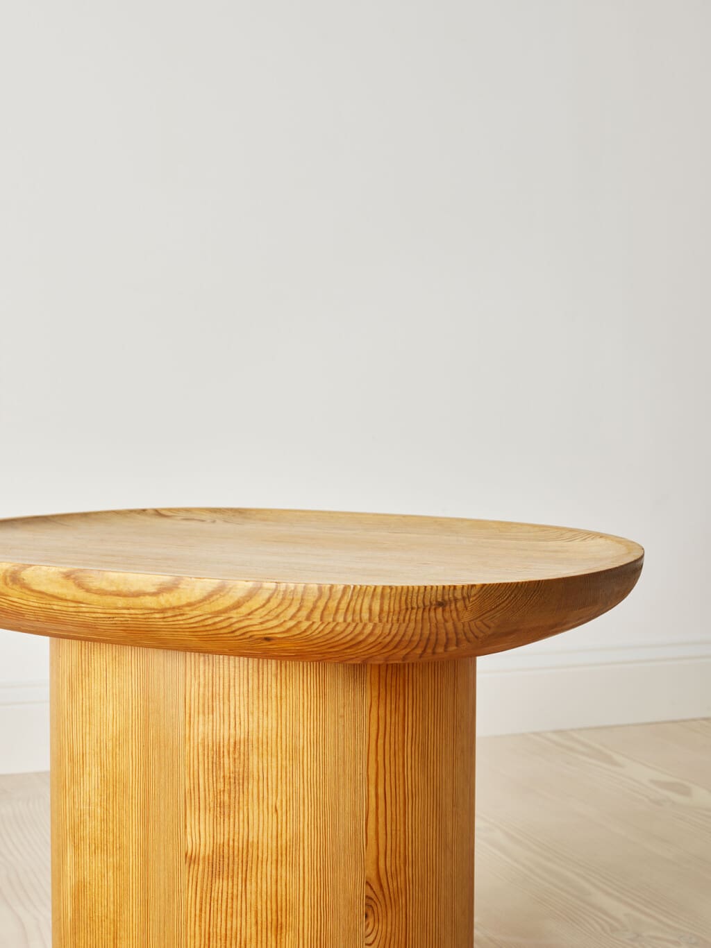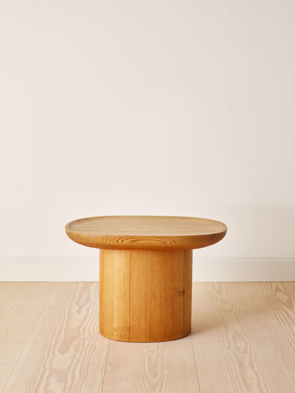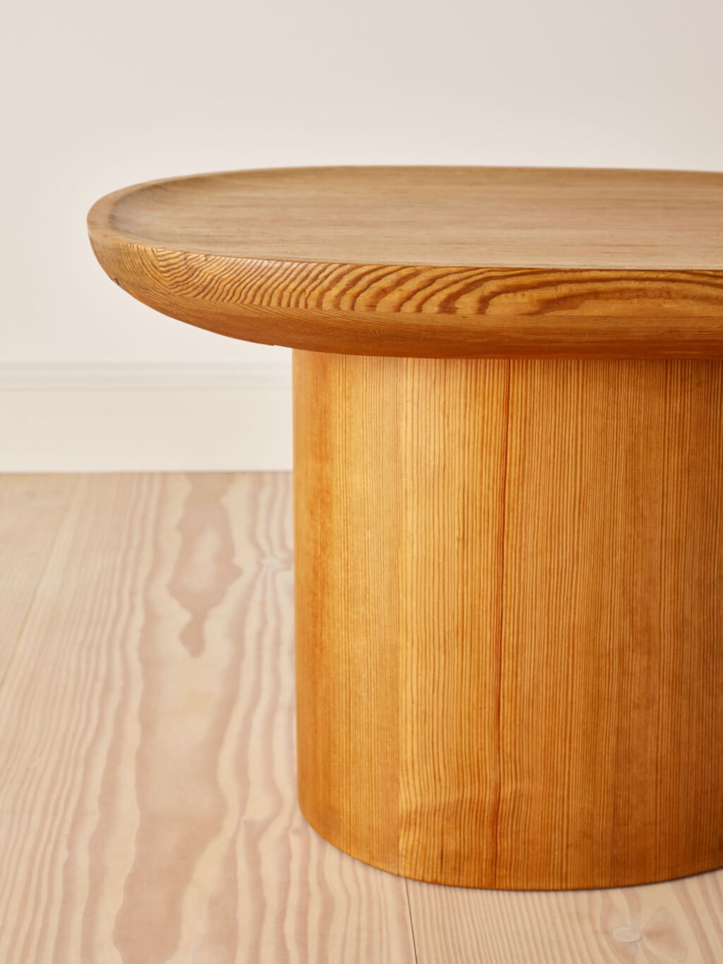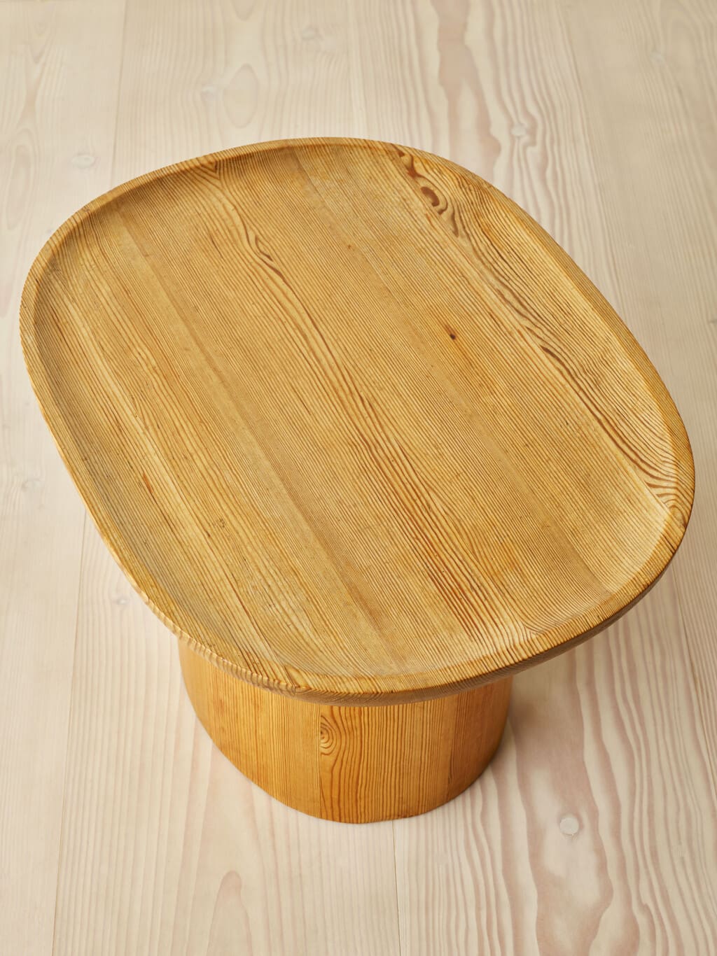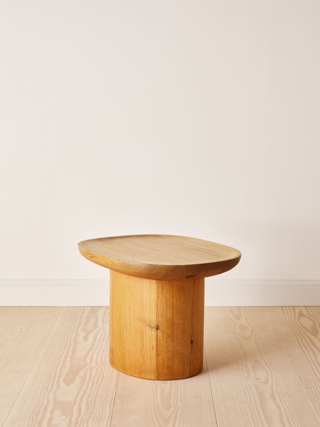 A stained pine wood side table from the “Utö” furniture series which was designed by Swedish designer Axel Einar Hjorth in 1932 for Nordiska Kompaniet (NK) in Stockholm. After 1930 the Hjorth-NK collaboration were fully occupied with launching furniture in the spirit of neofunctionalism. The “Utö” series is shown for the first time in May 1932 at NK’s recurring spring exhibition. Like its predecessor Sandhamn, Hjorth also draws inspiration from Swedish folk furniture in the “Utö” and “Lovö” lines. These are great examples of powerful and sculptural furniture with large proportions; however, the design is now clearly influenced by the prevailing modernism. The shapes are geometric and the curves and lines are more defined. Just like “Sandhamn” series, the “Utö” series are named after islands in the Stockholm archipelago. Sometimes this model with its thick base and concave top is referred to as the Brancusi table, although this is not an officially sanctioned name.